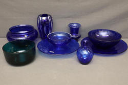 Villeroy & Boch and Mikasa Blue Glassware Pieces, featuring a variety of bowls, plates, vases, and decorative pieces in deep blue and green tones. Items are crafted with textured and smooth finishes. Pickup only.