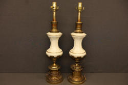 Brass and Ceramic Table Lamps with White Accents. Featuring an elegant brass base and body, accented with white ceramic components. Each lamp is equipped with wiring and a functional switch on the cord. No shades included. Suitable for indoor use. Pickup only.