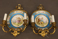 Porcelain and Gilt Bronze Candelabra Plates with Romantic Scenes. Features two hand-painted porcelain plates with blue borders, floral detailing, and romantic pastoral scenes. Each plate is mounted in an ornate gilt bronze frame with a decorative ribbon and two-arm candle holders. Markings on the reverse as shown. Pickup only.