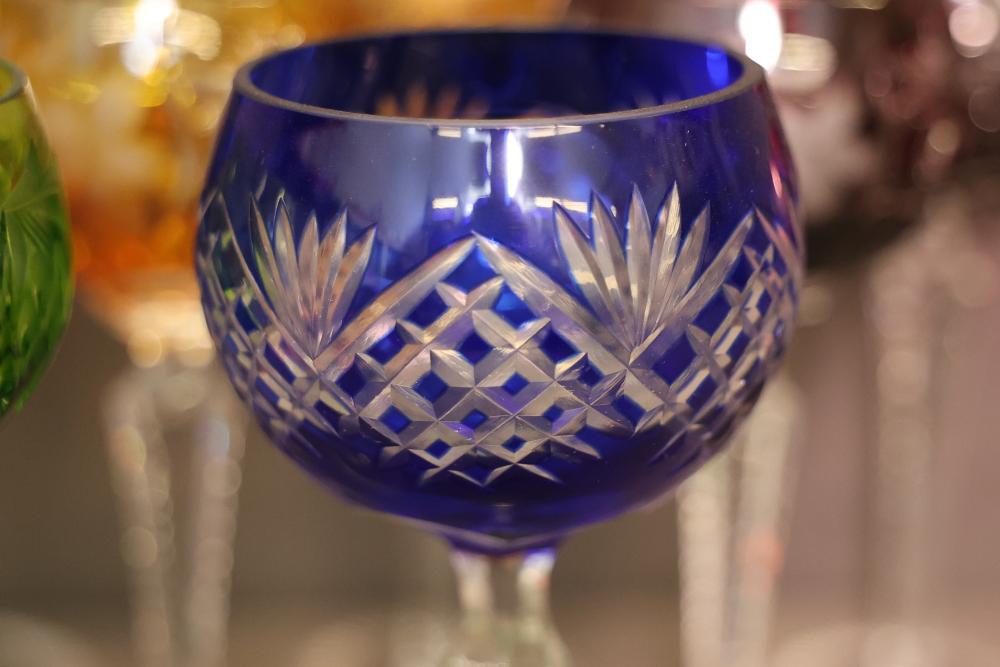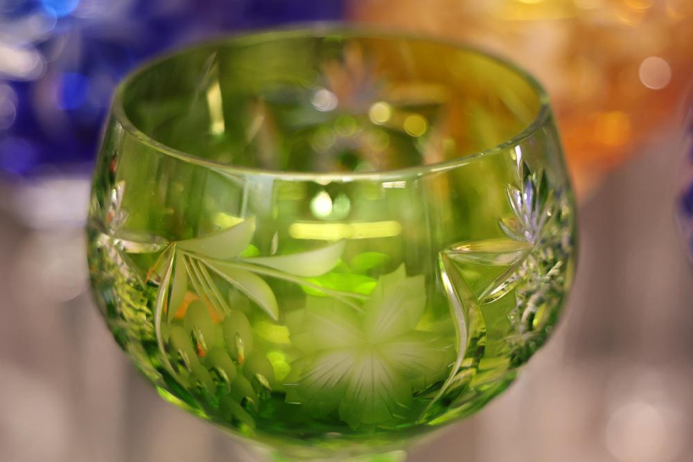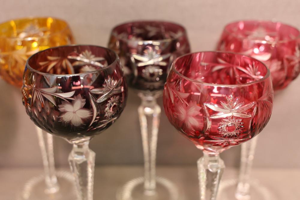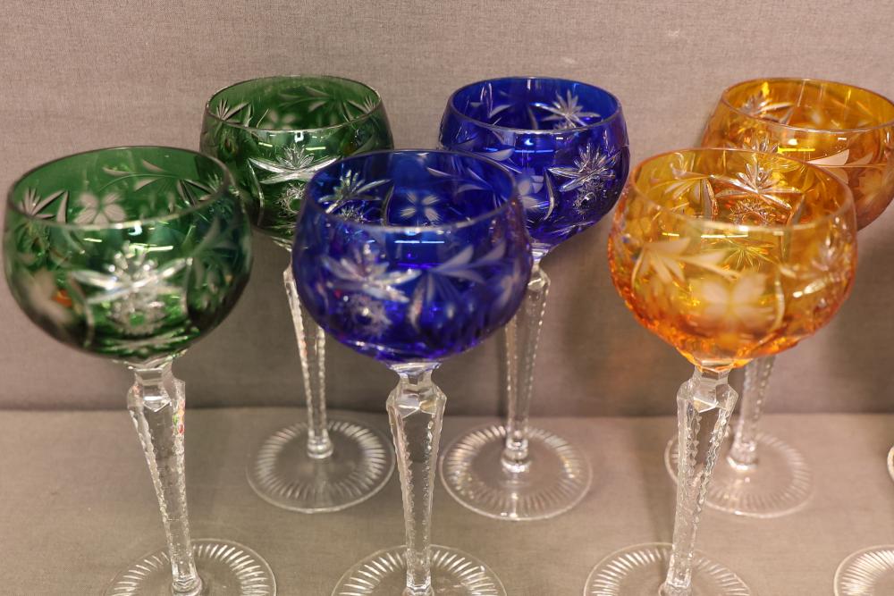 12 Multi-Colored Cut Crystal Wine Glasses. This set includes wine glasses in an assortment of vibrant colors such as green, blue, yellow, purple, and red. Each glass features intricate cut designs and rests on a clear stem. Pickup only.