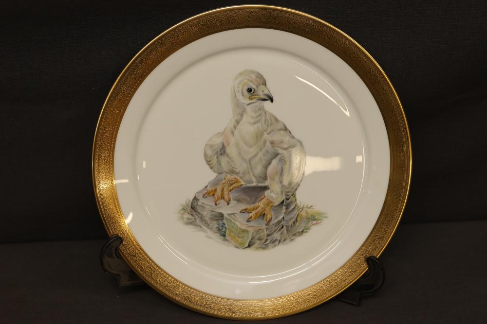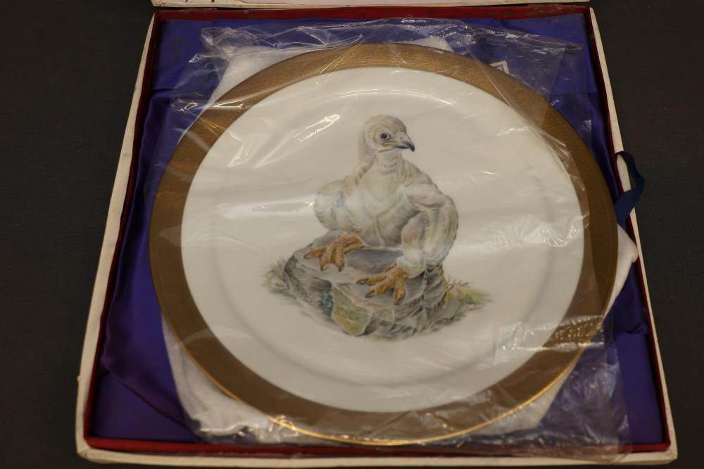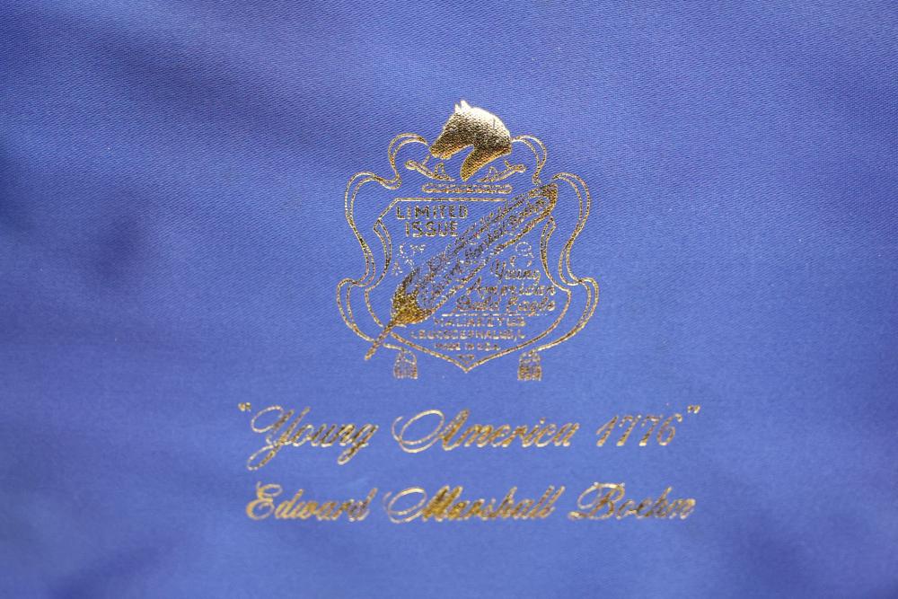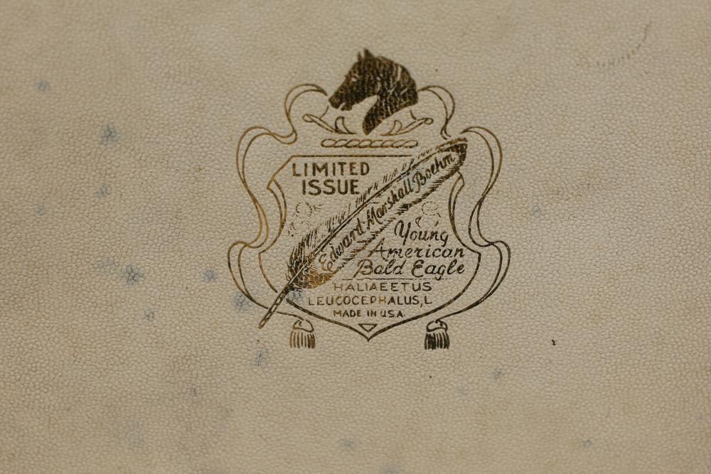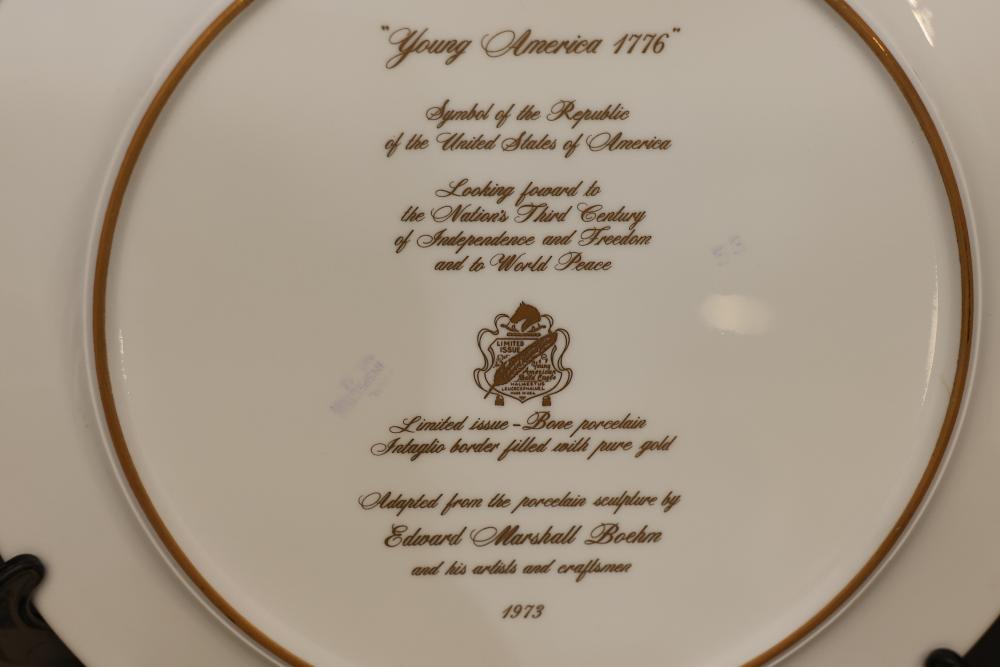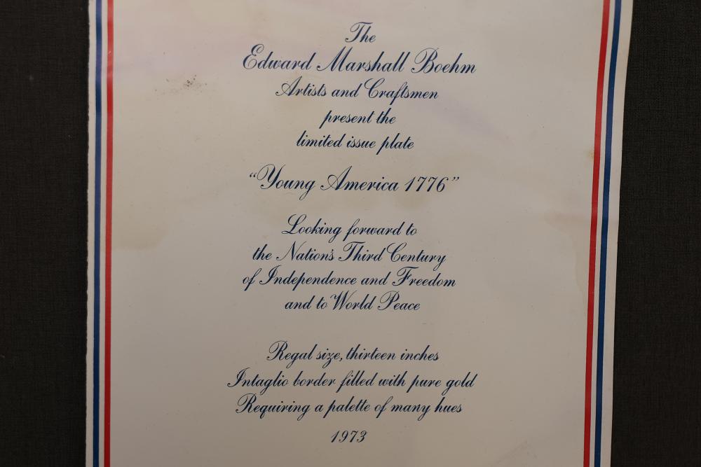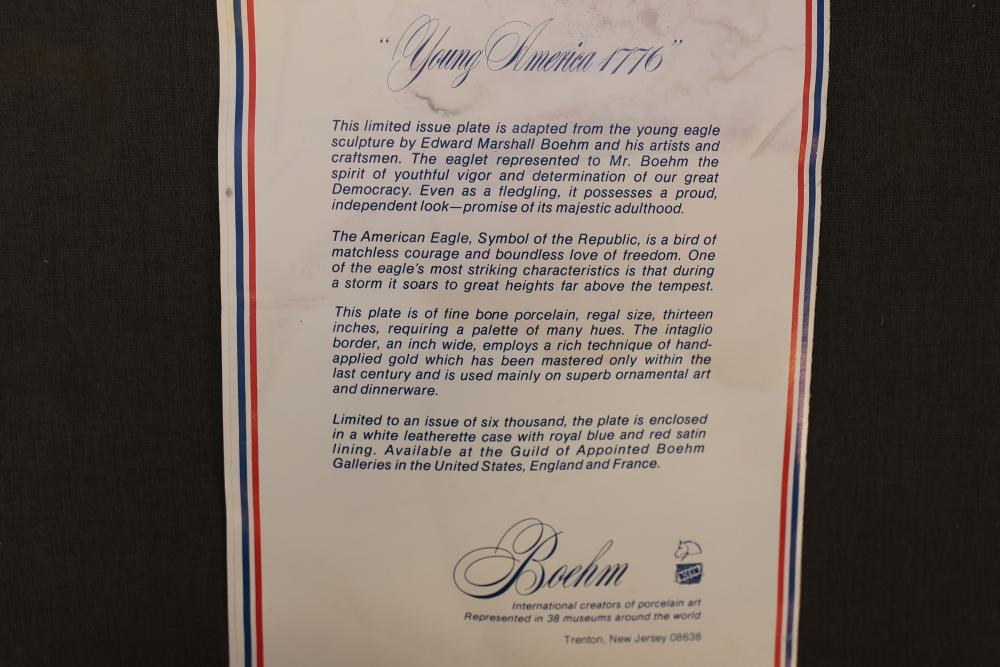 Young America 1776 Plate by Edward Marshall Boehm. Limited edition fine porcelain plate featuring a young bald eagle with a detailed gold border. Includes original box, documentation, and protective materials. Created to symbolize the Nation's aspirations of independence and peace. Plate has a 1973 stamped issue date. Pickup only.