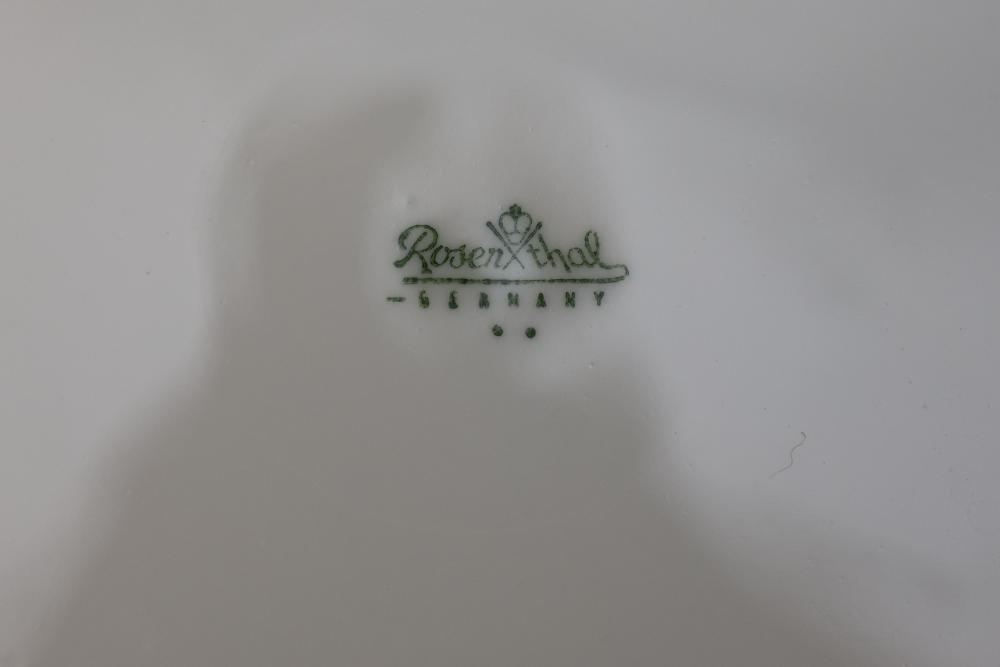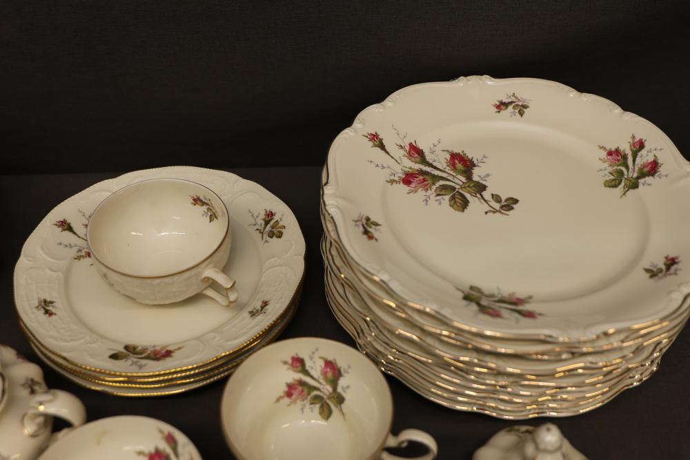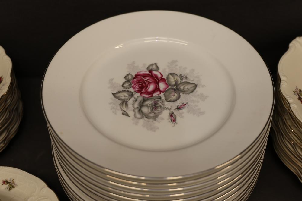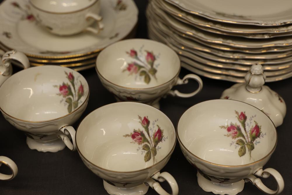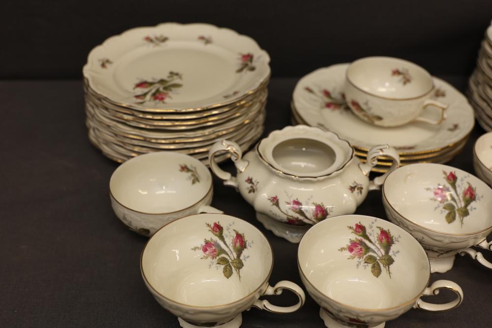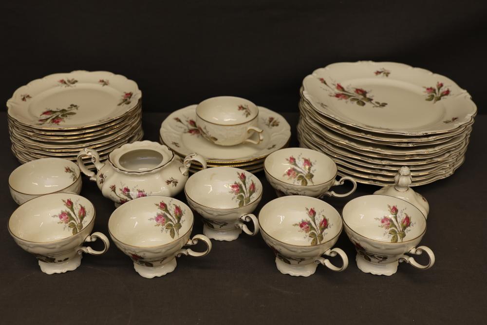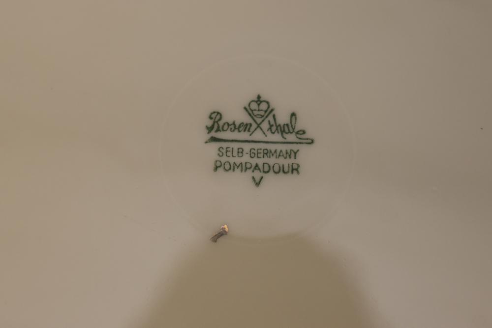Rosenthal Pompadour China Dinnerware Set with Floral Design. Set includes dinner plates, dessert plates, teacups with saucers, a creamer, sugar bowl with lid, and other coordinated pieces. Each item features floral patterns accented with gold trim. All pieces display the Rosenthal mark on the underside. Pickup only.