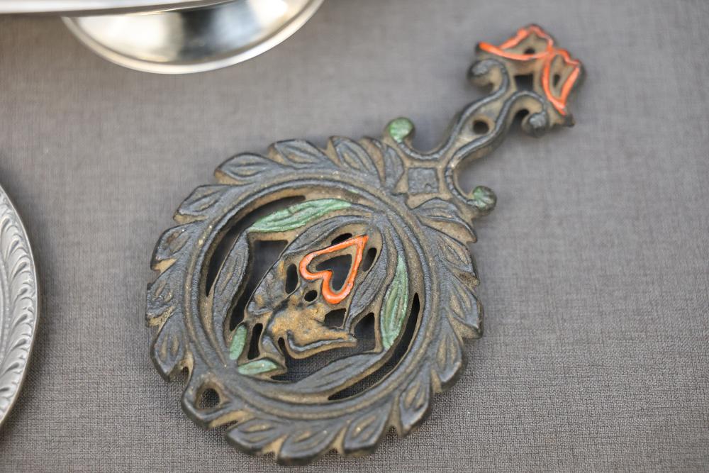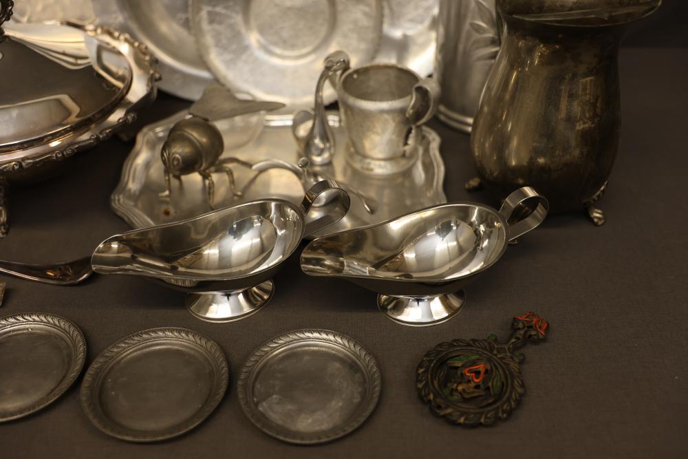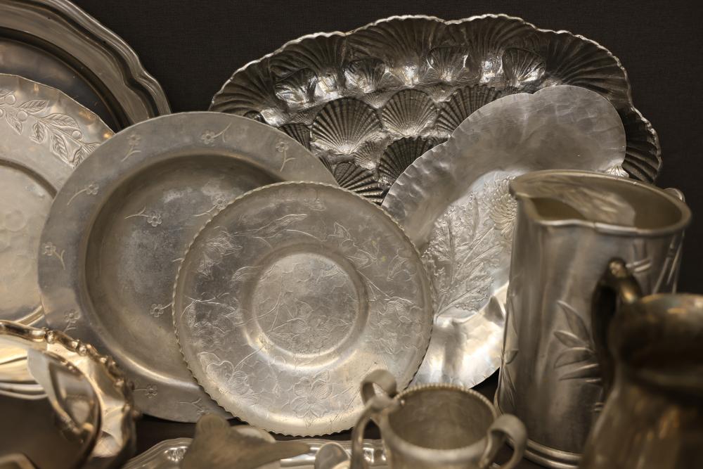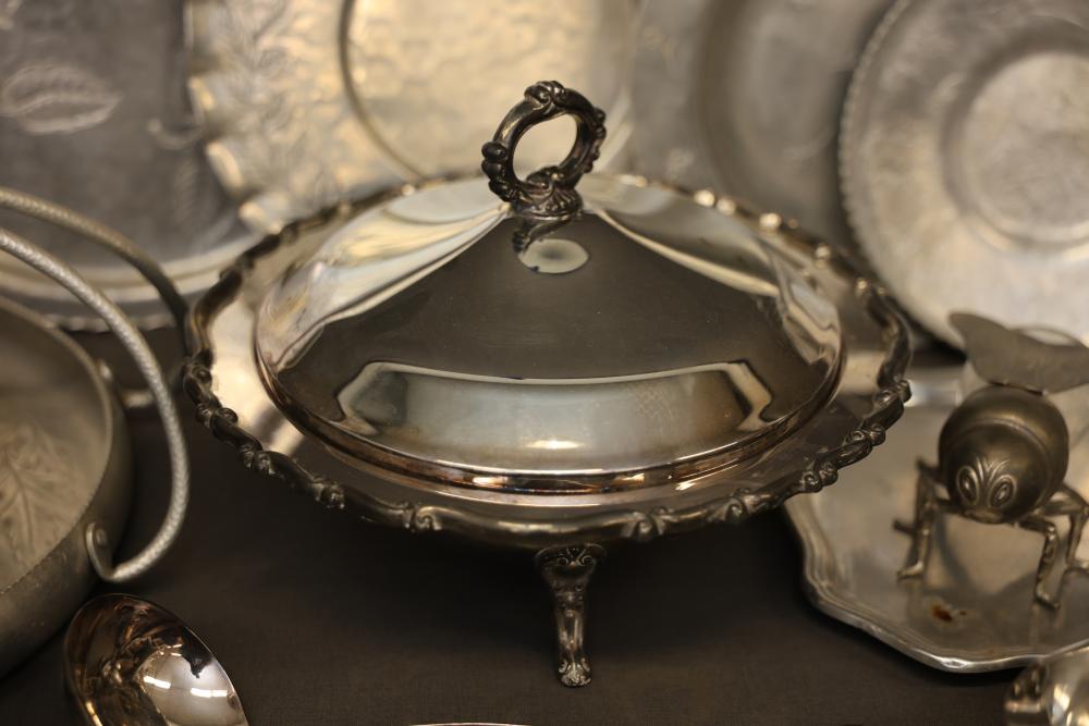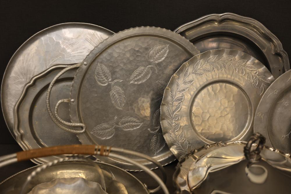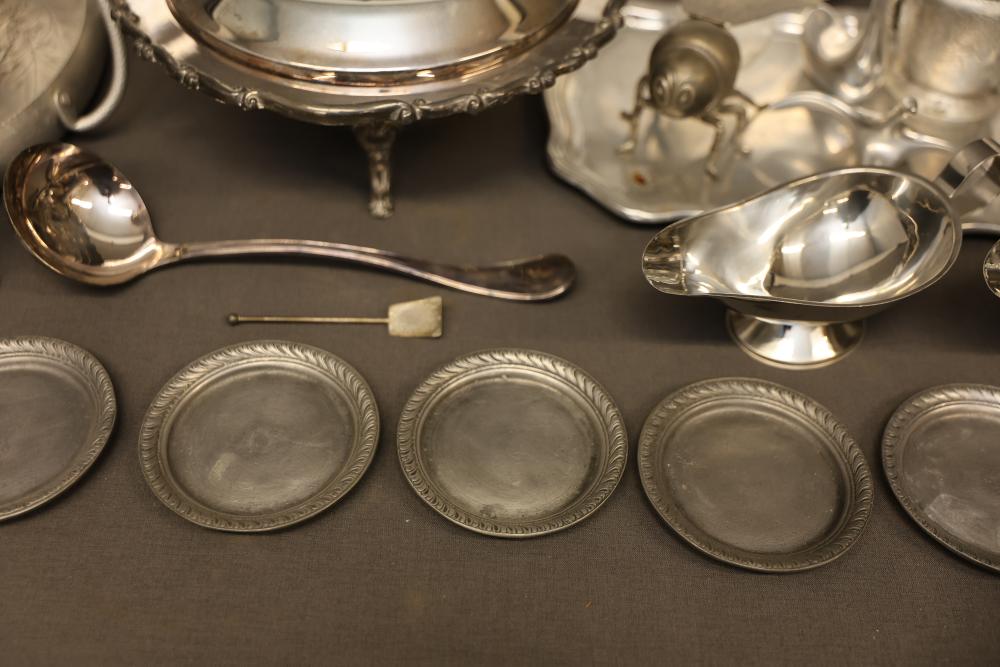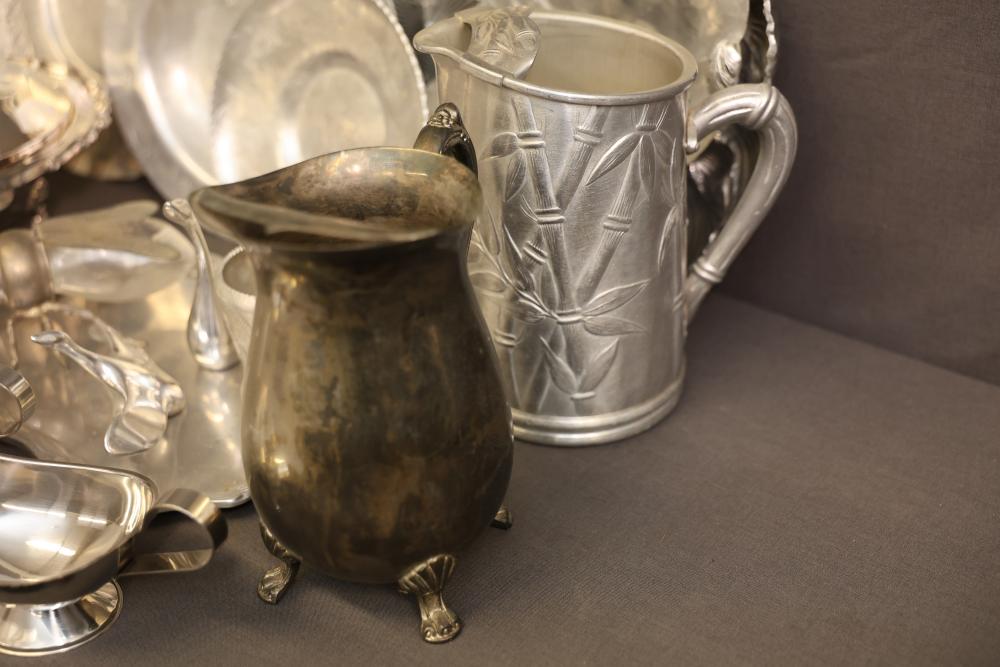 Decorative Metalware Including Rogers Silver and Farberware. This includes trays, pitchers, plates, serving bowls, and various decorative miniatures. The pieces showcase a mix of engraved and embossed details with various maker's marks, including Rogers Silver, Farberware, and additional stamped pieces. Sold as photographed. Pickup only.