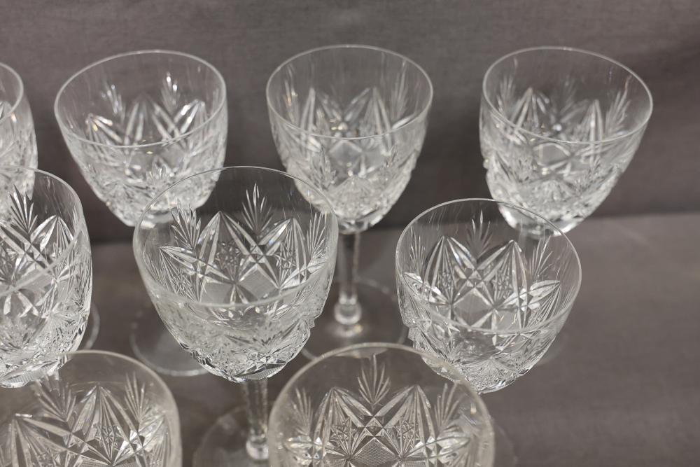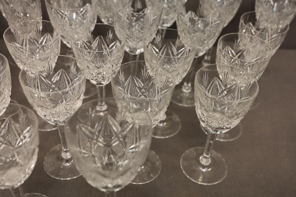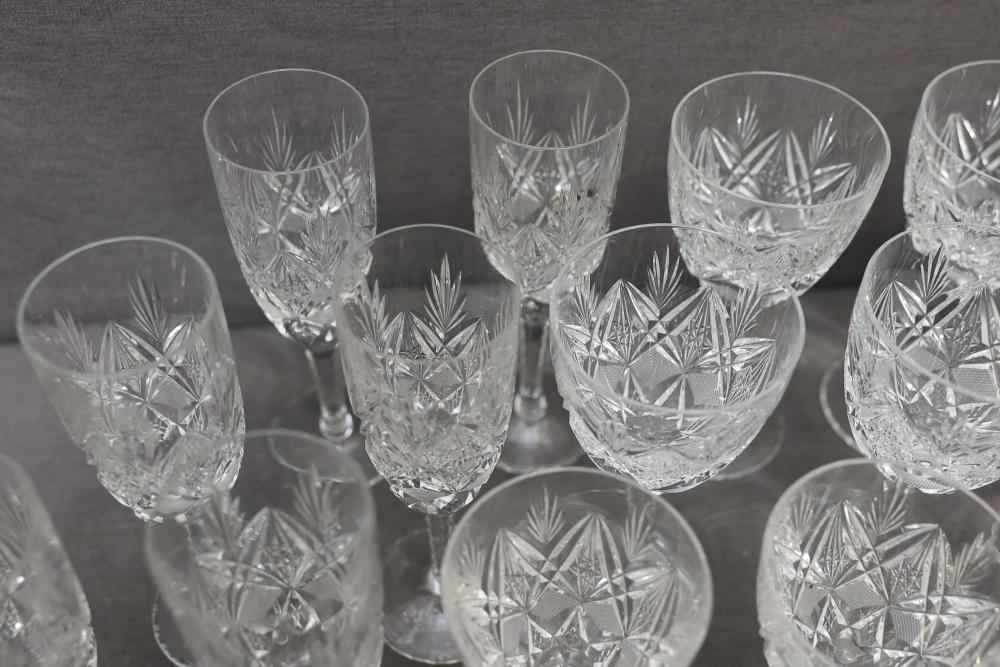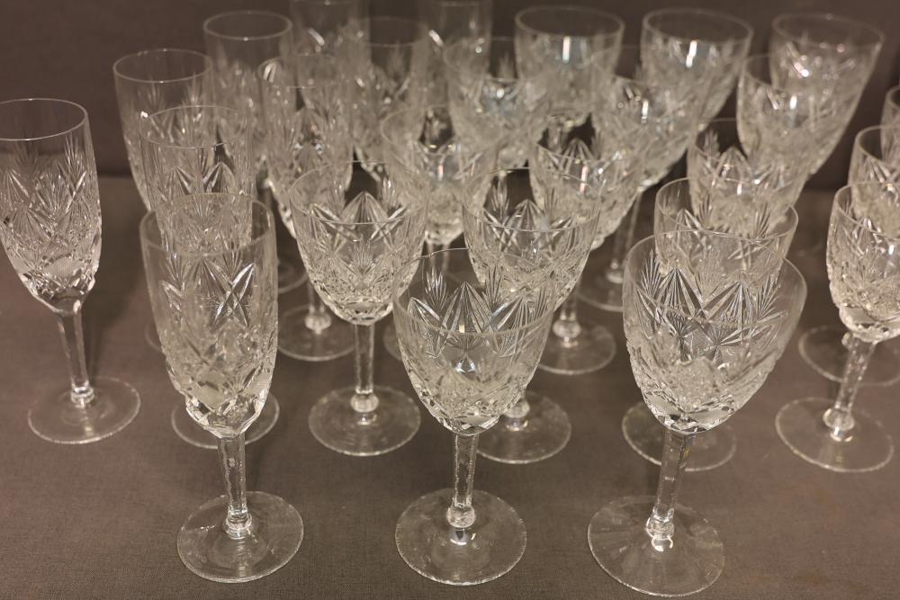 Crystal glass stemware including wine and champagne glasses. Features a matching design with intricate cuts. Includes a variety of sizes and styles suited for different types of beverages. Pickup only.