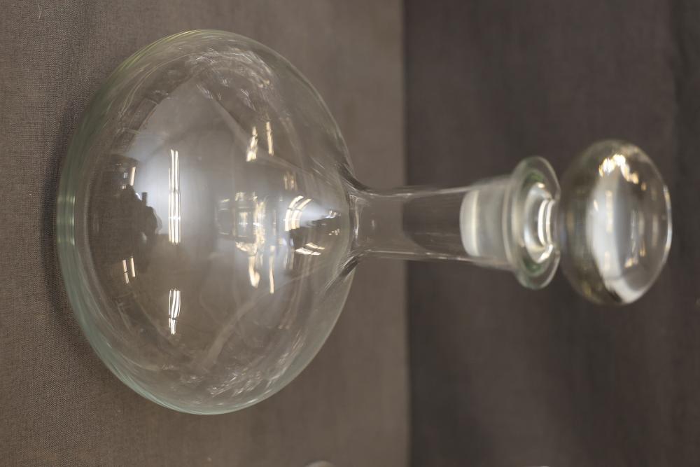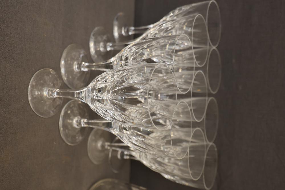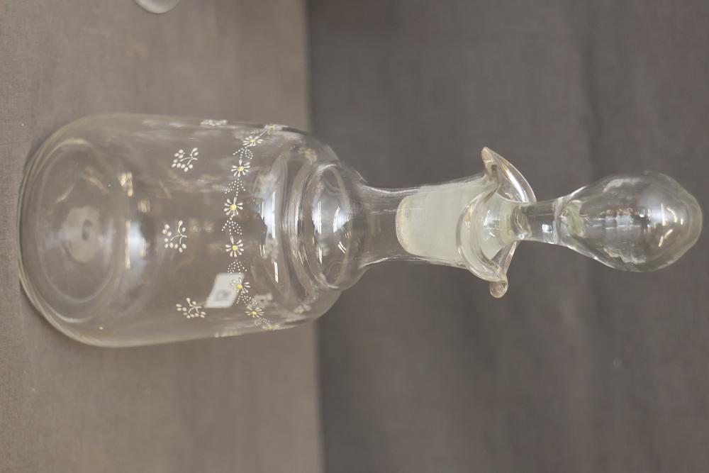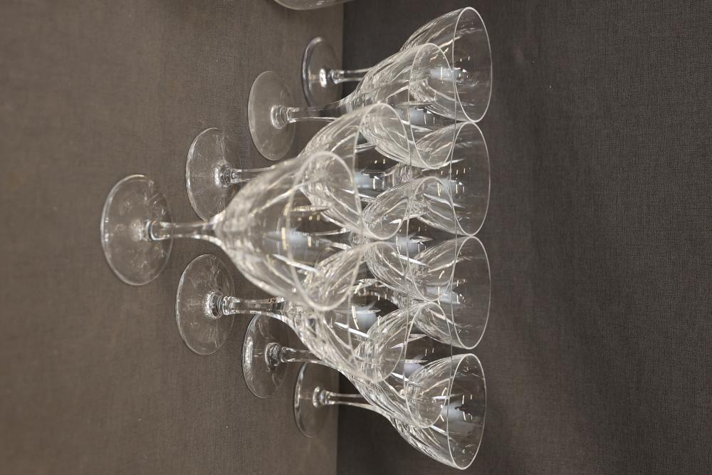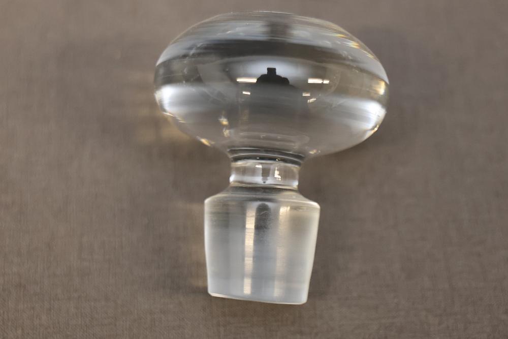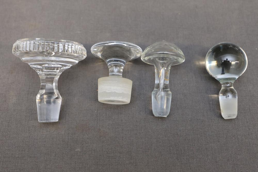 Crystal Stemware and Decanter Set with Stoppers. Includes a group of crystal stemmed glasses, a decanter with etched floral designs, additional decanters, and several glass stoppers in various designs. Pickup only.