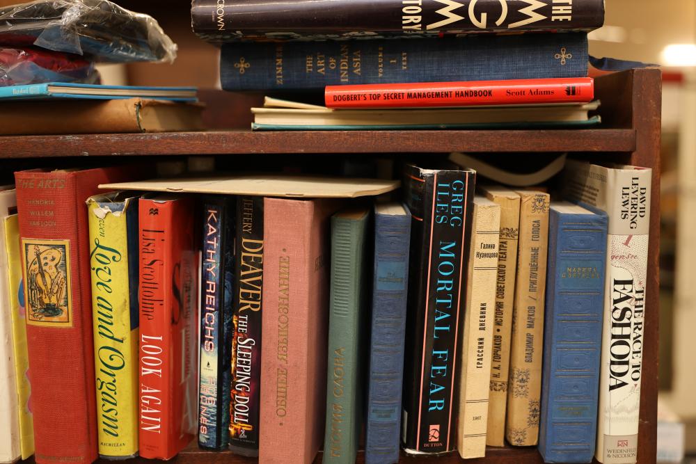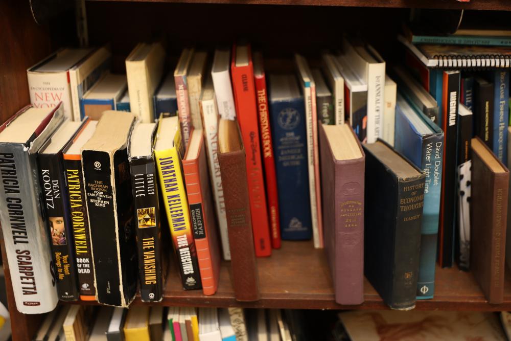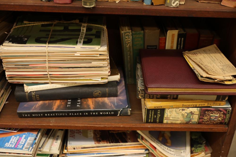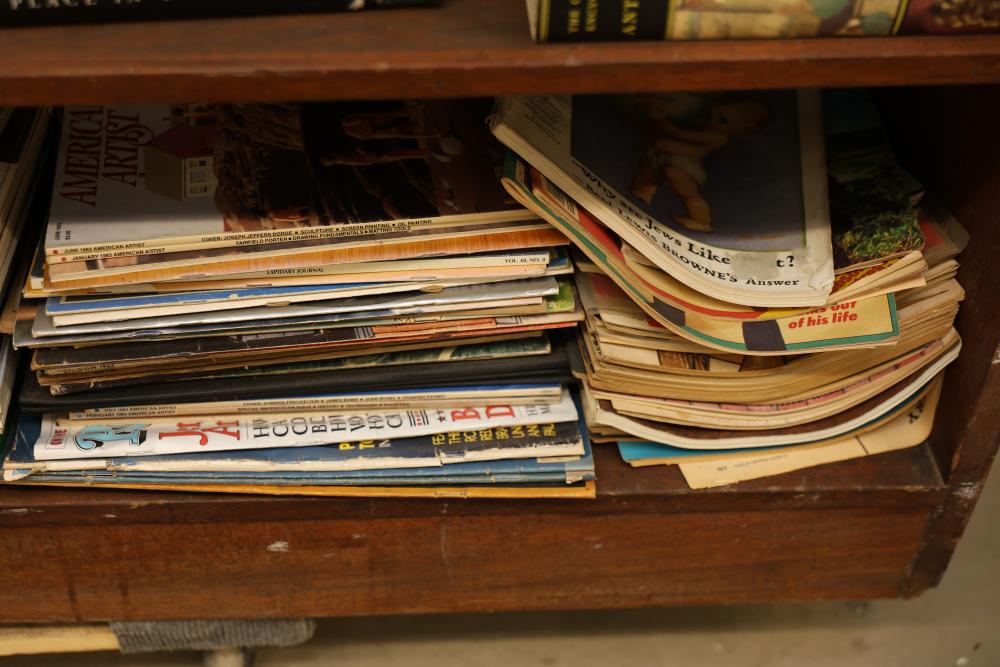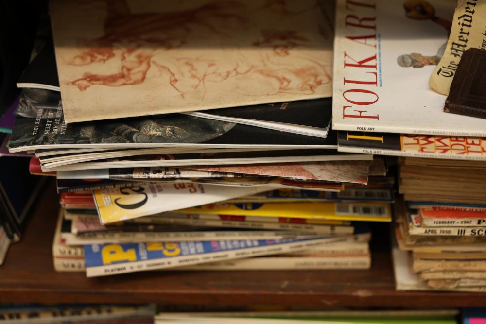 Books and Magazines Featuring Topics Including Art, Mystery, History, Architecture, and Fitness. A mix of hardcovers, paperbacks, and bound periodicals displayed on shelves. Includes titles from various genres and subjects, featuring fiction, non-fiction, and specialized topics. Pickup only.