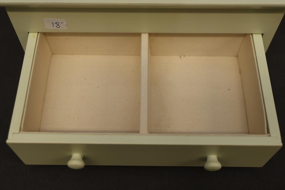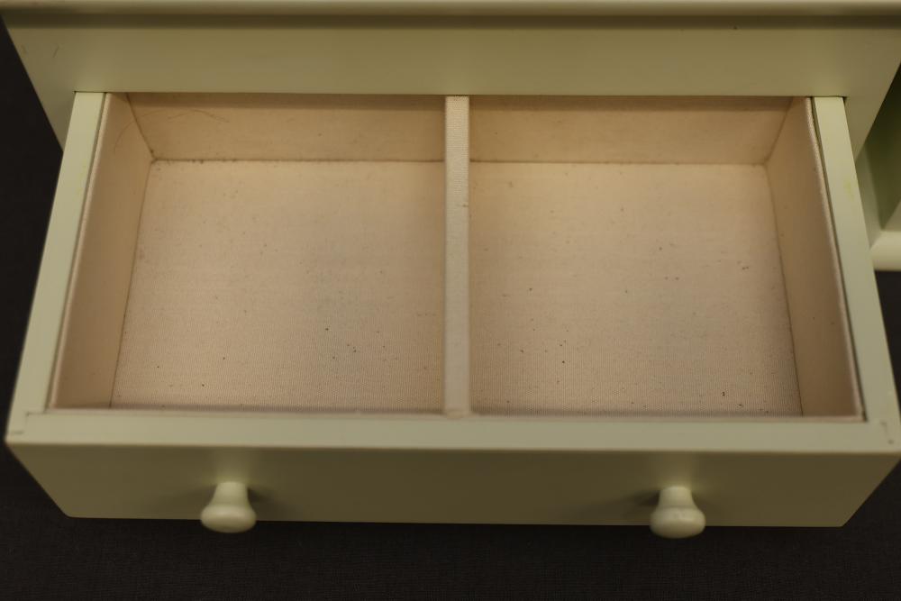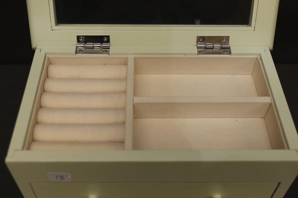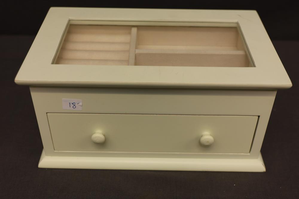 Wooden Jewelry Boxes With Glass-Top Lids and Drawers. Each box has a hinged glass top for viewing its contents and includes divided compartments designed for organizing items. The interior of the top section has space for small items and rings, with cushioning provided for the latter. Below the top section is a pull-out drawer with additional divided space. Pickup only.