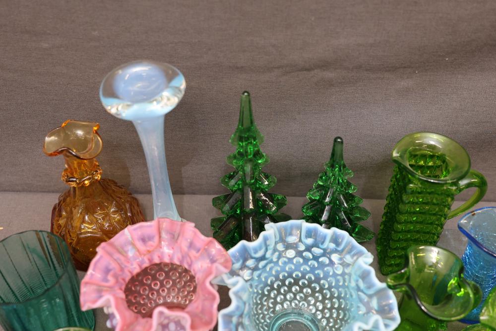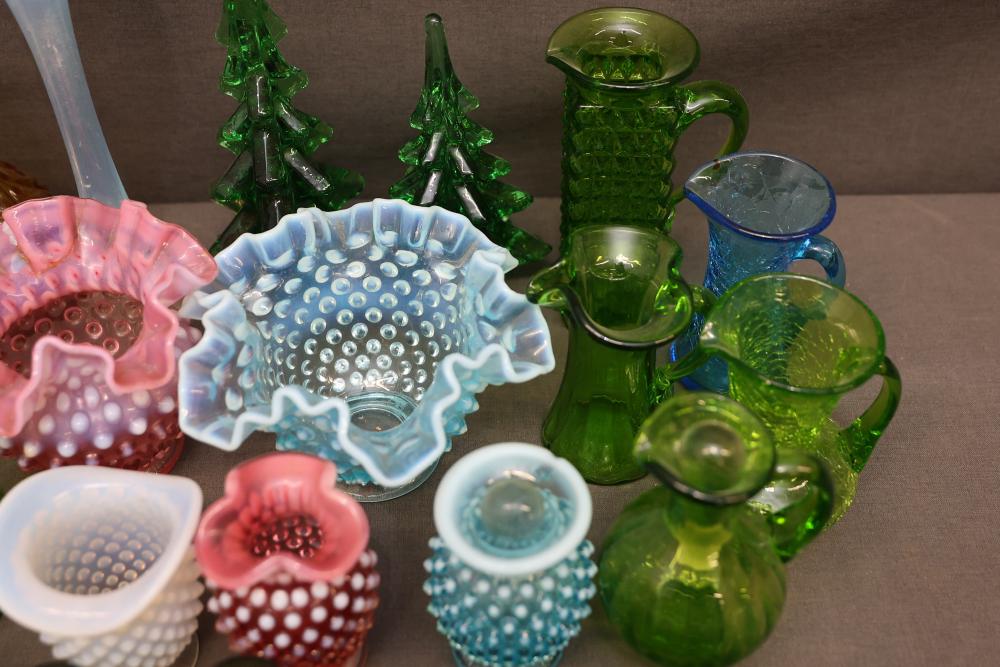Glass and Ceramic Decorative Items. Includes multiple glass decorative items in various styles, colors, and shapes, as well as a ceramic shell-shaped pitcher marked on the bottom 'Royal Bayreuth Bavaria.' Items feature hobnail textures and vibrant colors, including green, pink, and blue. Pickup only.