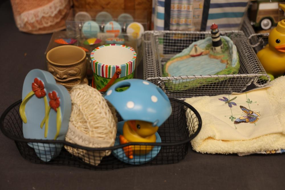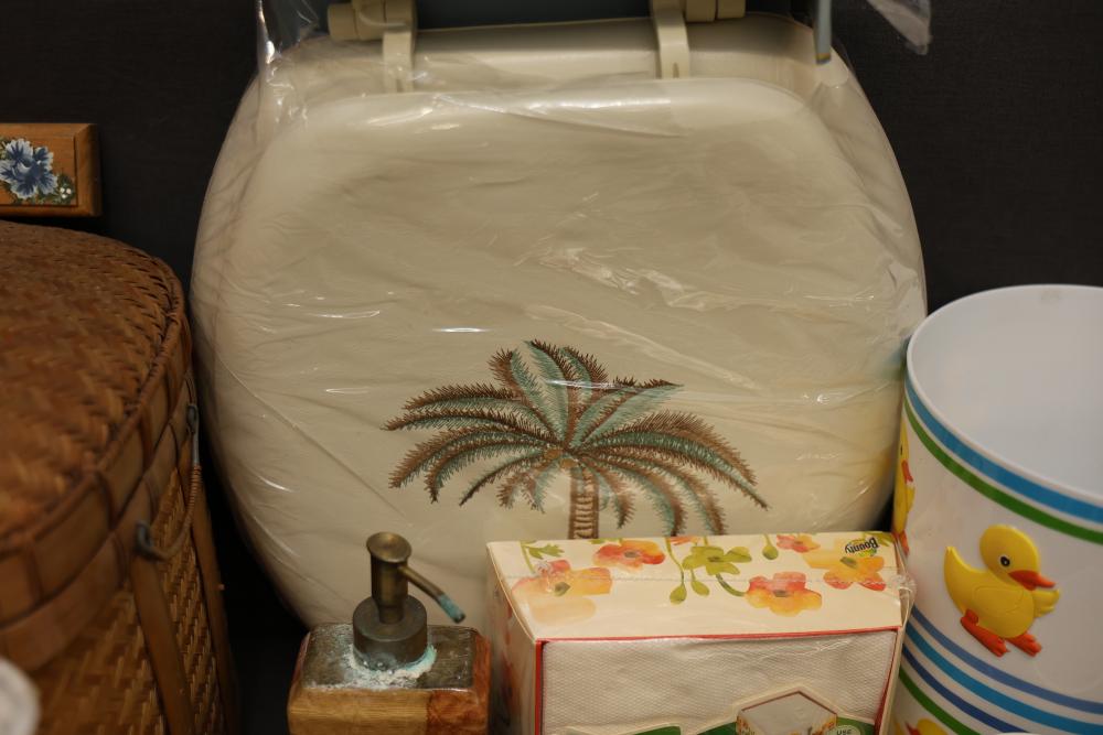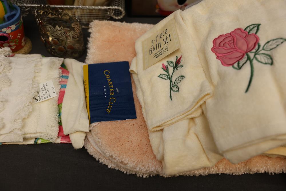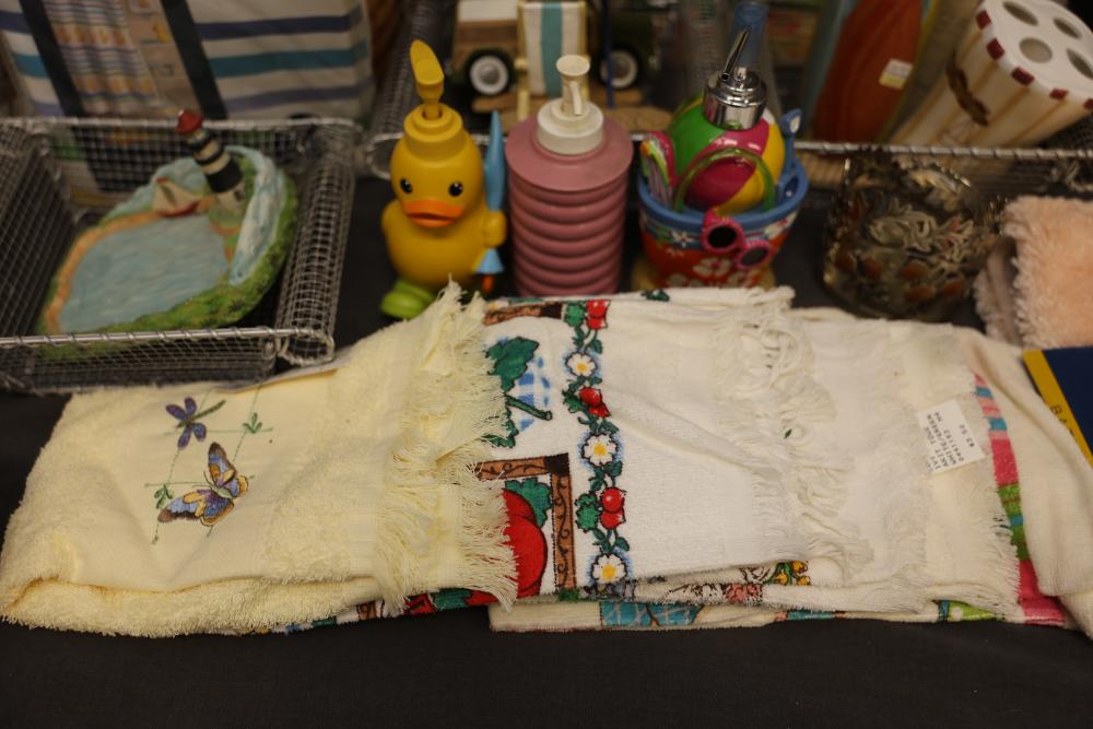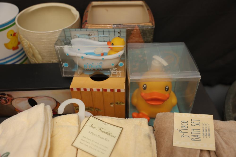 Bathroom and Decorative Items Including Towels, Baskets, and Accessories. Includes embroidered towels, woven baskets, bathroom decor such as a decorative toilet seat cover and trash bins, and various bath accessories including ducks, soap dispensers, and miniature figurines. Pickup only.