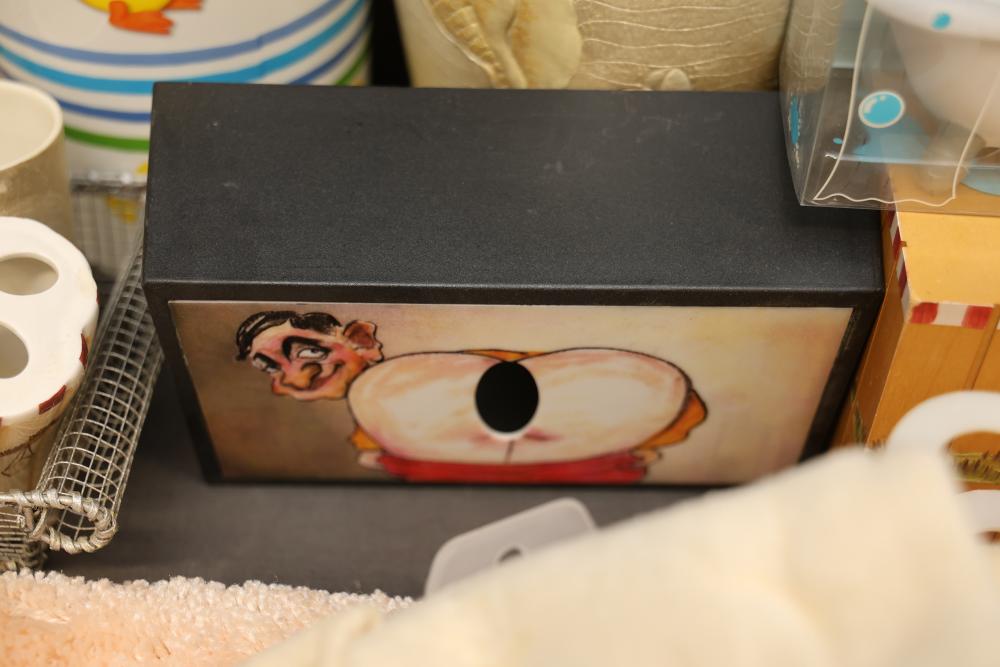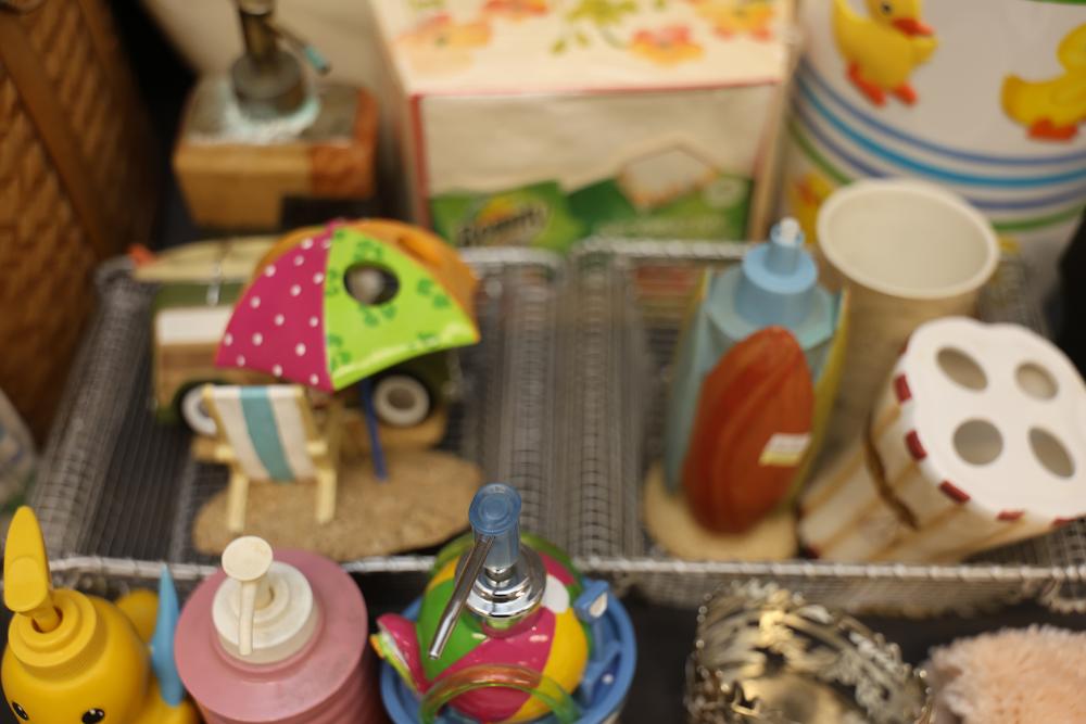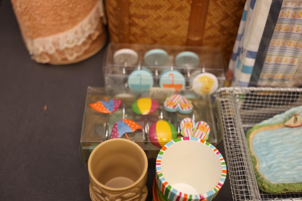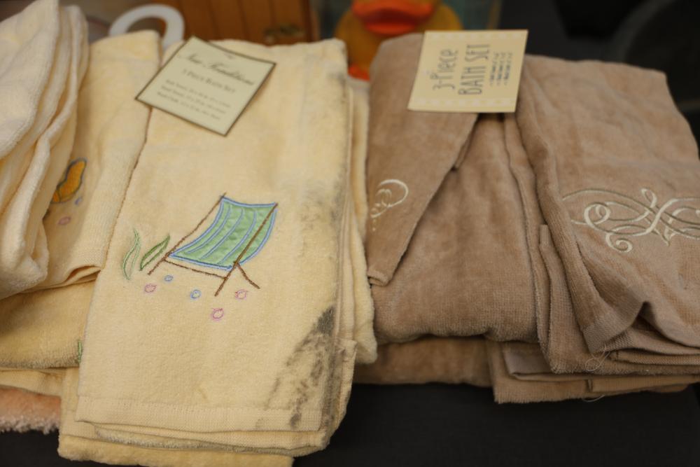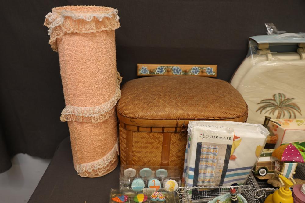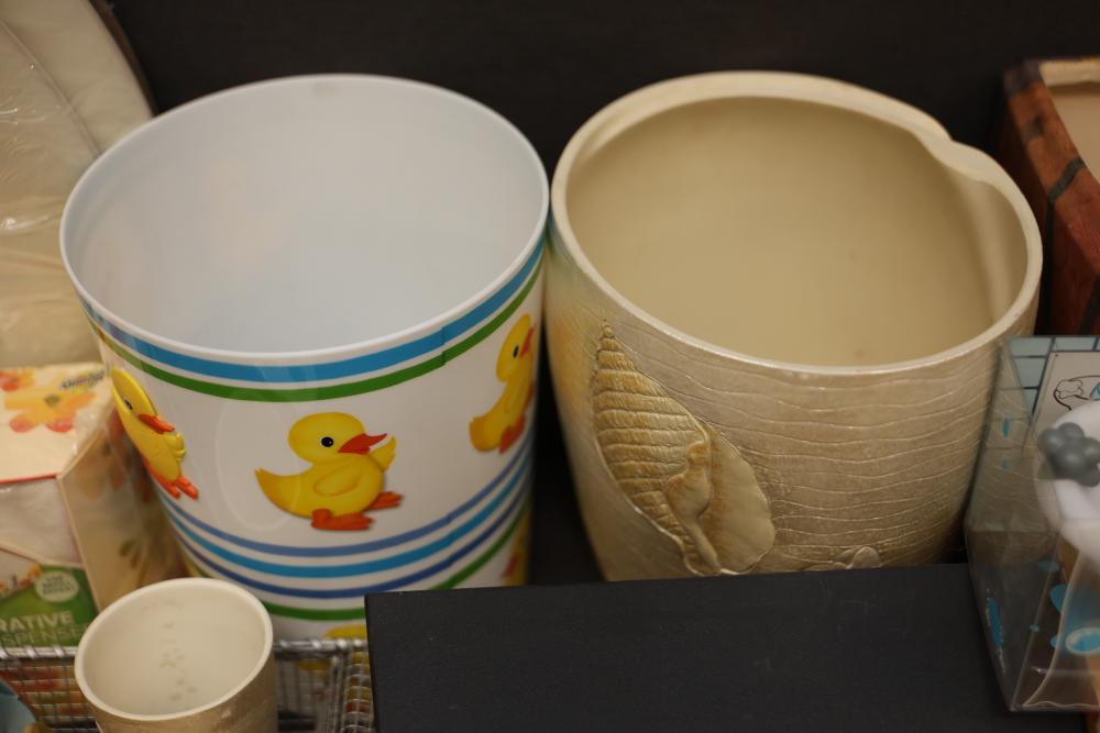 Bathroom and Decorative Items Including Towels, Baskets, and Accessories. Includes embroidered towels, woven baskets, bathroom decor such as a decorative toilet seat cover and trash bins, and various bath accessories including ducks, soap dispensers, and miniature figurines. Pickup only.