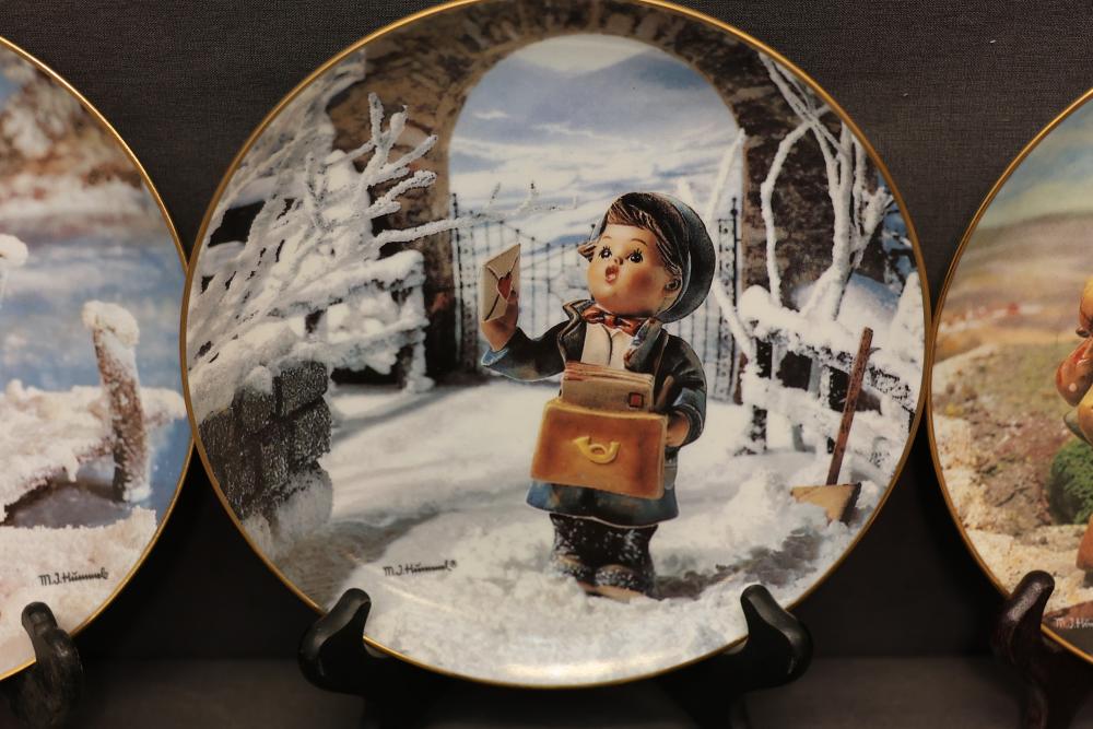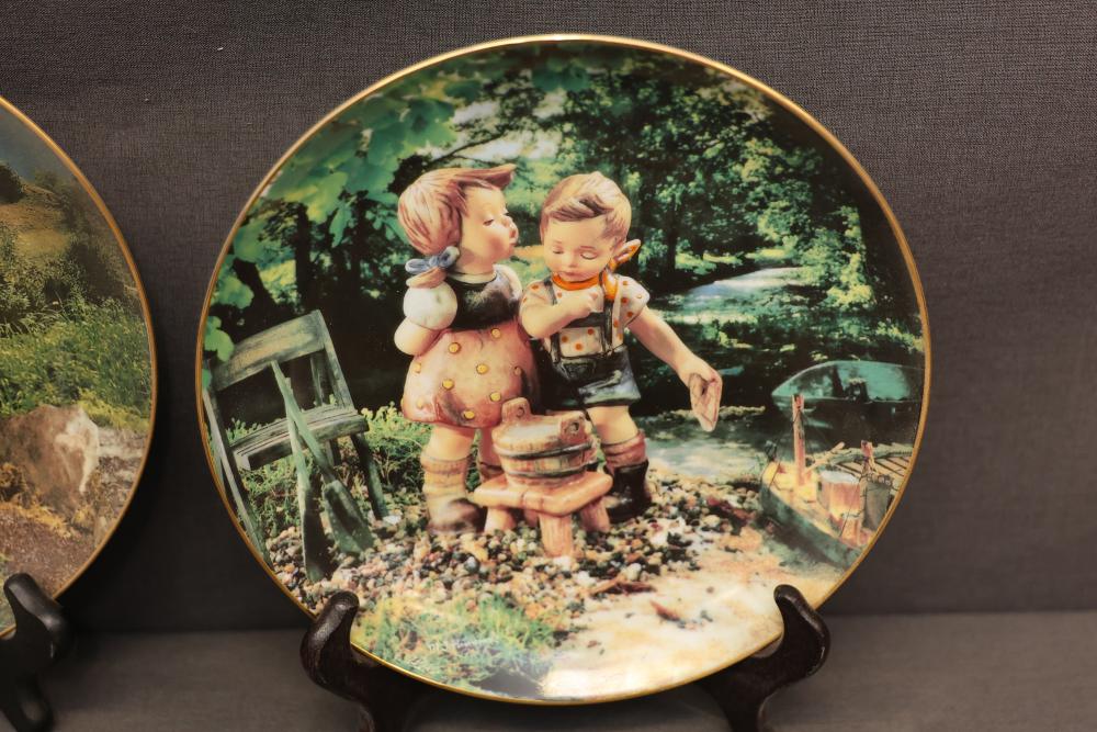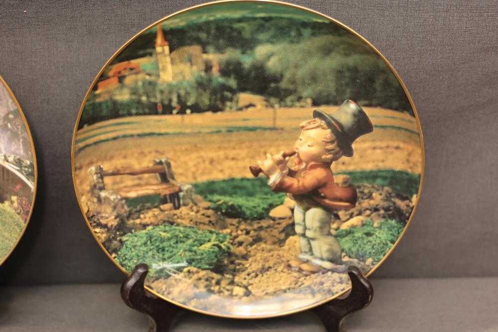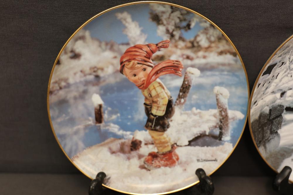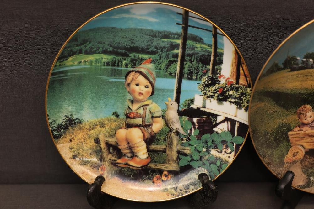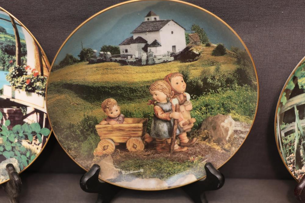 M.J. Hummel Decorative Plates Featuring Various Scenes. Includes multiple plates showcasing intricate designs of children in different seasonal and outdoor settings, with motifs based on original artwork. Each plate features a gold rim and detailing, with descriptions and identifying marks on the back. Pickup only.