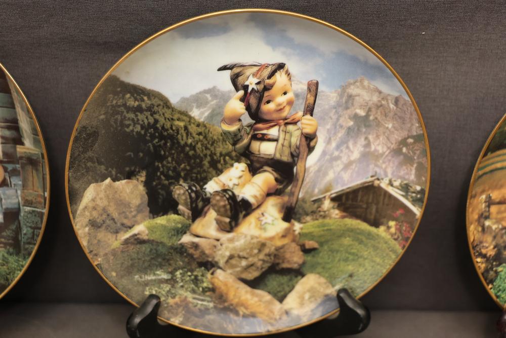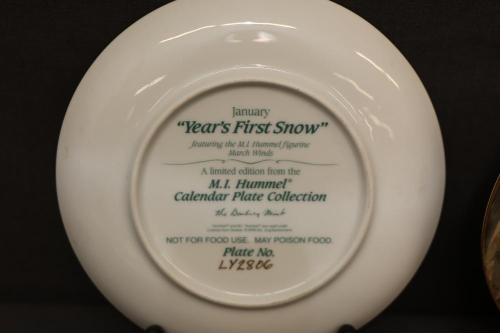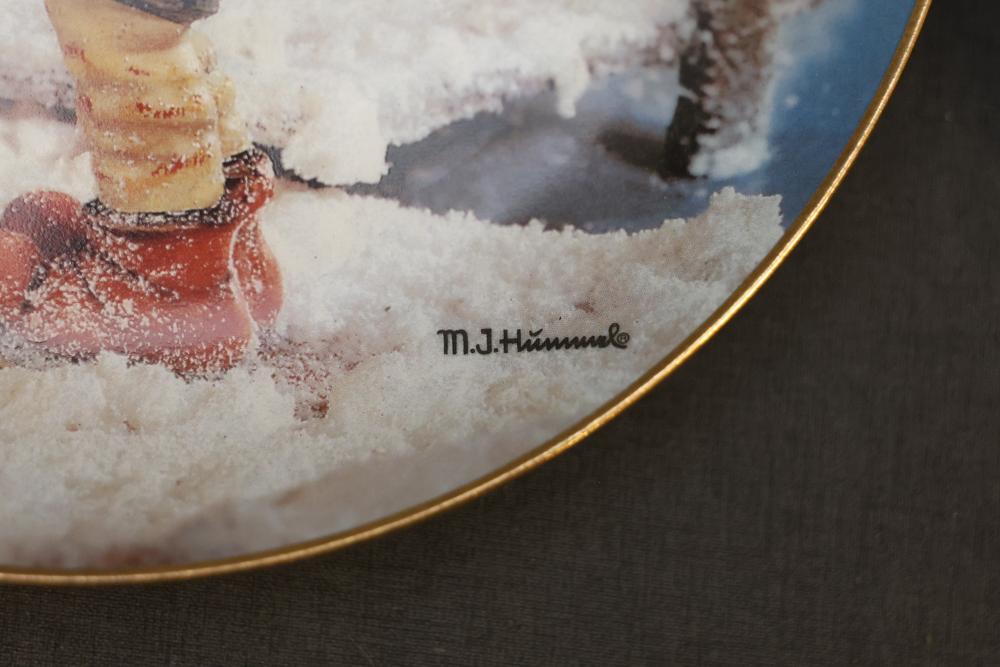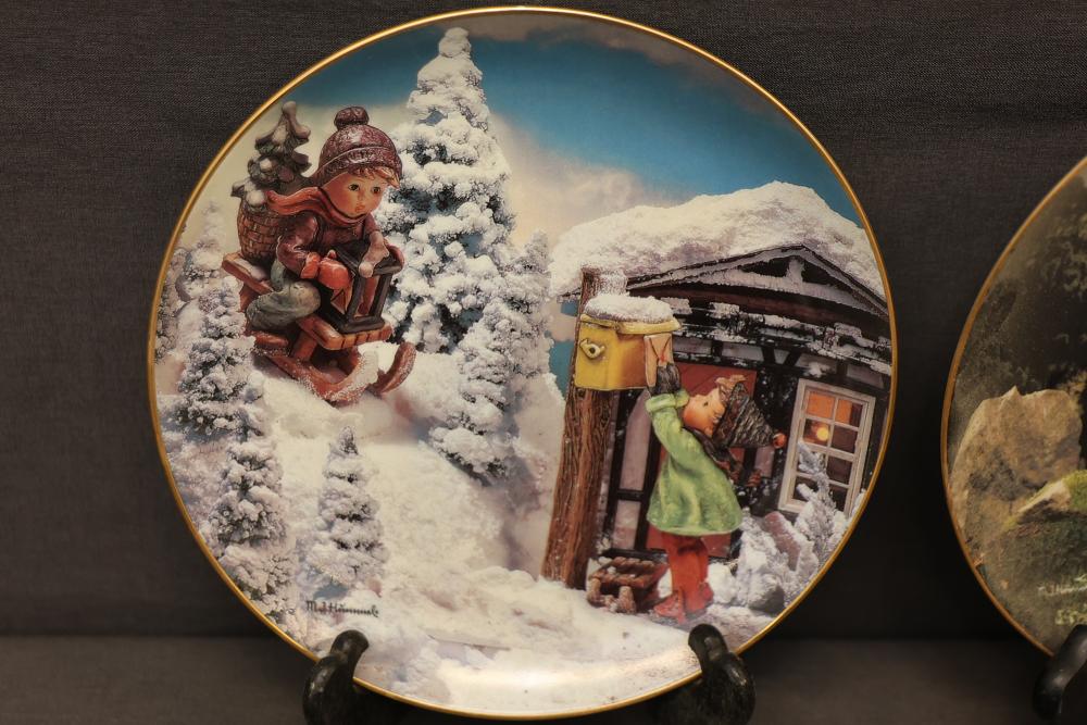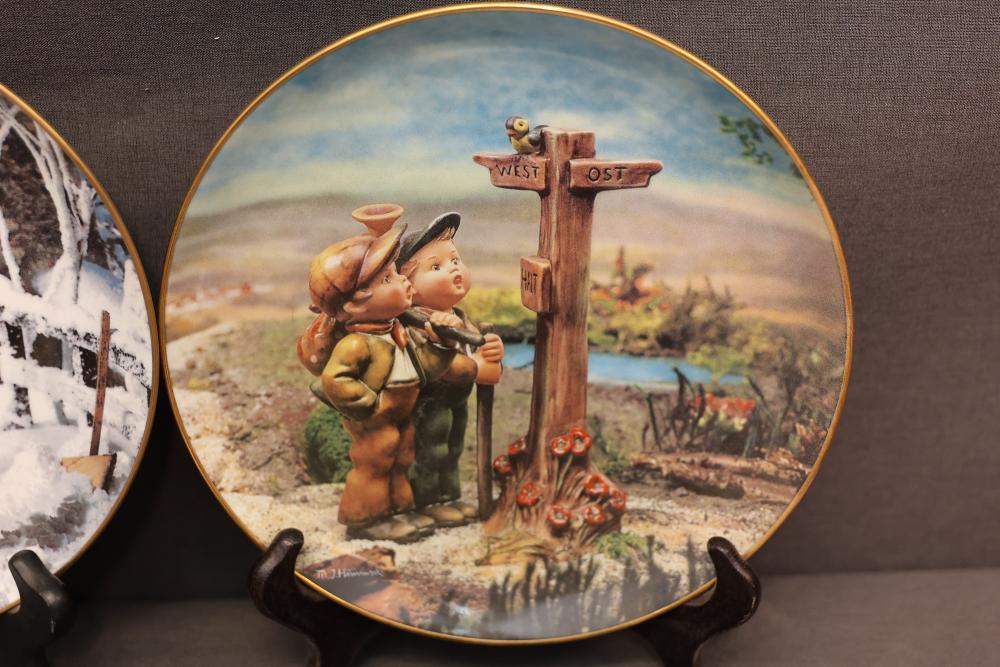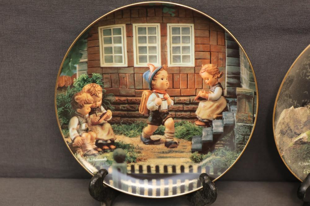M.J. Hummel Decorative Plates Featuring Various Scenes. Includes multiple plates showcasing intricate designs of children in different seasonal and outdoor settings, with motifs based on original artwork. Each plate features a gold rim and detailing, with descriptions and identifying marks on the back. Pickup only.