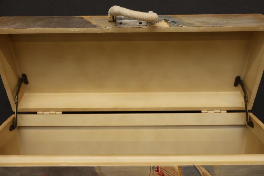Hand-Painted Wooden Storage Chest with Nautical Scene. Features a lid with rope handles and metal hinges. Exterior displays a detailed depiction of sailboats and rowboats on water with a cloudy sky backdrop. Interior is unlined, offering an open storage compartment. Pickup only.