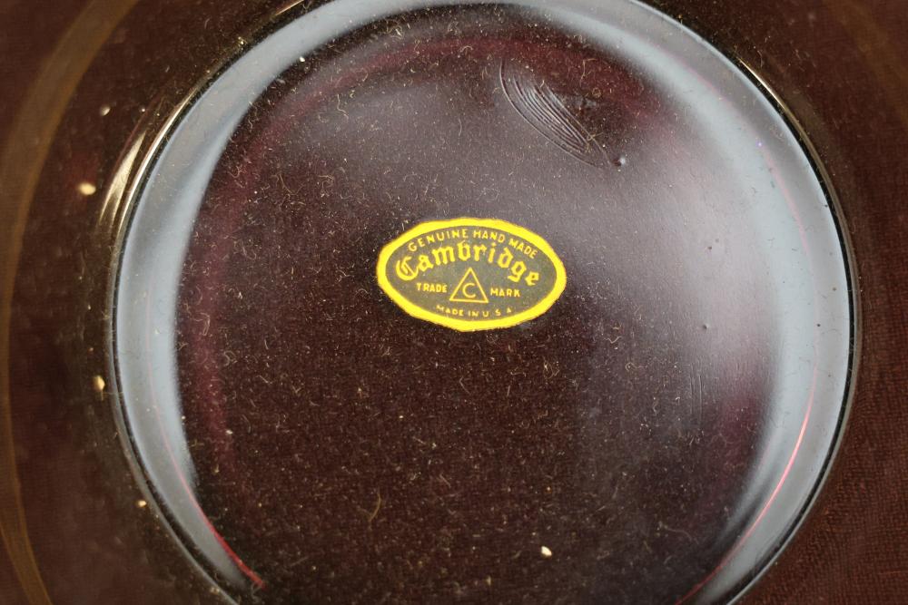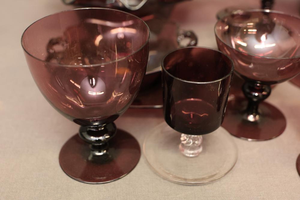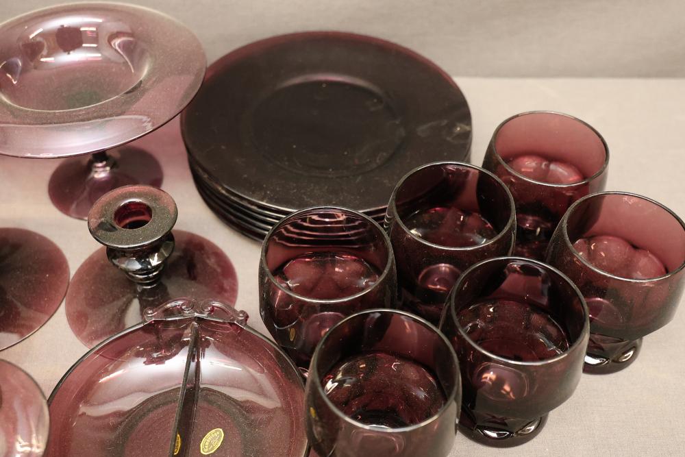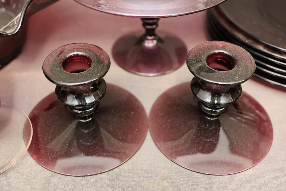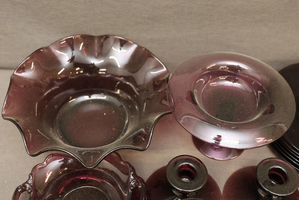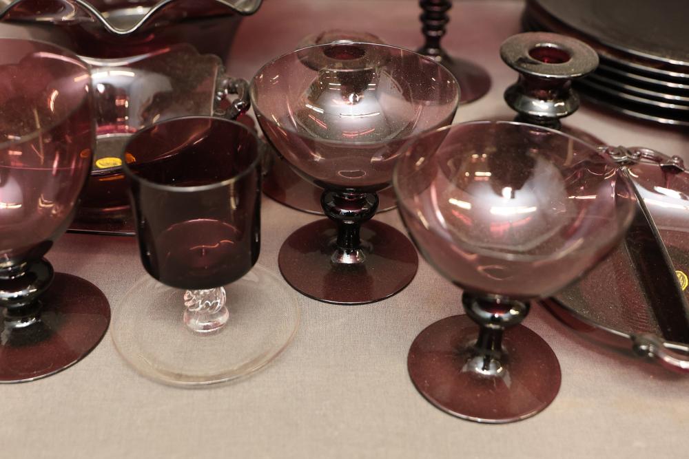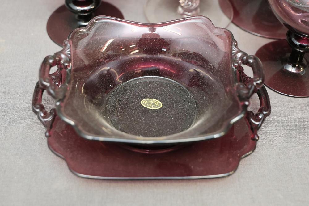Cambridge Glassware in Amethyst with Plates, Cups, Bowls, and Candlesticks. Includes a range of amethyst-colored glassware items such as plates, goblets, bowls, footed candy dishes, and candlesticks. Some pieces are labeled with maker's mark. Pickup only.