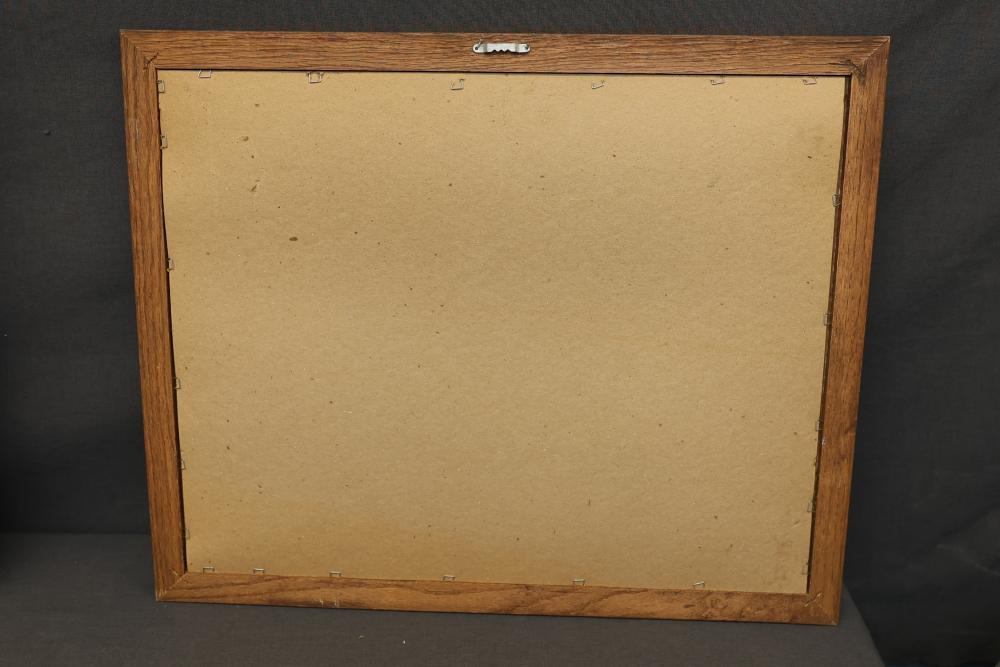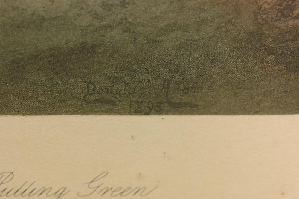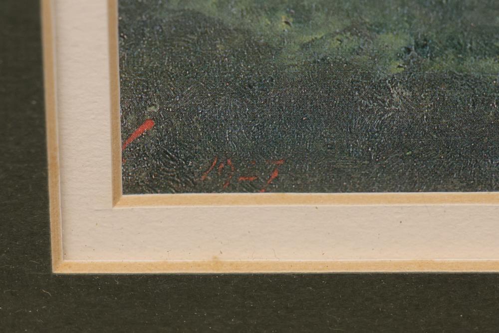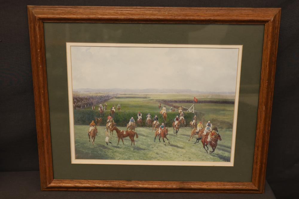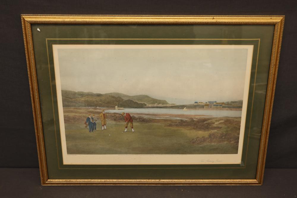 Framed Equine and Golf-Themed Art Prints. Includes one print depicting a horse race with jockeys in a wooden frame and one print showing golfers on a coastal course in a gilded frame. Both prints are double-matted under glass and feature artist signatures. Frames show light wear consistent with age. Pickup only.