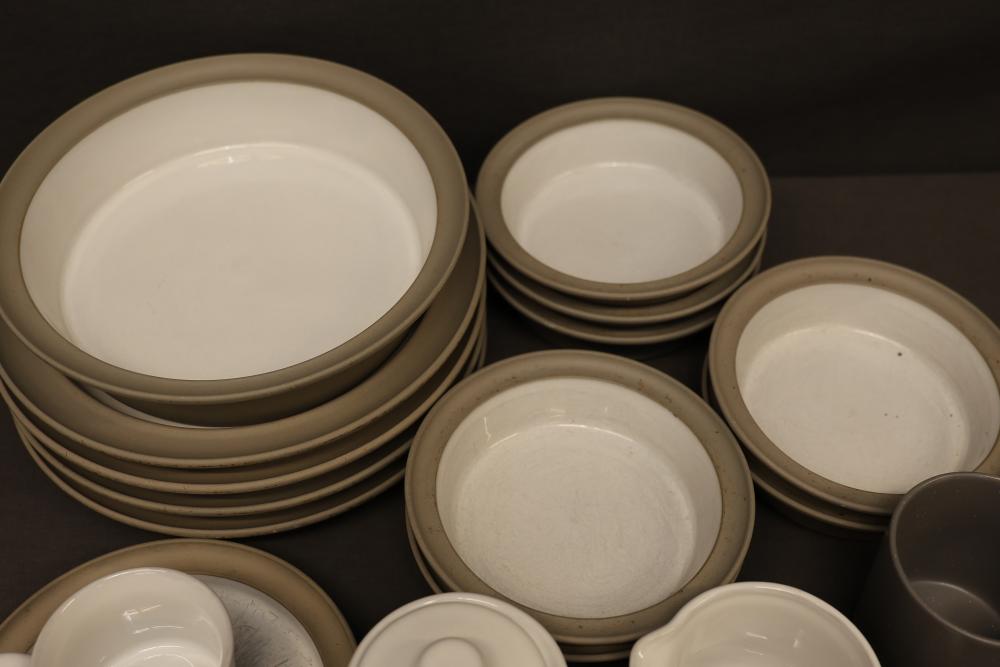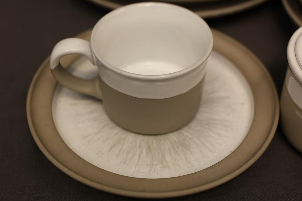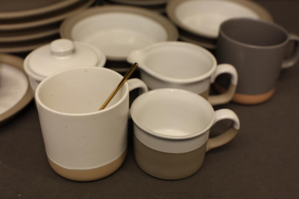 Stoneware dinnerware set with plates, bowls, mugs, cups, a creamer, and a lidded sugar bowl in a beige and white two-tone design. Includes matching saucers for cups. Pickup only.