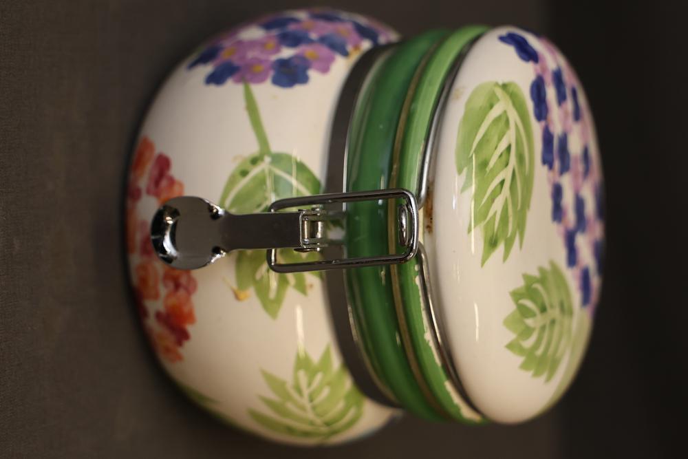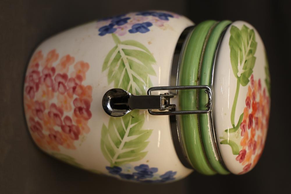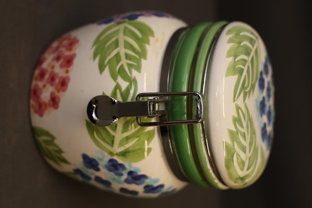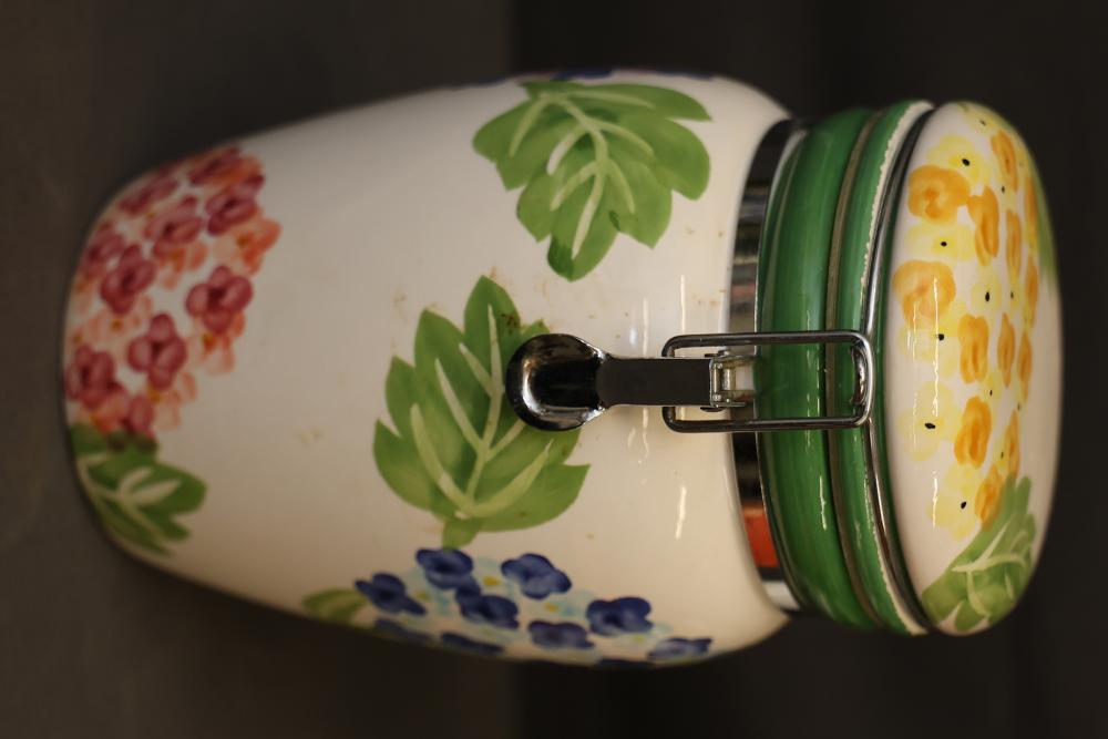 Four Ceramic Airtight Storage Jars with Floral Design. Includes four jars of varying sizes, each featuring a hand-painted floral and leaf pattern in multicolor. Jars have metal clasp closures and green accent bands around the lids for secure sealing. Suitable for kitchen or general storage purposes. Pickup only.
