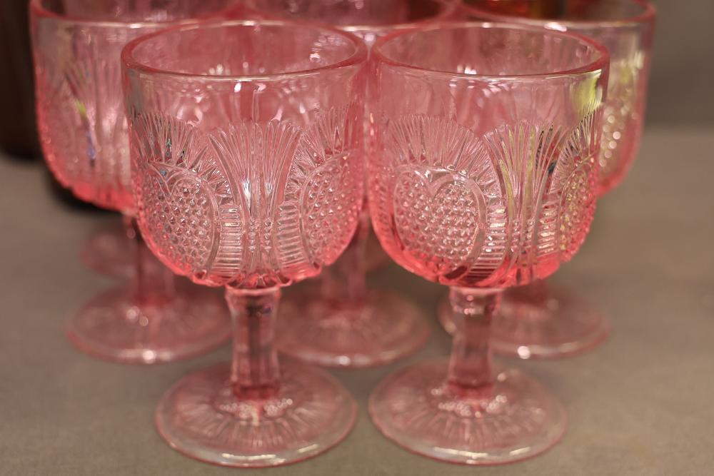 Colored Glasses With Decorative Patterns. A group of glasses in varying colors, including pink, blue, green, and brown tones, with distinct decorative patterns and designs such as embossed details and stripes. Pickup only.