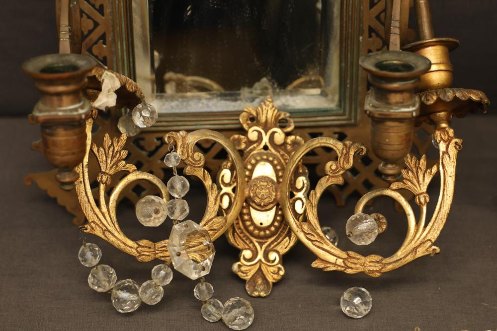 Gilt bronze mirrored wall sconces with intricate lattice-designed frames. Each sconce features dual candleholders and is decorated with crystal accents. The mirrors show noticeable wear, patina is present, and some crystal pieces are detached or missing. Pickup only.