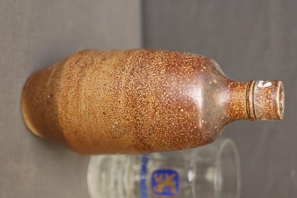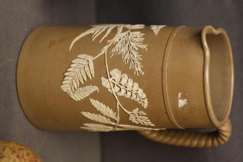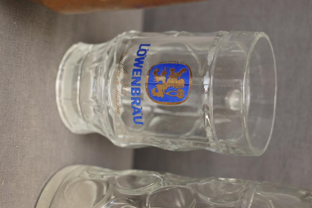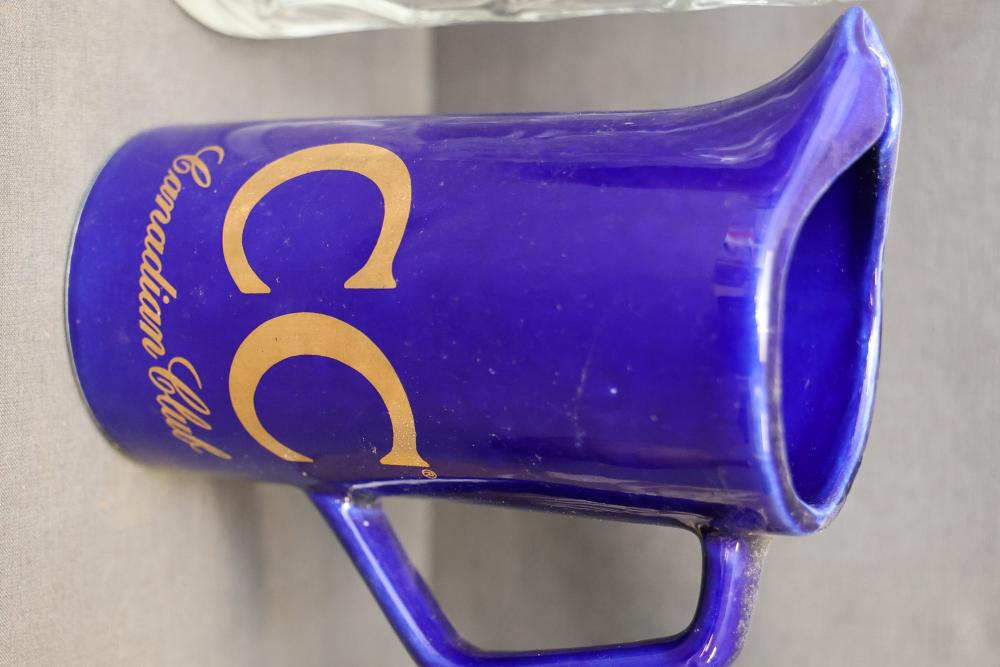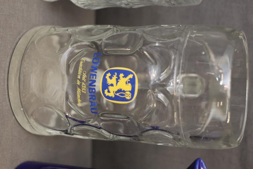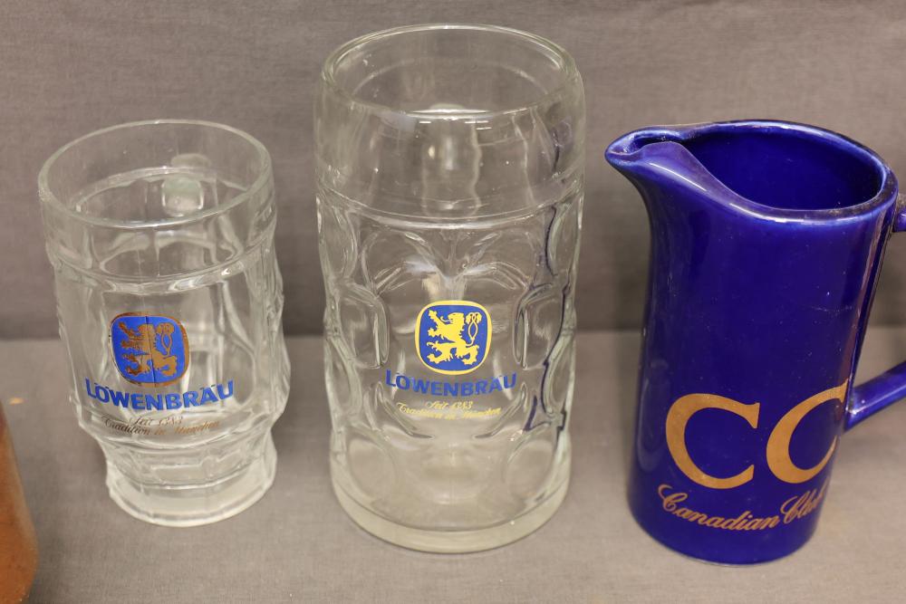 Ceramic and Glass Pitchers and Steins. Includes a brown ceramic pitcher with raised floral design, a blue ceramic Canadian Club pitcher, two Lowenbrau glass beer steins with logos, and two brown ceramic storage bottles. Pickup only.