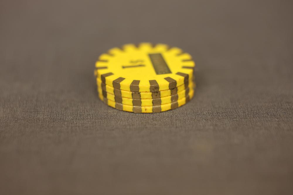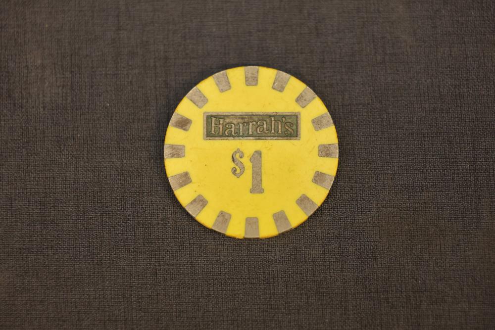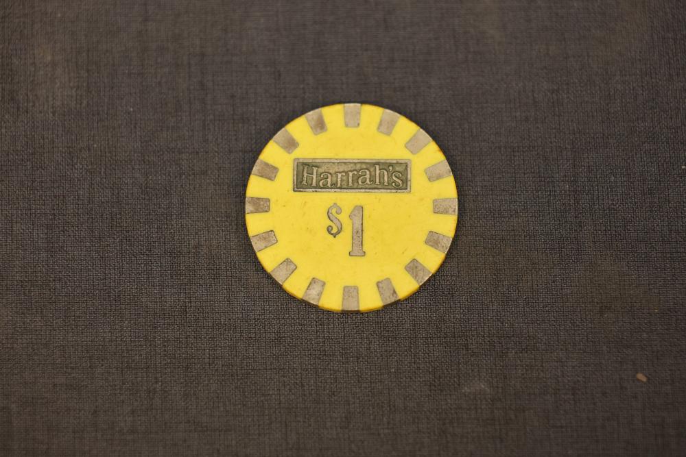 Yellow $1 Harrah's Casino poker chips featuring a yellow base with gray accents and denomination markings. Includes a plastic holder for organization and storage. Pickup only.