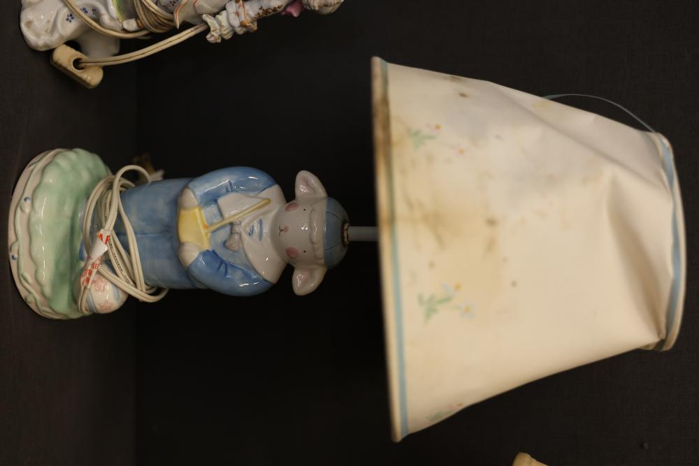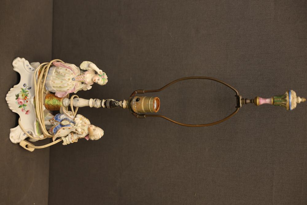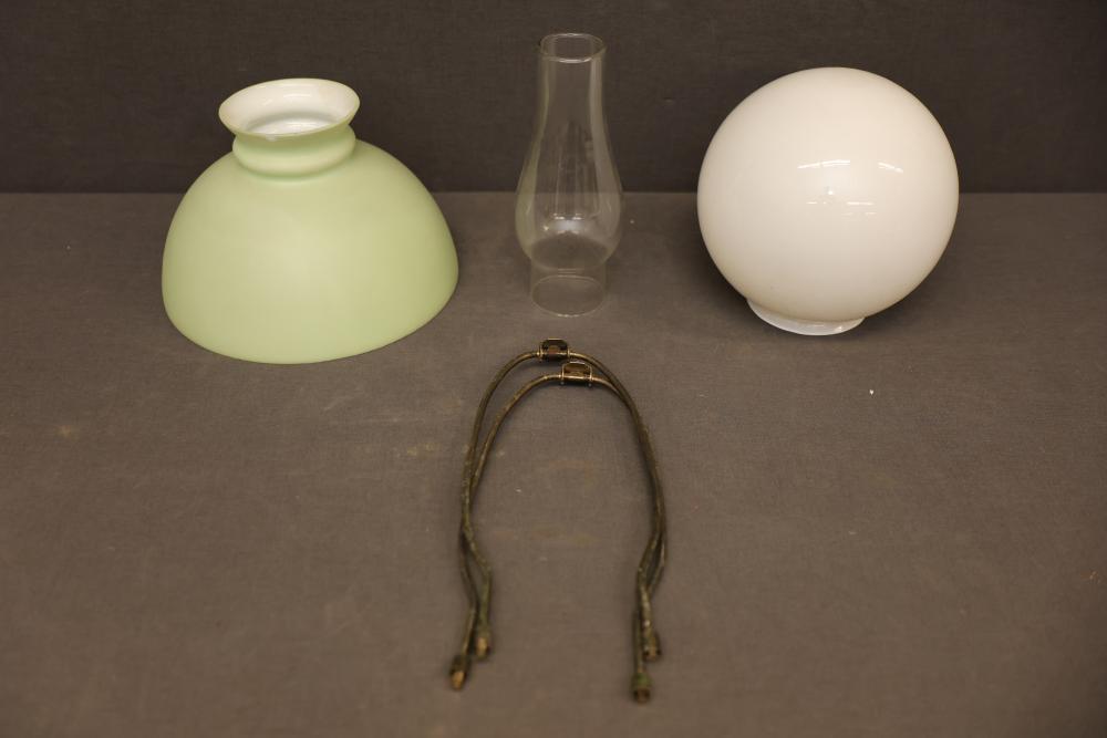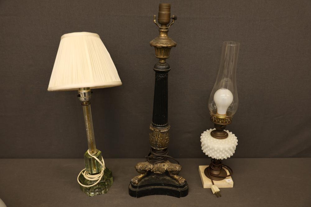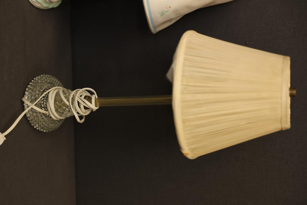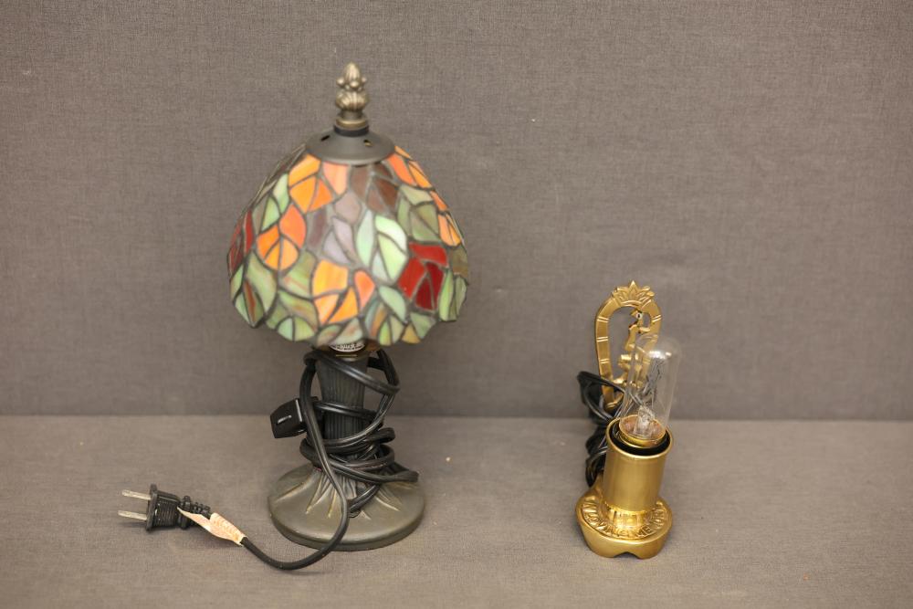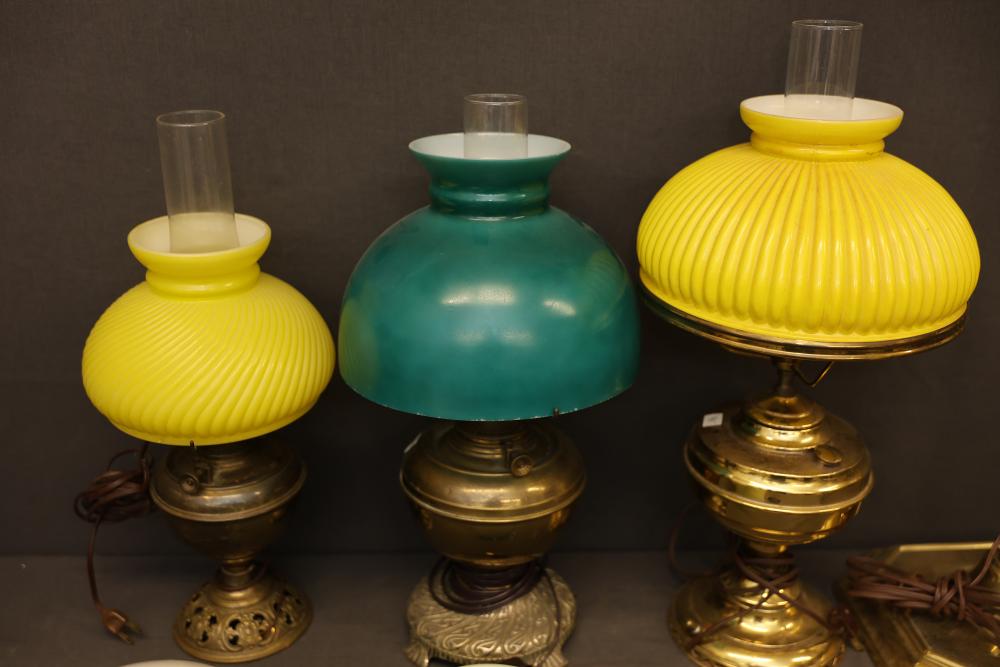 Table and floor lamps with shades and lamp parts, including a brass floor lamp, figural lamps, and colorful glass lamp shades. The set also features decorative bases in various materials with accompanying electrical cords. Condition varies across pieces. For all items shown: Pickup only.