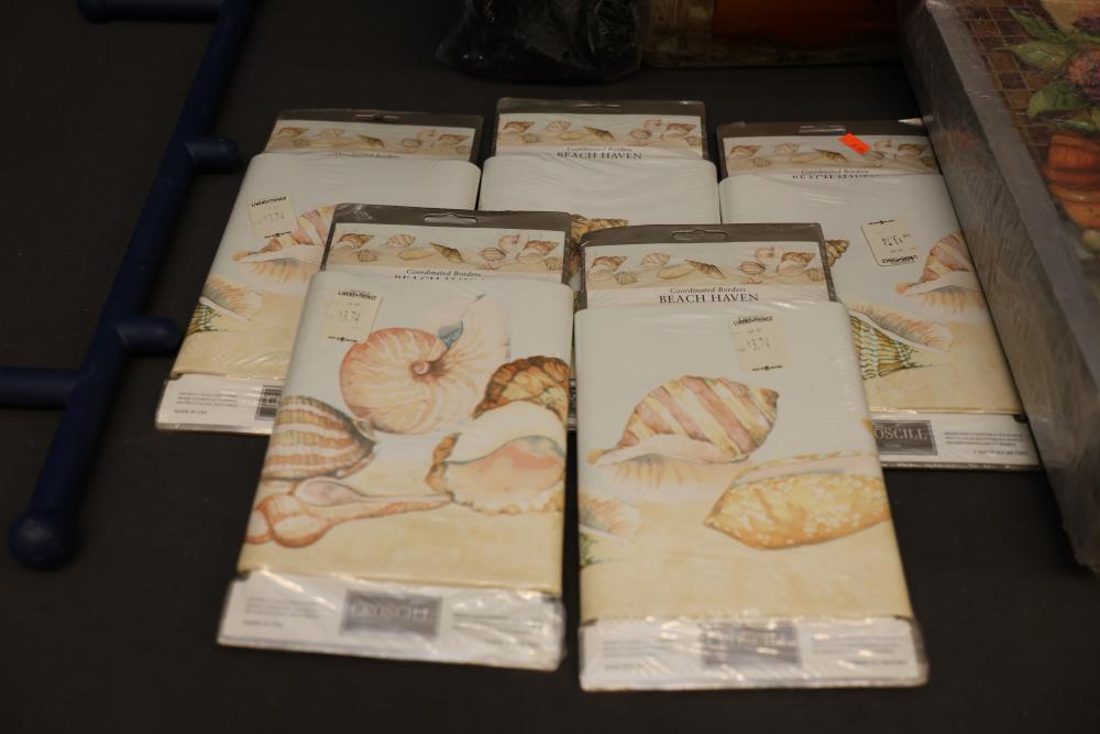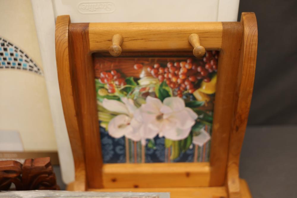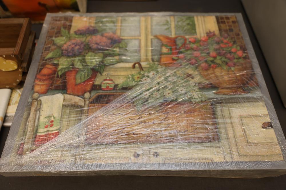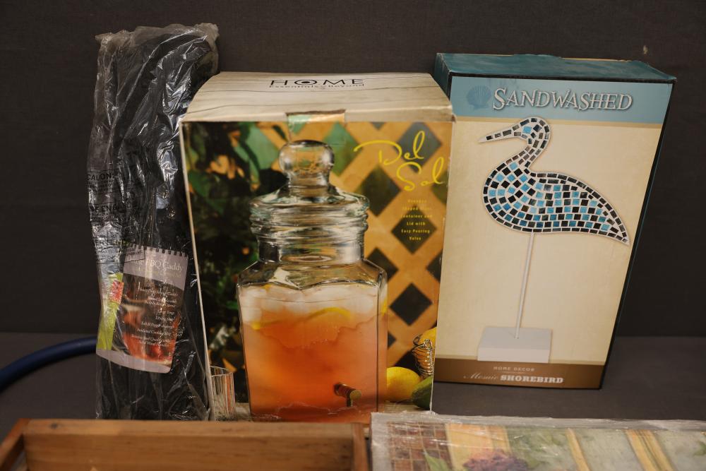 Home decor items, including a carved wooden panel with a dragon motif, a ceramic planter with heart accents, a framed floral artwork, a mosaic heron design, a plastic storage drawer, decorative seashell napkins, and a boxed glass beverage dispenser. Items are in varied materials and designs, with some boxed or wrapped. Pickup only.