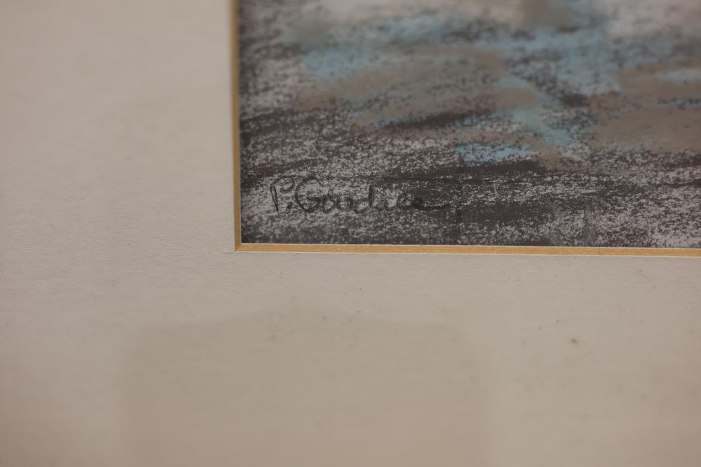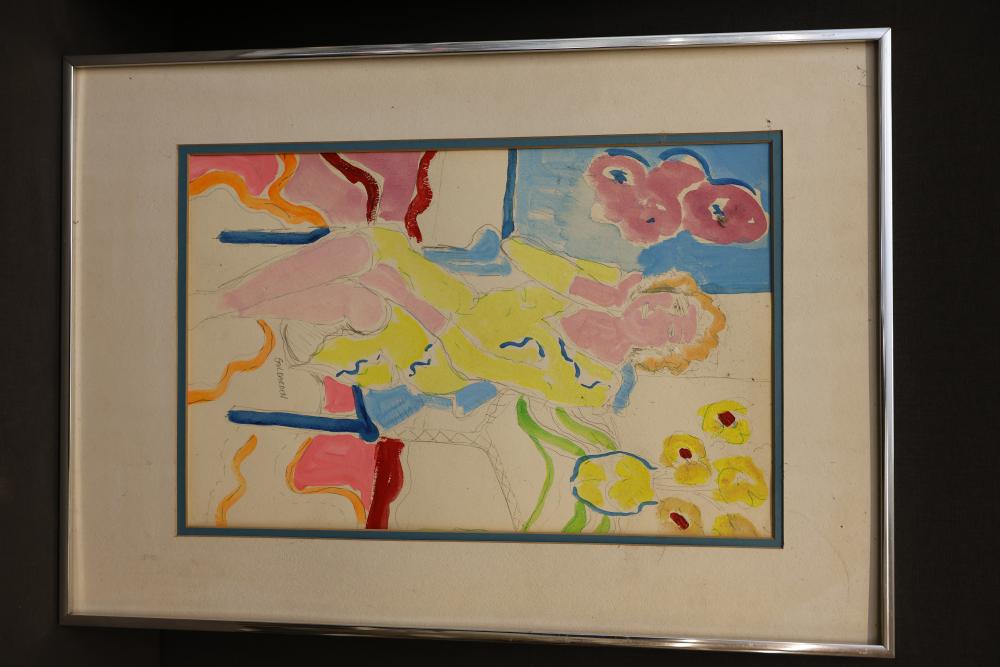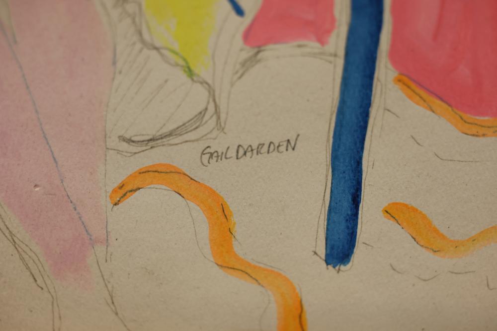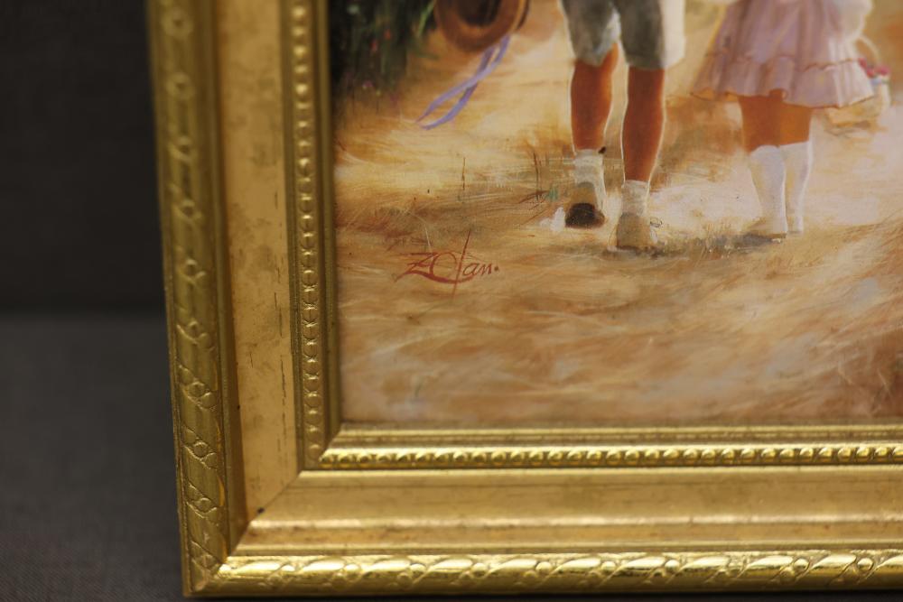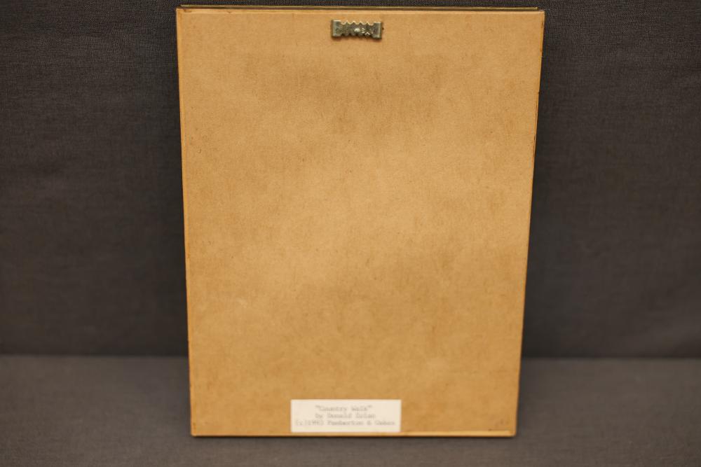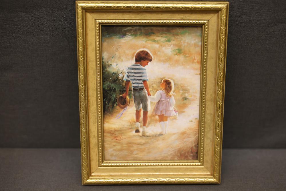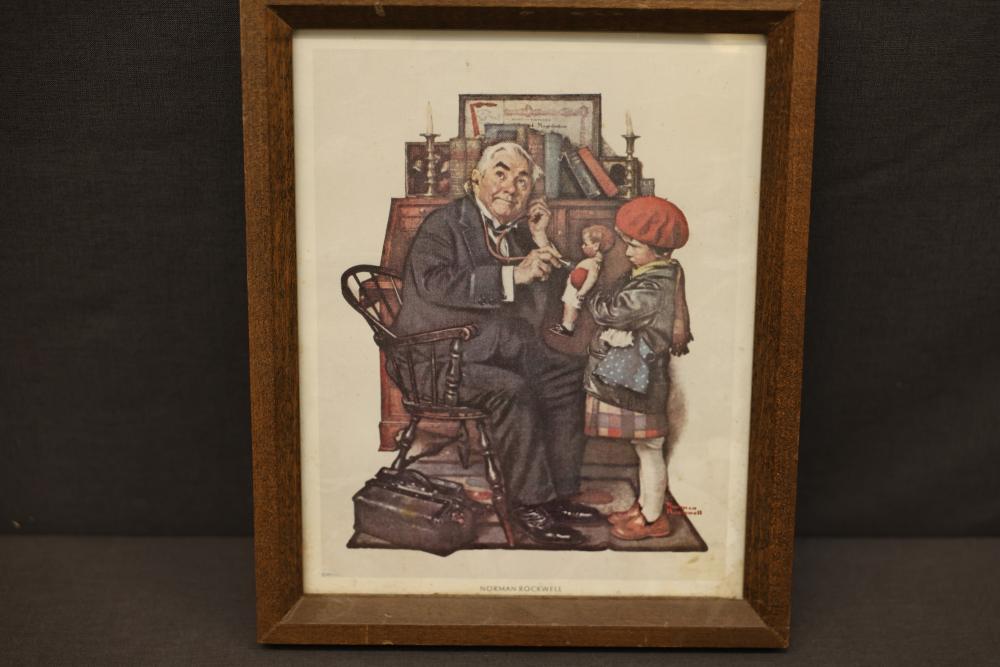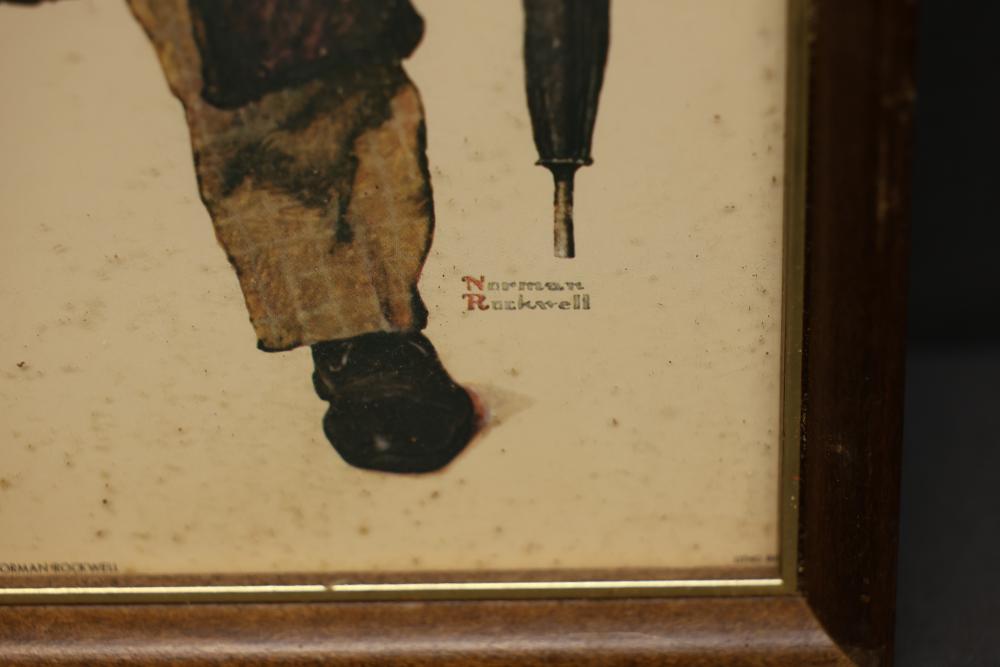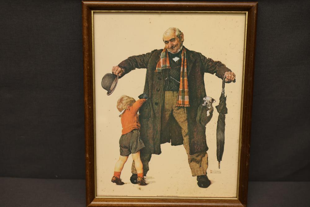 Framed Artwork Group Featuring Figures and Abstracts. Includes five framed pieces, including illustrations signed Norman Rockwell, a framed depiction of a child outdoors, an abstract artwork signed Gail Darden, and paintings of figures in a landscape and domestic setting. Pickup only.