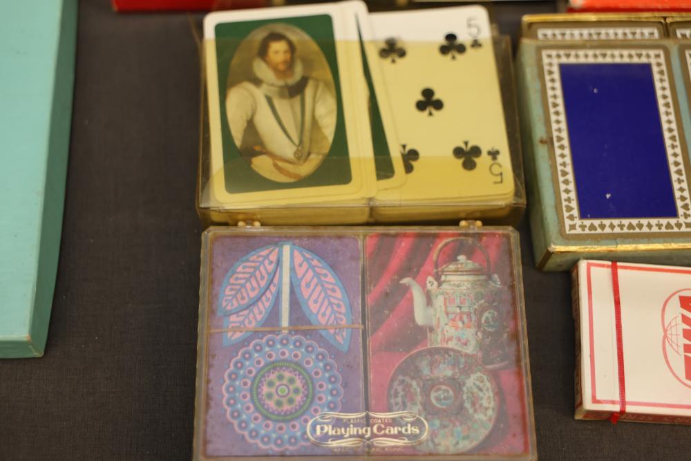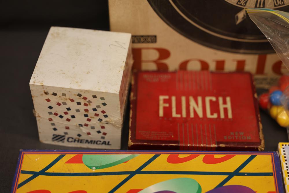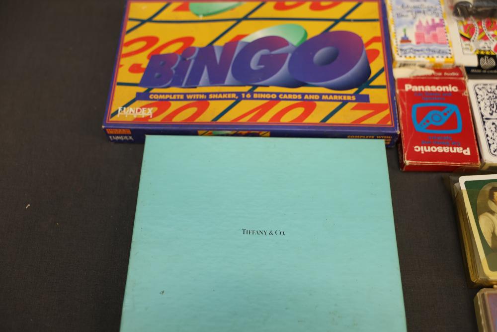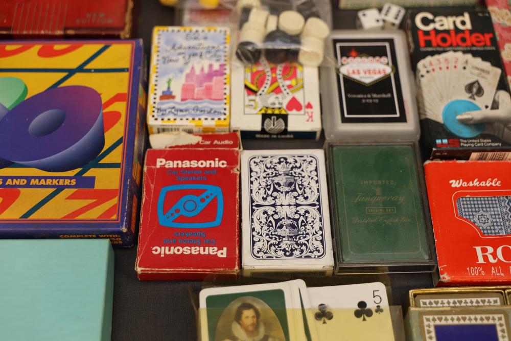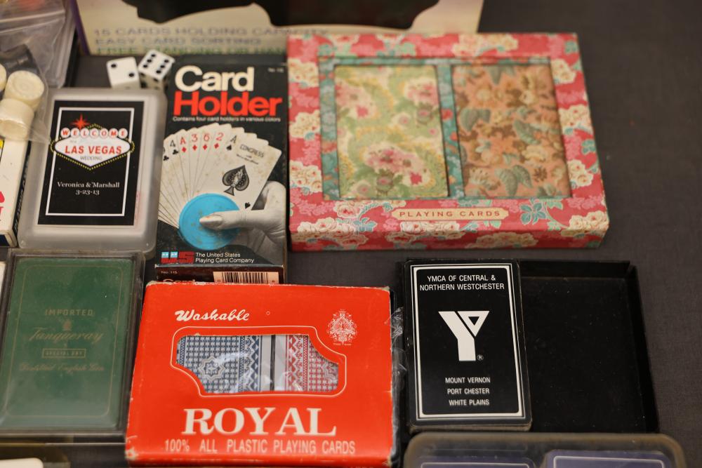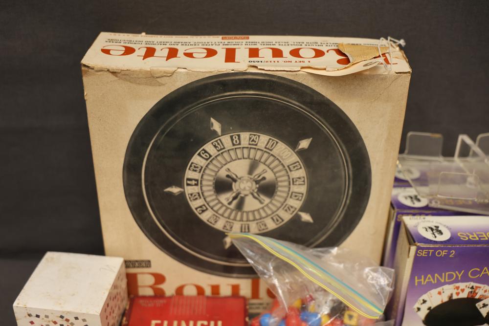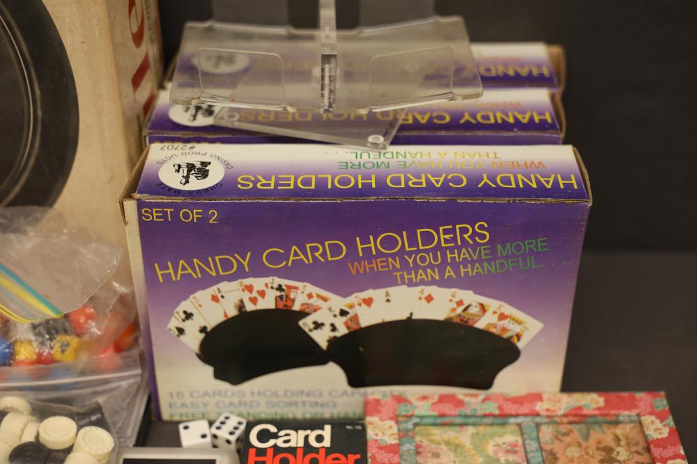 Card games, playing cards, Bingo set, and board game accessories. Includes various branded and themed playing cards, Handy Card Holders (set of 2), a Roulette board game, bingo cards and markers, cardholders, dice, and other items visible in the images. Pickup only.