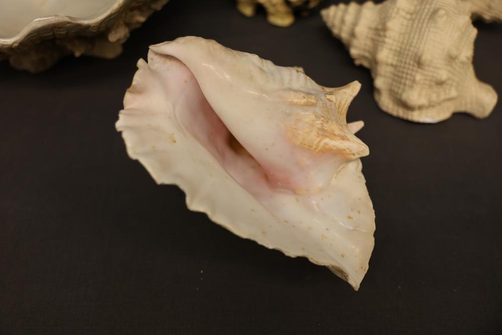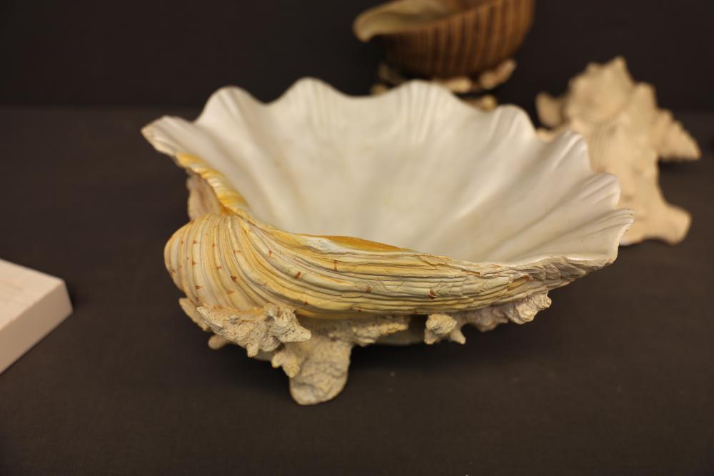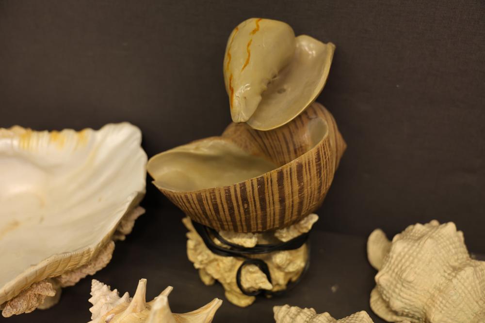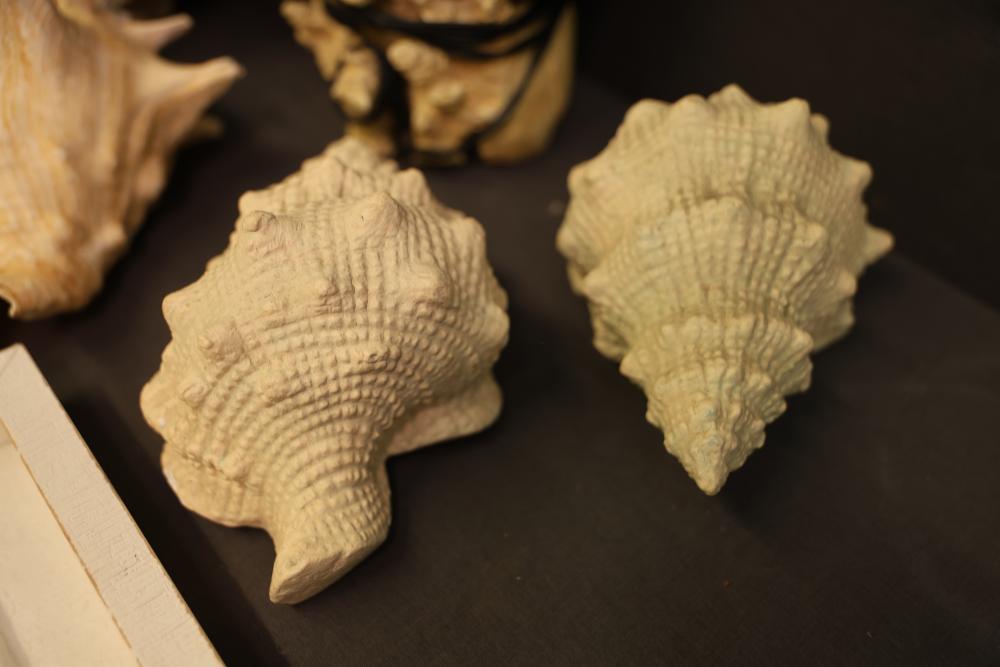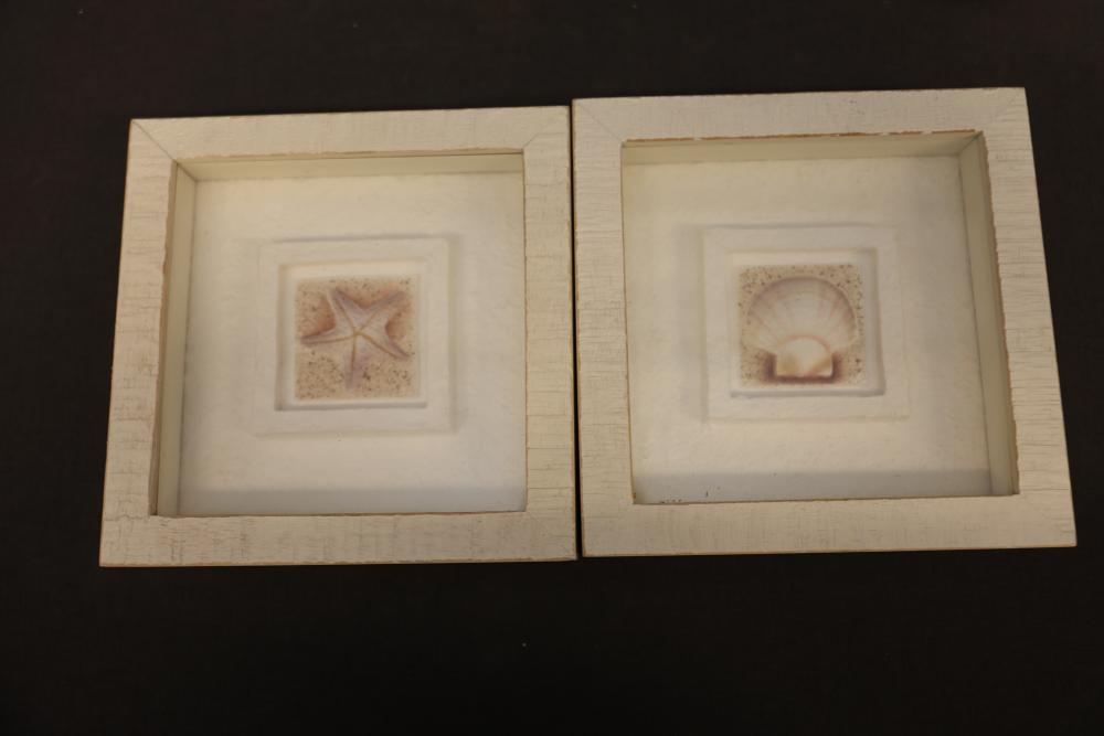 Seashells and two framed shell prints consisting of a mix of natural shells, including conch, clam, and spiral varieties, as well as two framed artworks featuring shell motifs in white frames with shadowbox construction. Pickup only.