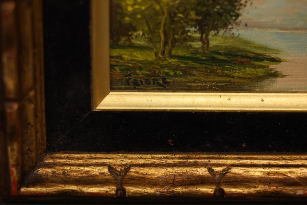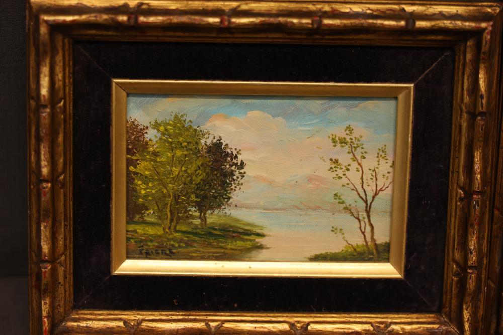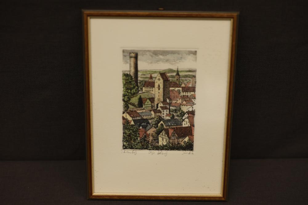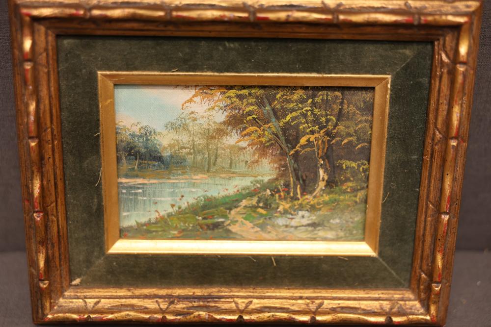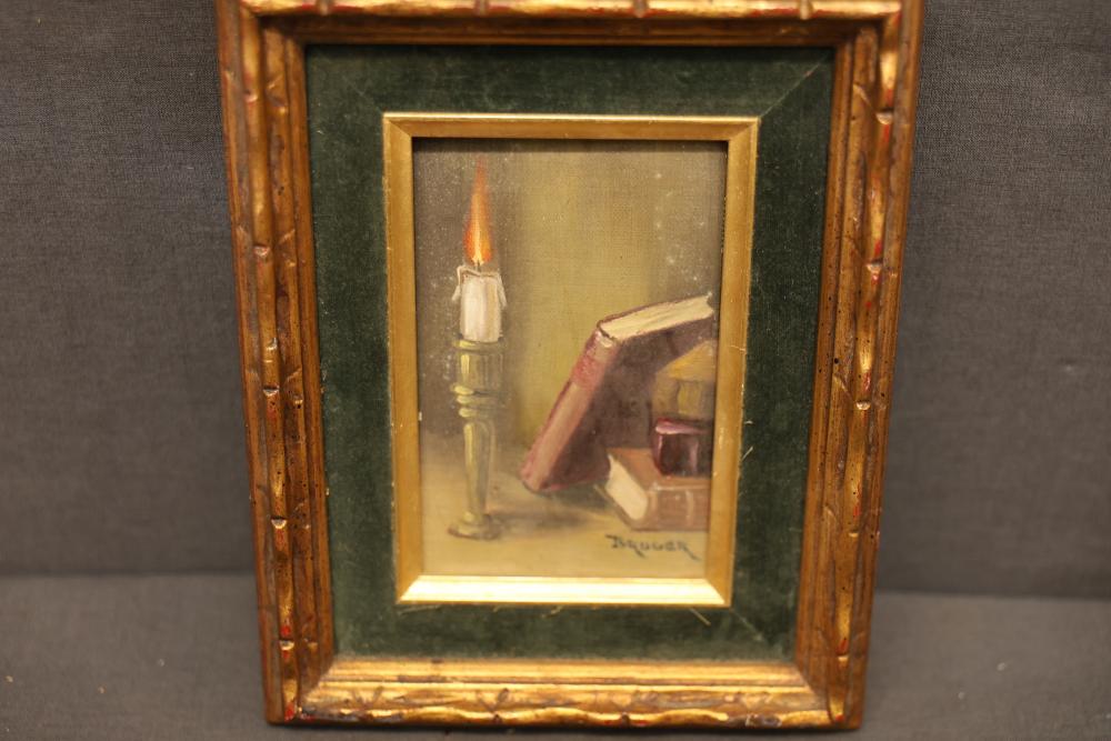 Framed paintings and print featuring landscapes and still life. Includes a still life with books and candle signed by Brugger, two landscape paintings signed by Krell, and an original colored lithograph featuring a village scene. Frames are wooden with gilt finishes and show wear from age and handling. Pickup only.