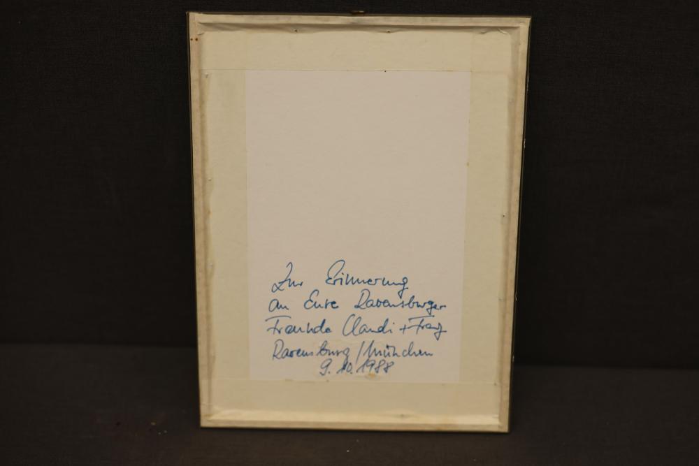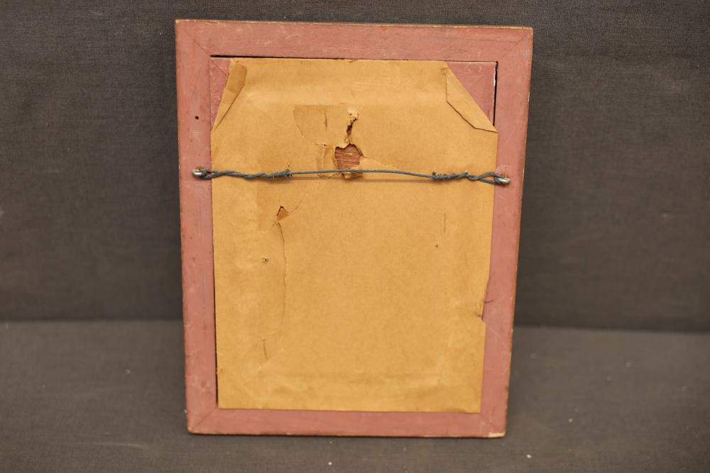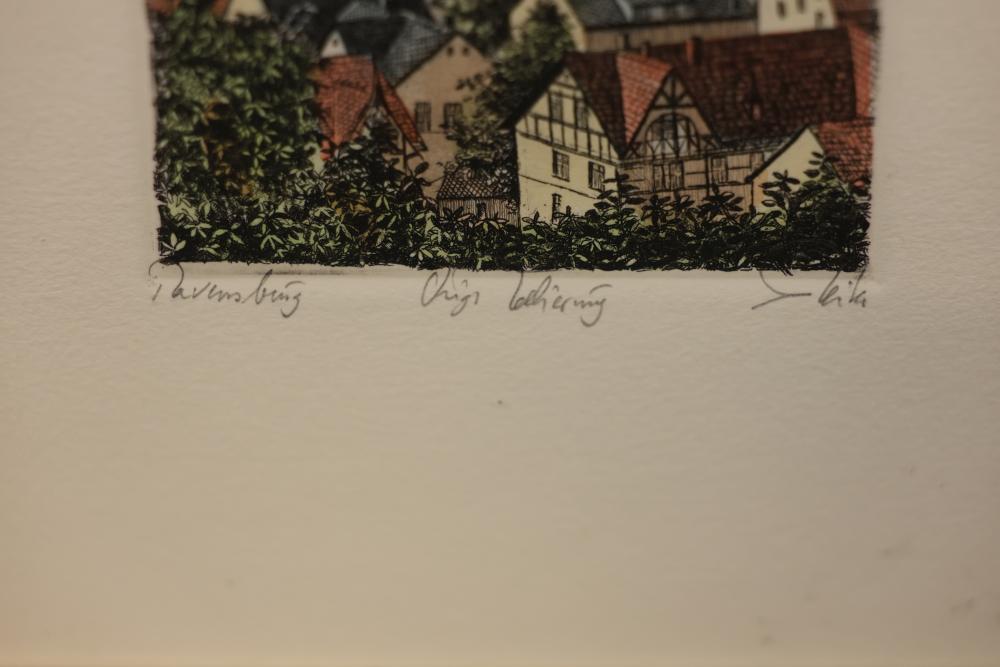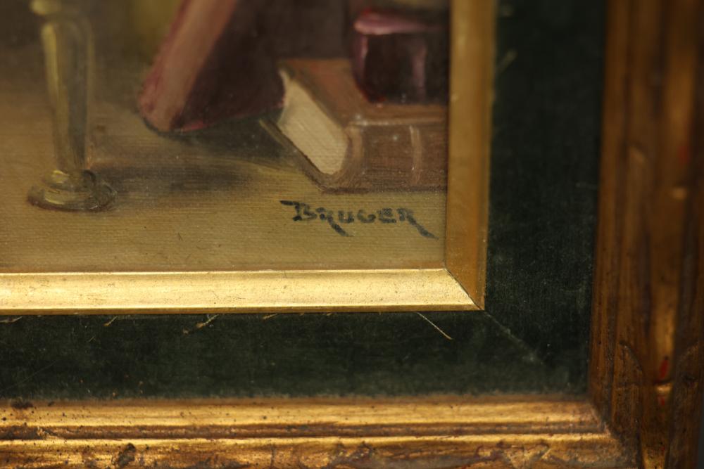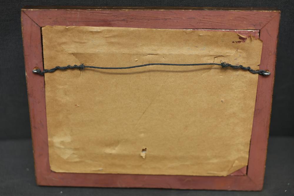 Framed paintings and print featuring landscapes and still life. Includes a still life with books and candle signed by Brugger, two landscape paintings signed by Krell, and an original colored lithograph featuring a village scene. Frames are wooden with gilt finishes and show wear from age and handling. Pickup only.