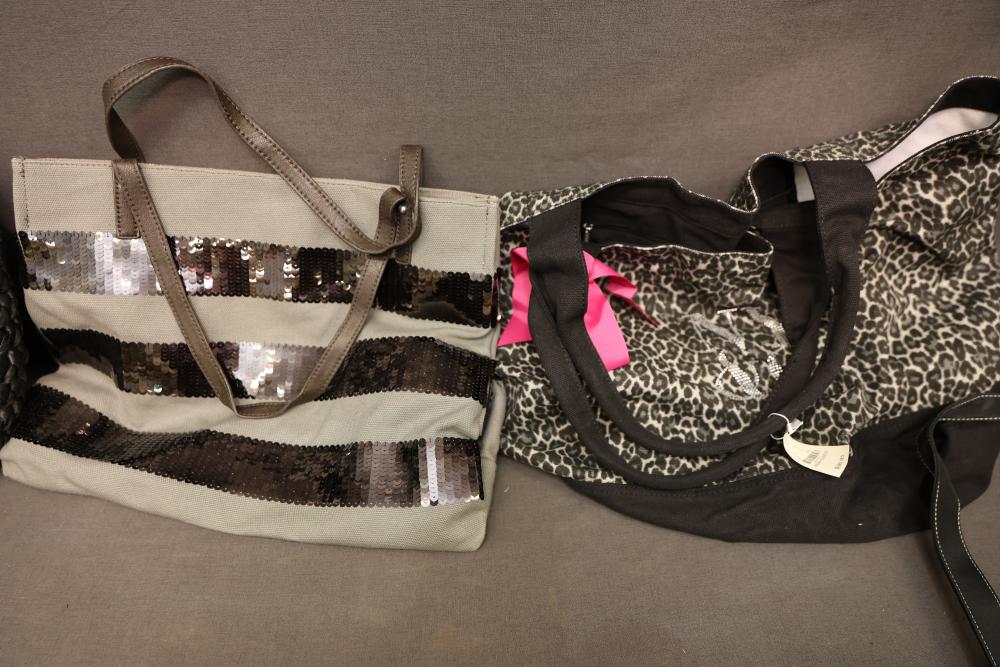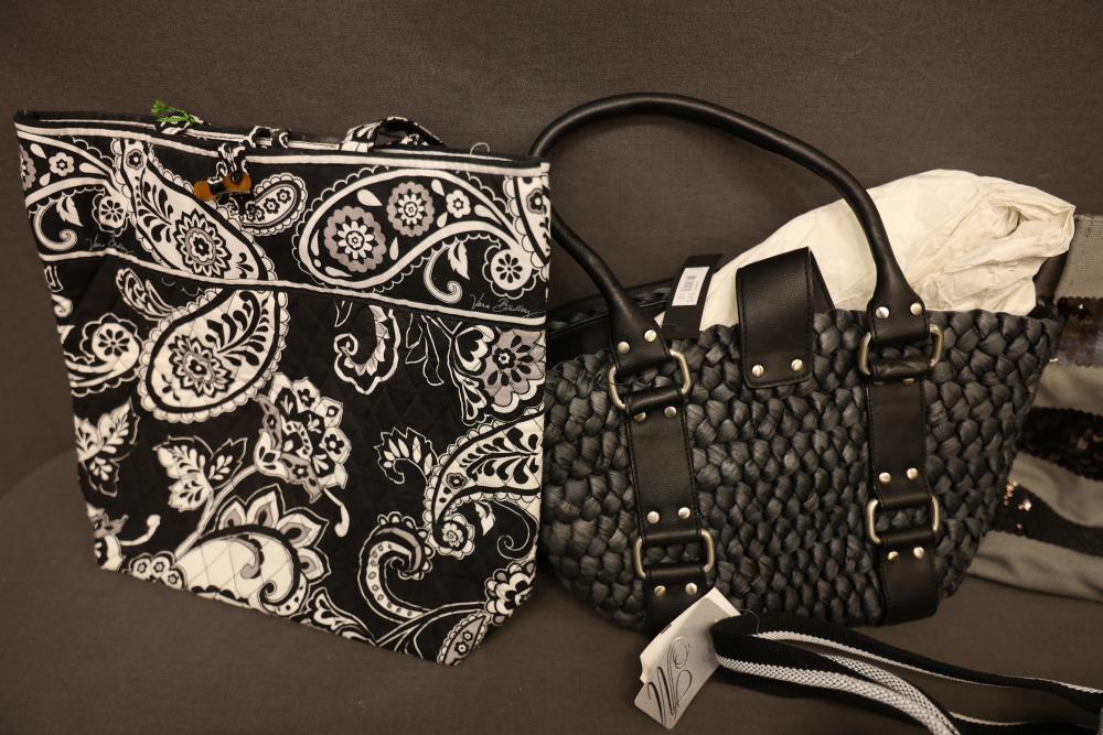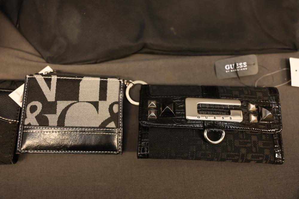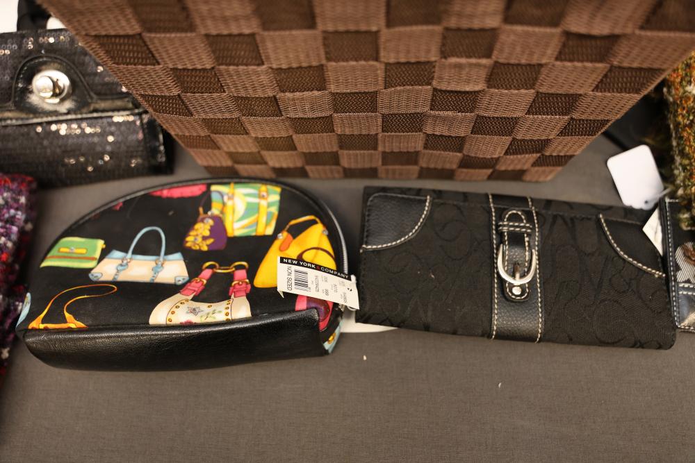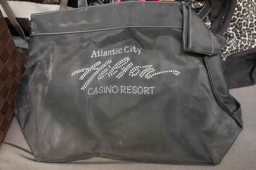 Handbags, wallets, jewelry, and accessories including brands like Guess and a handbag featuring Atlantic City Hilton Casino Resort branding. Contains a mix of items such as totes, wallets, woven baskets with belts, costume jewelry, and fabric pouches. Pickup only.