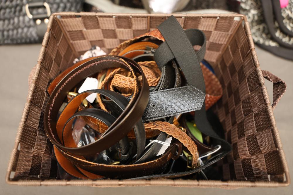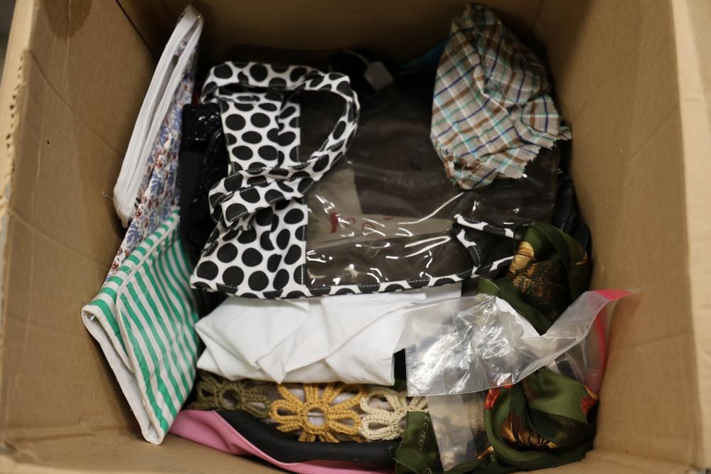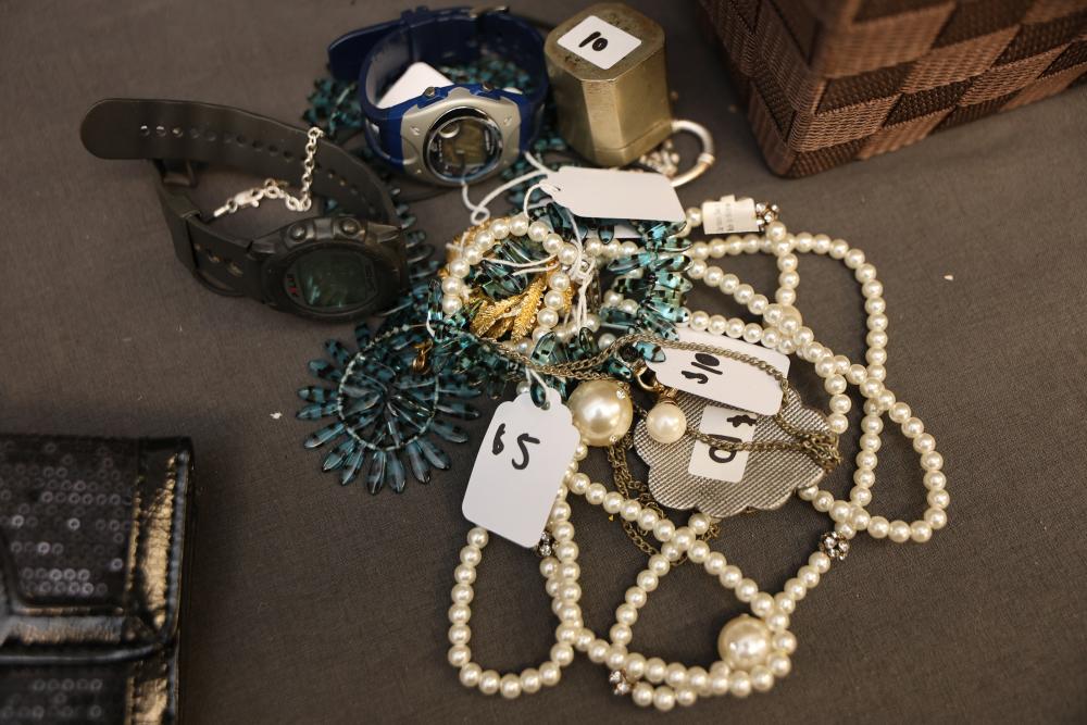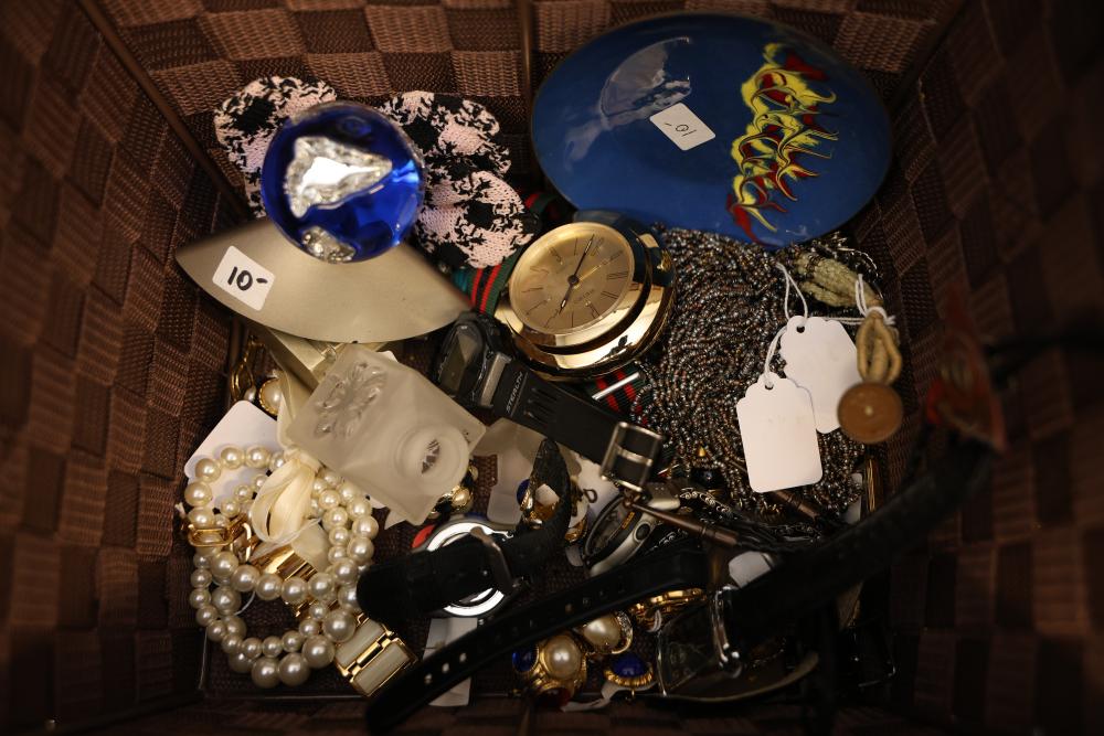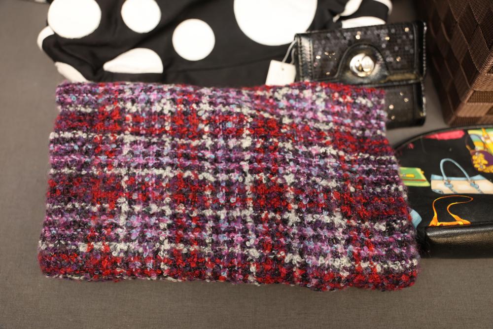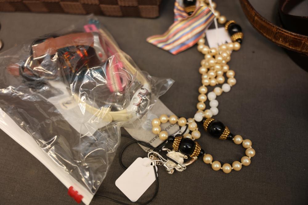 Handbags, wallets, jewelry, and accessories including brands like Guess and a handbag featuring Atlantic City Hilton Casino Resort branding. Contains a mix of items such as totes, wallets, woven baskets with belts, costume jewelry, and fabric pouches. Pickup only.