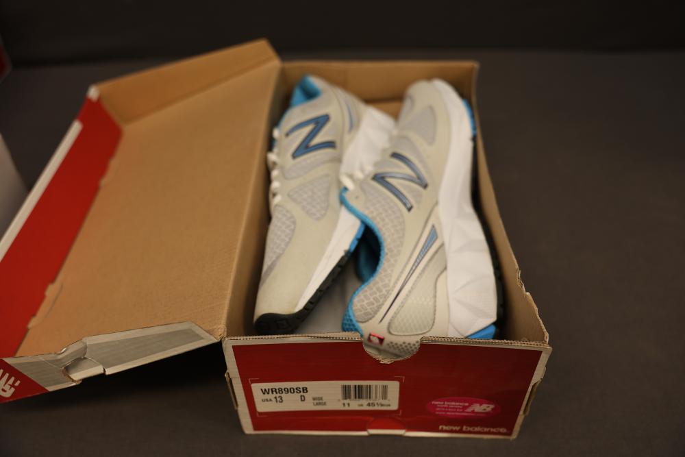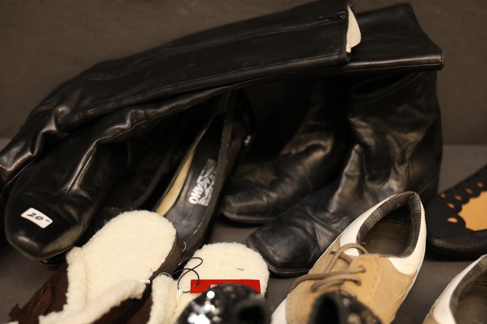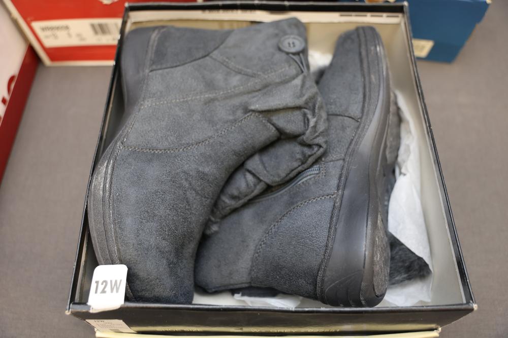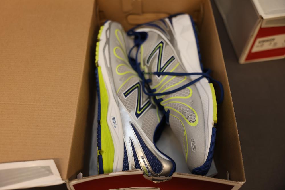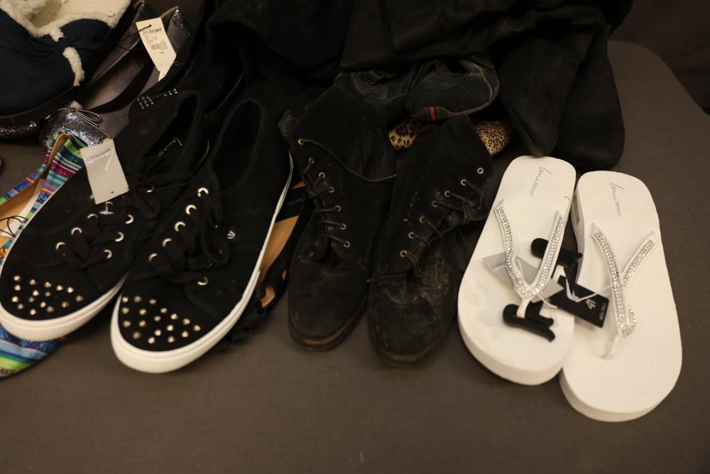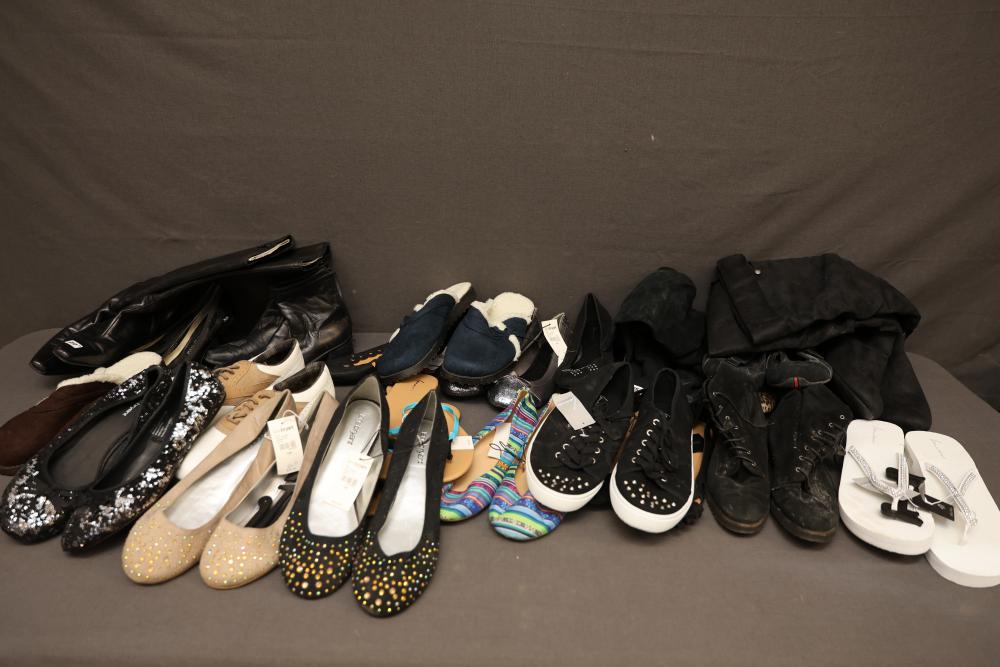 Women's and men's shoes, including New Balance running shoes (sizes 11.5 and 12 displayed), Easy Spirit slippers, Avenue boots, and a variety of other brands. Includes athletic shoes, flats, sandals, boots, and loafers. Pickup only.