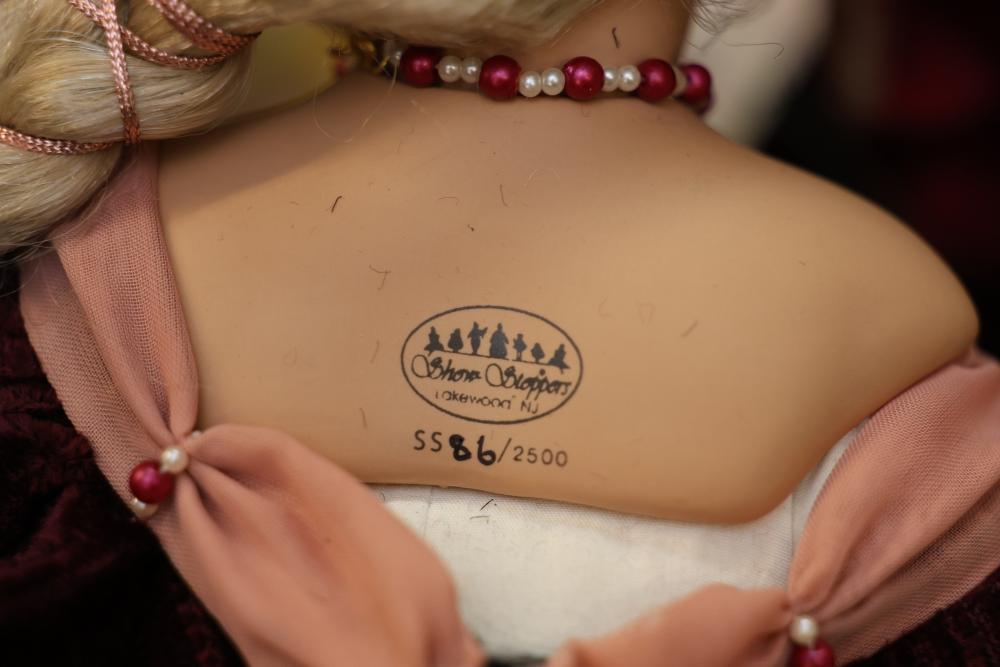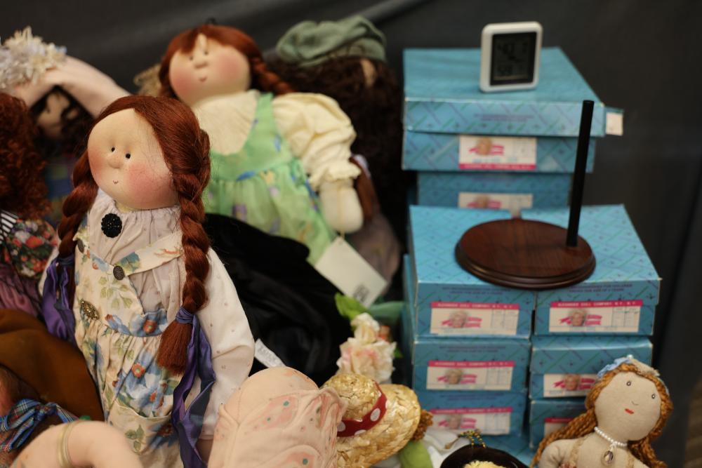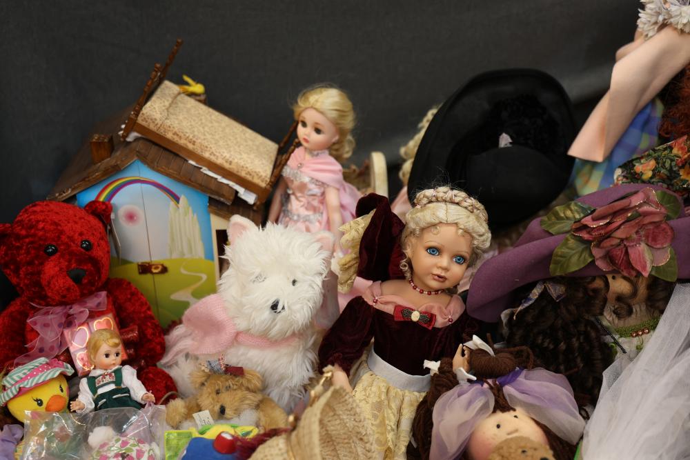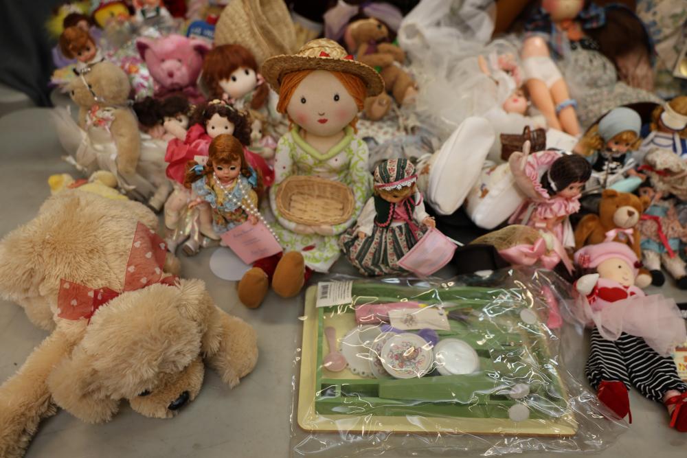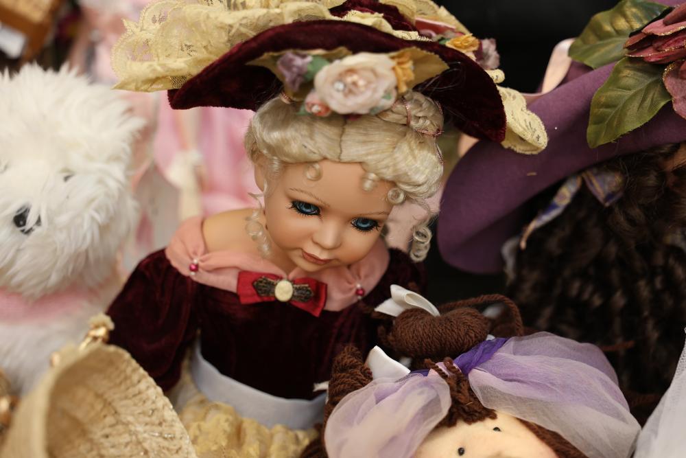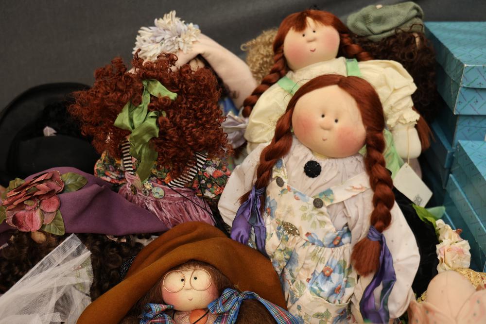 Dolls and plush toys with styles including porcelain collectible dolls, cloth dolls, teddy bears, and plush stuffed animals. Notable brands include "Christine Durand" limited-edition porcelain dolls. Includes multiple accessories such as hats and small decorative elements. Pickup only.
