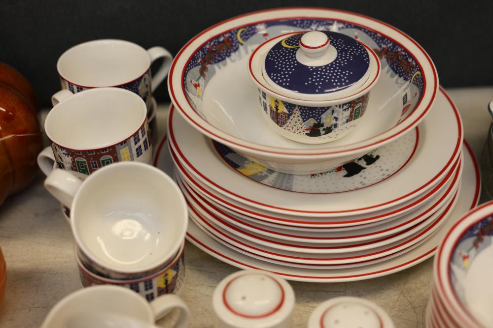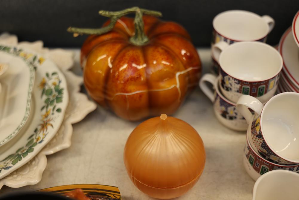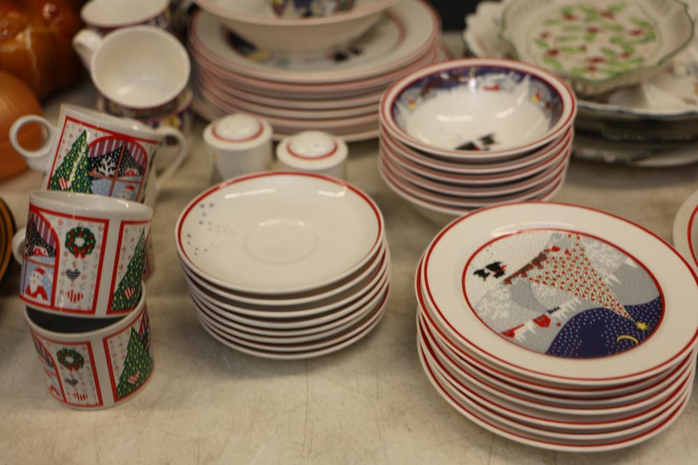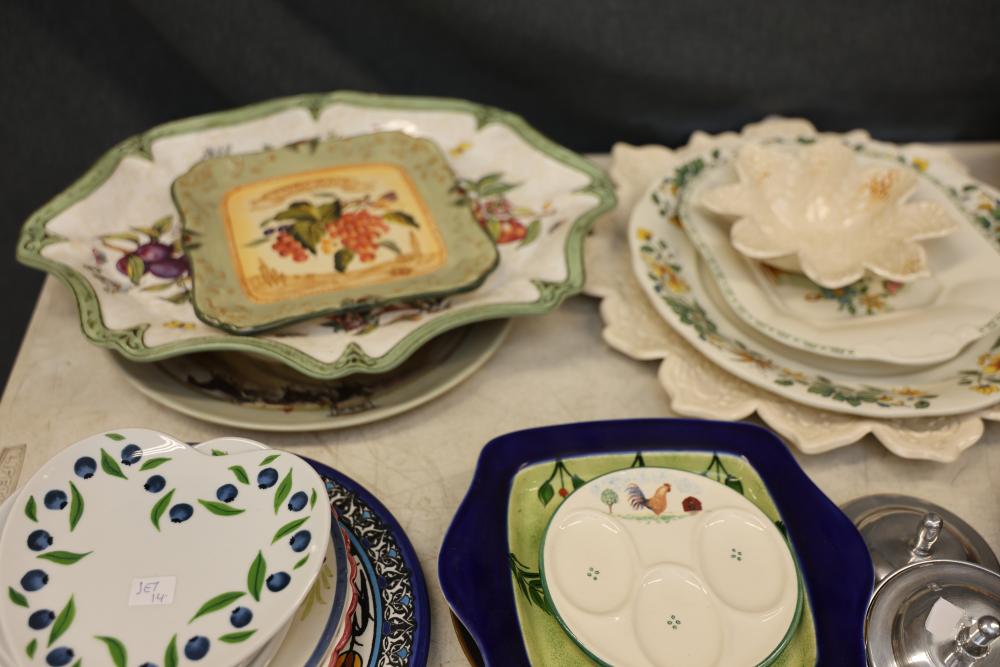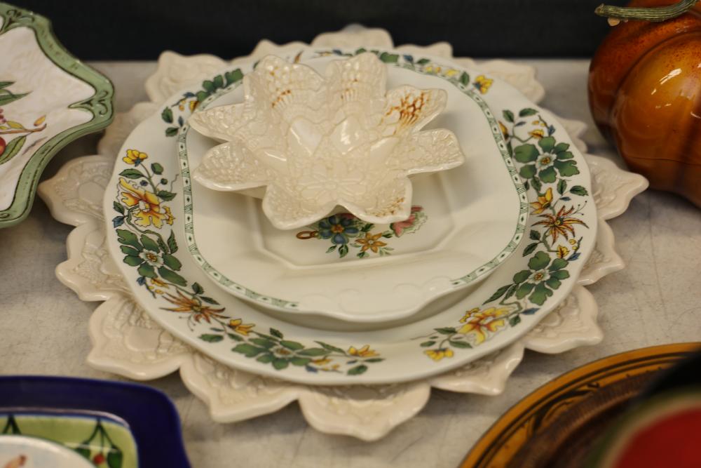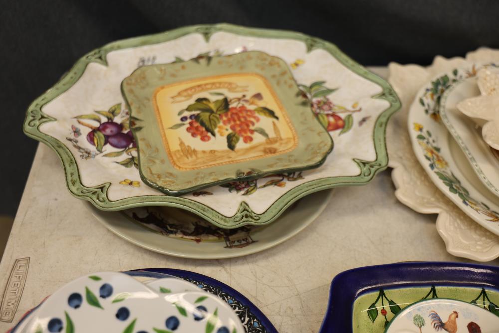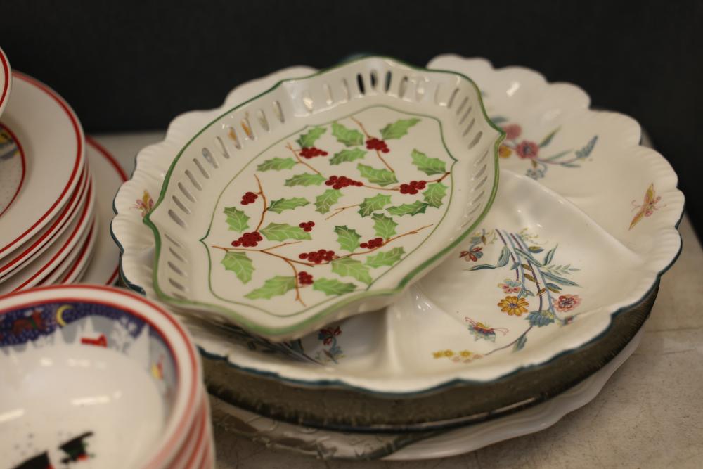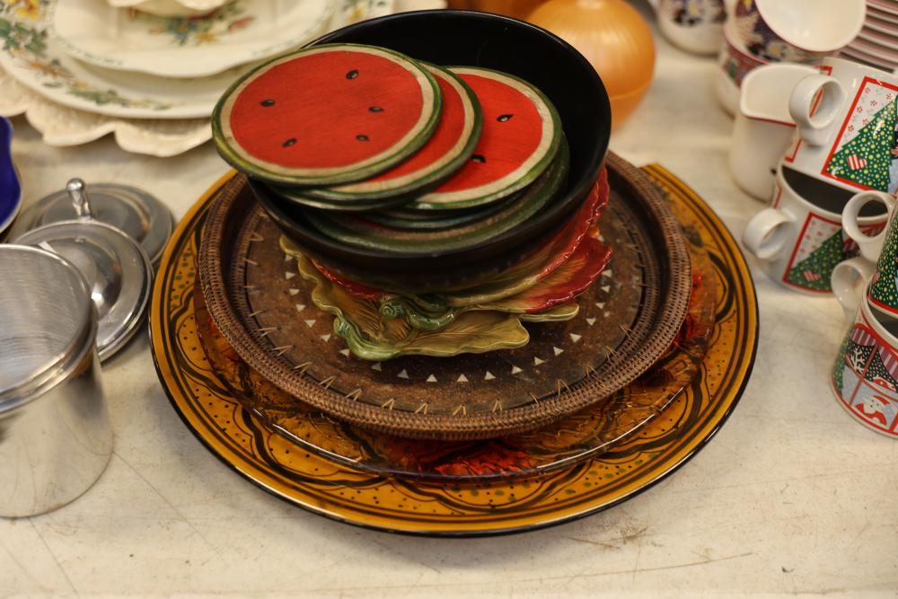 Ceramic Dishware, Holiday-Themed Plates, and Decorative Serveware. Includes a variety of ceramic and porcelain items such as watermelon-themed serving bowls, painted plates, Christmas-themed dishes, decorative trays with floral motifs, and unique serving pieces in shapes like pumpkins and onions. Holiday-themed patterns feature distinctive designs, and serving pieces highlight painted and embossed accents. Pickup only.