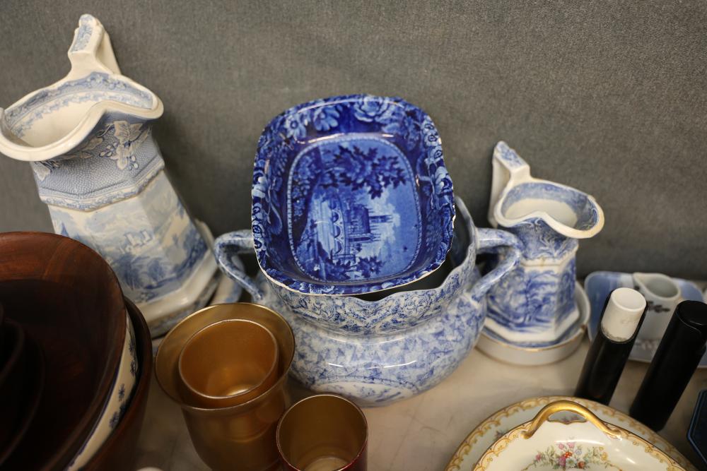 Tableware and Kitchenware Including Ceramic, Porcelain, and Glass Pieces. Includes an array of dinnerware, serveware, and drinkware such as cups, saucers, plates, serving platters, bowls, creamers, teapots, pitchers, and multi-section dishes. Notable pieces include blue and white ceramic items, floral-patterned porcelain items, and a range of glass and metal accents. Pickup only.