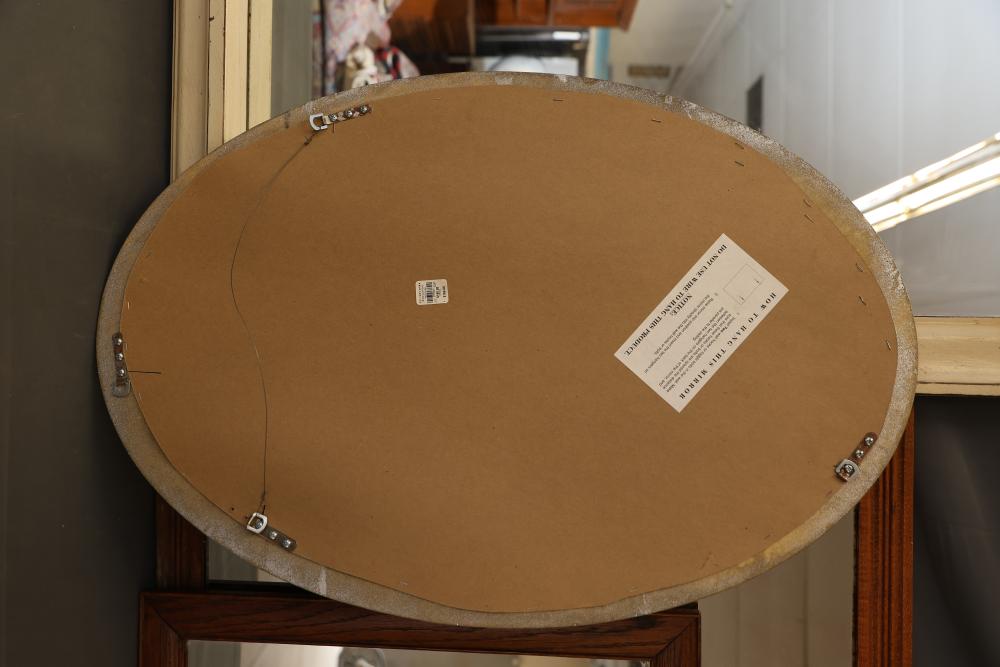 Four Framed Mirrors in Varied Styles. Includes a rectangular white-painted wood frame mirror, an oval silver-tone frame mirror, a rectangular oak frame mirror, and a square wood frame mirror. 38x28, 31x23, 23.5x19.5,31x21.5 Pickup only.
