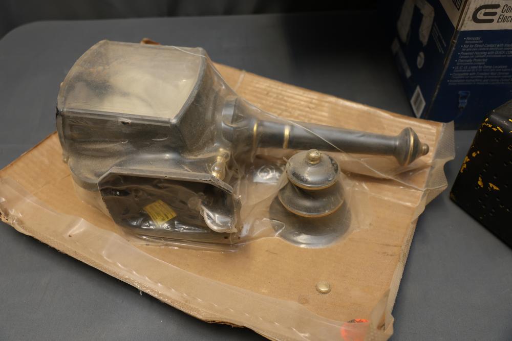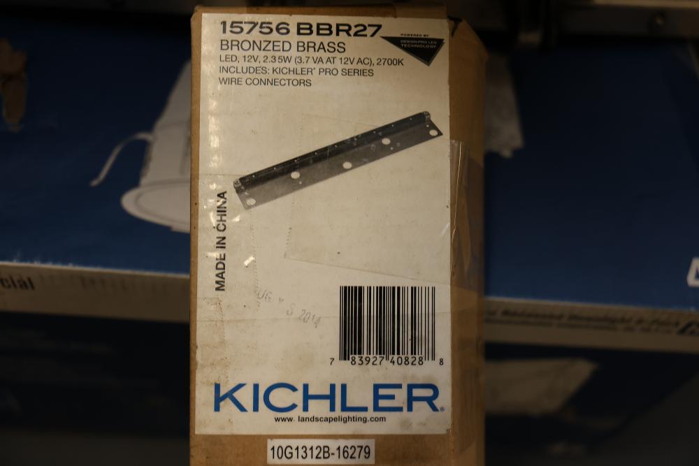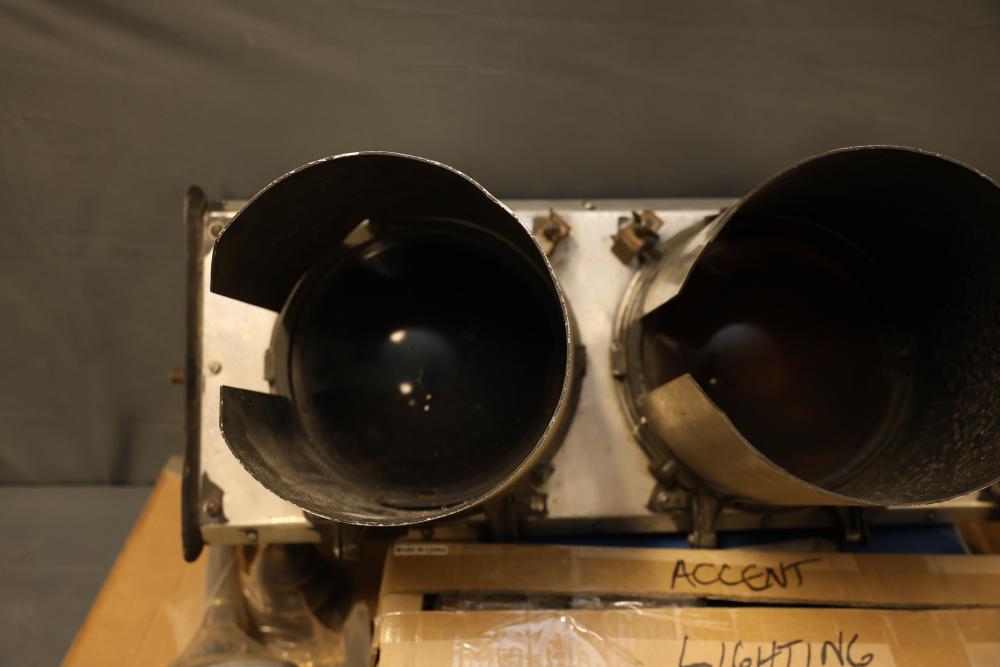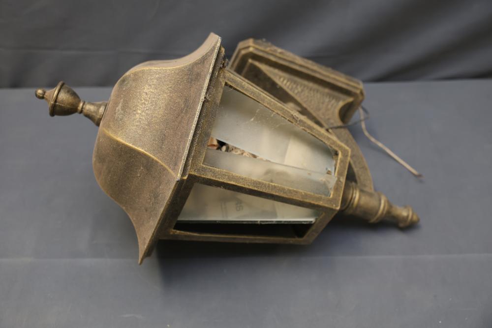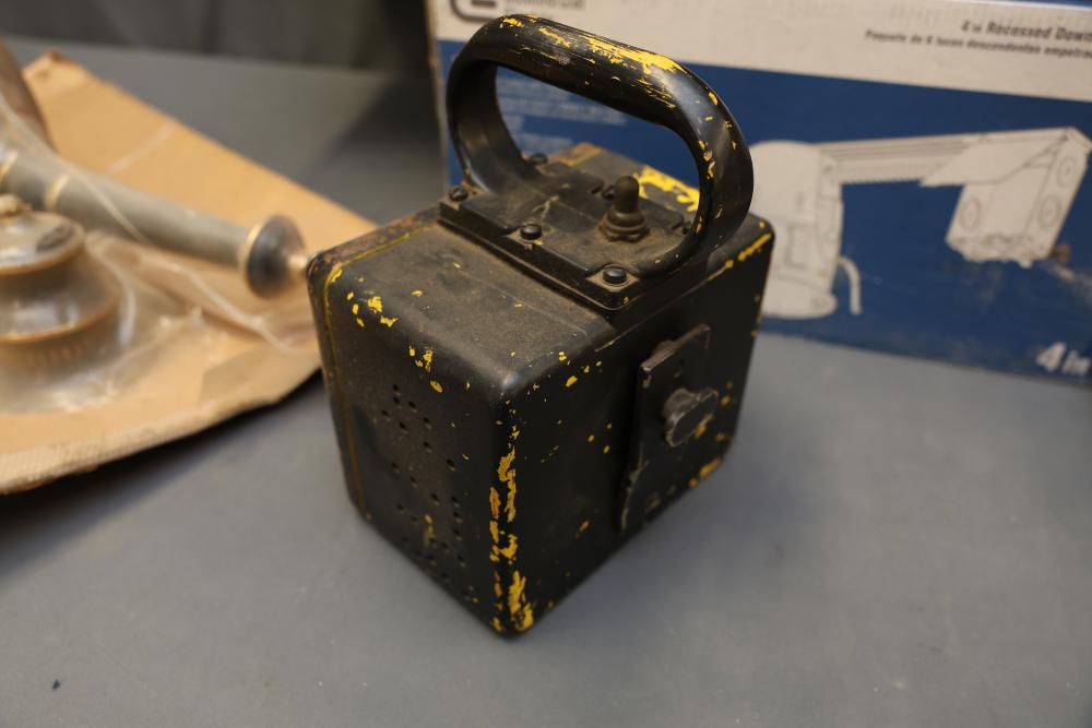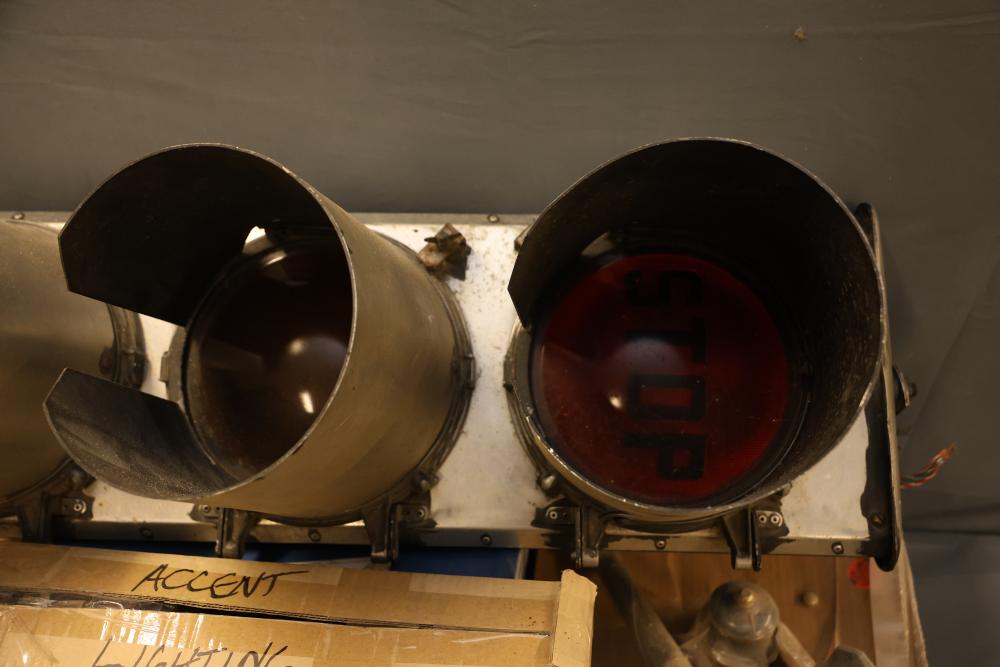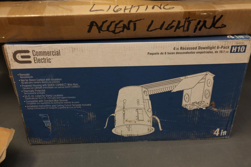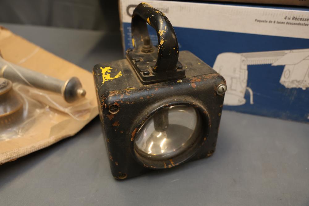 Traffic Light, Spotlight, Wall Lantern, Recessed Lighting, and Additional Electrical Components. Includes a traffic light unit with red lens, a metal spotlight with handle, a decorative brass-toned wall lantern, Commercial Electric 4-inch recessed downlight pack, and a Kichler recessed lighting accessory. Additional wiring and hardware items are also included. Functionality of traffic light is unknown. Pickup only.