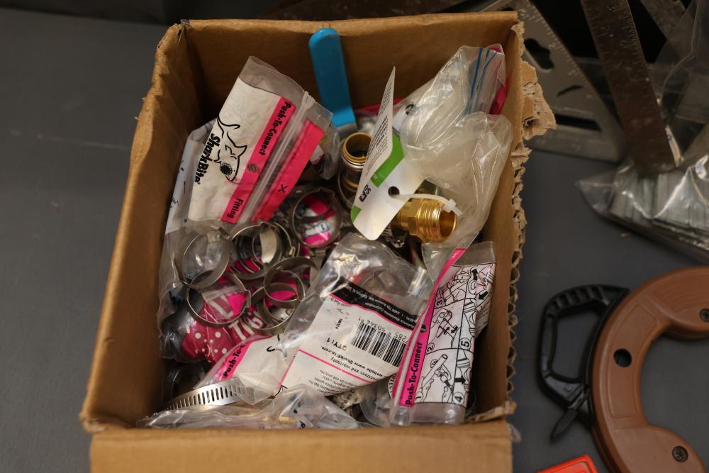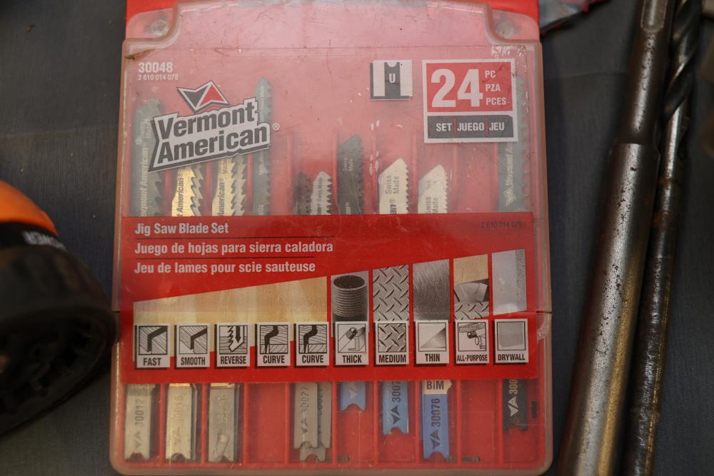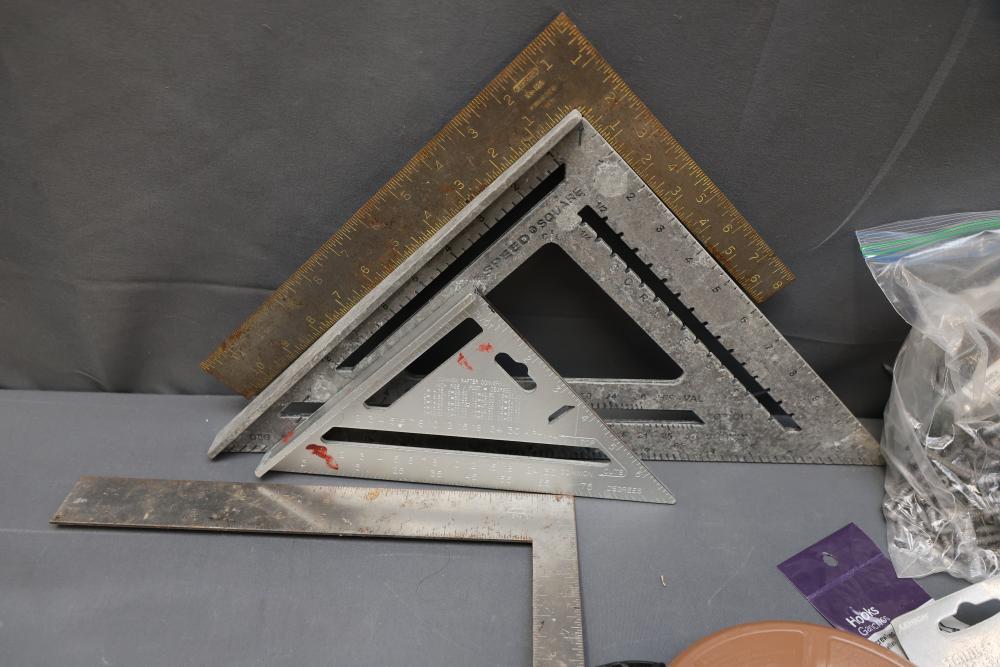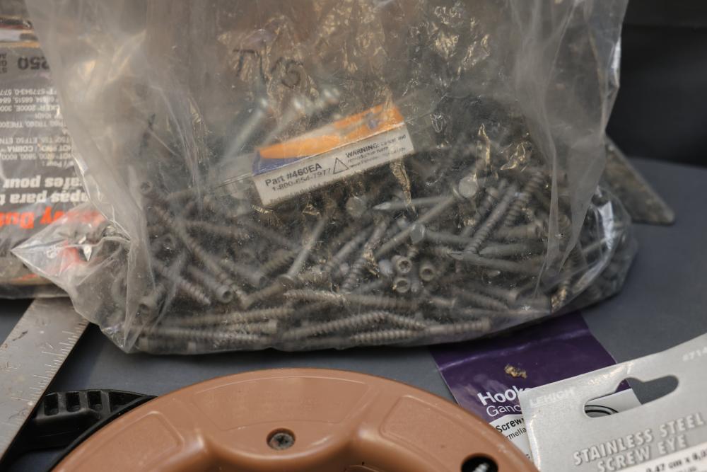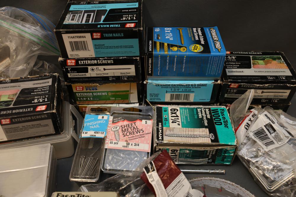 Hardware, Hand Tools, Saw Blades, Router Bit, and Screws. Includes Vermont American jigsaw blade set, Freud industrial router bit, multiple saw blades by Diablo, Irwin, and DeWalt, screwdrivers, drill bits, various hand tools, triangular rulers, and large quantities of screws and fasteners, including exterior screws by Grip Rite, trim nails, and sheet metal screws. Also includes a variety of plumbing fittings, hose clamps, and fasteners. Pickup only.