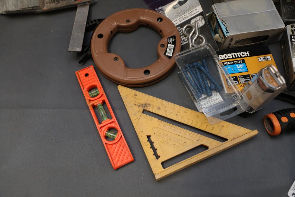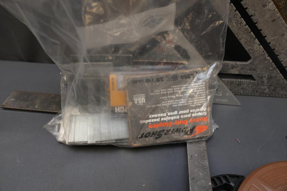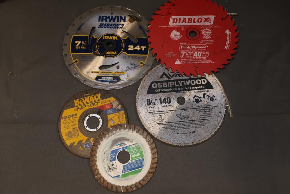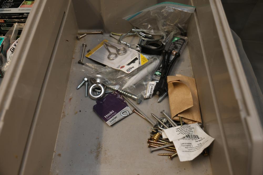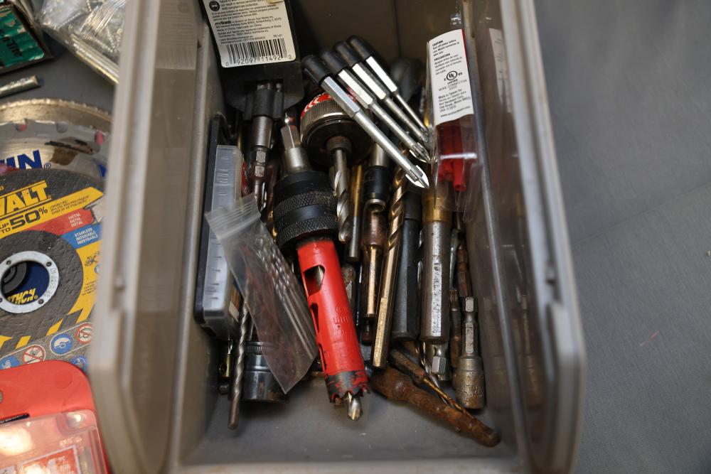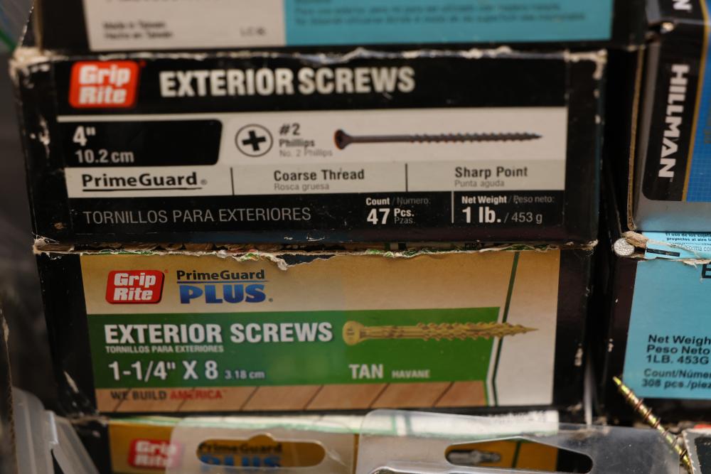 Hardware, Hand Tools, Saw Blades, Router Bit, and Screws. Includes Vermont American jigsaw blade set, Freud industrial router bit, multiple saw blades by Diablo, Irwin, and DeWalt, screwdrivers, drill bits, various hand tools, triangular rulers, and large quantities of screws and fasteners, including exterior screws by Grip Rite, trim nails, and sheet metal screws. Also includes a variety of plumbing fittings, hose clamps, and fasteners. Pickup only.