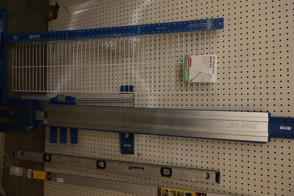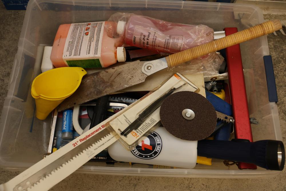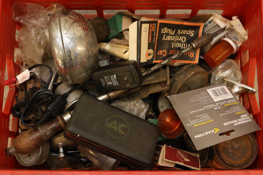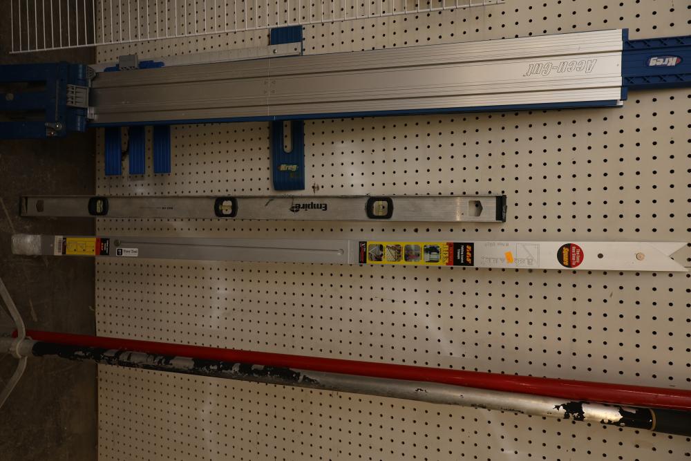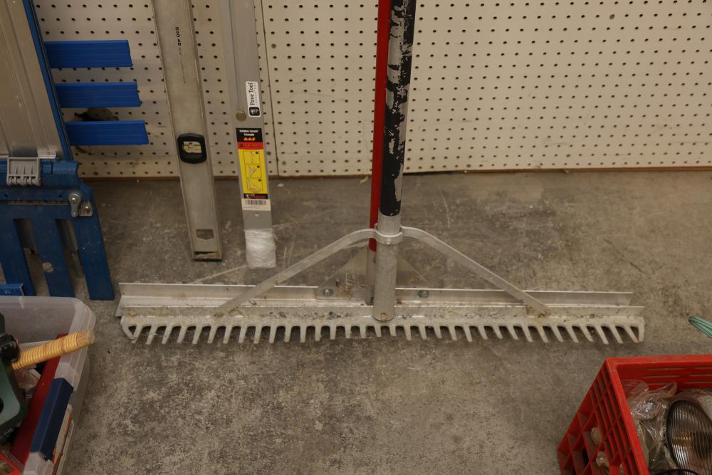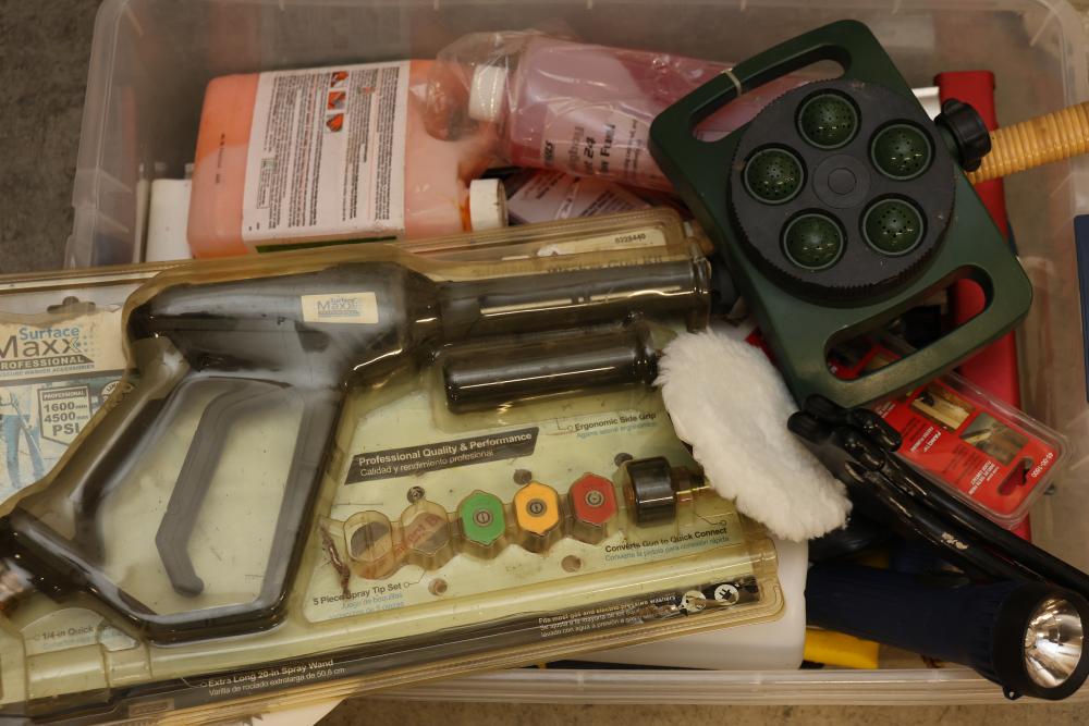 Tools and accessories including levels, an aluminum landscape rake, tool storage items, a spray gun attachment with connectors, coolant concentrate, a handsaw, grinding wheel, spark plugs, electrical components, and lubrication products. Bins not included. Pickup only.