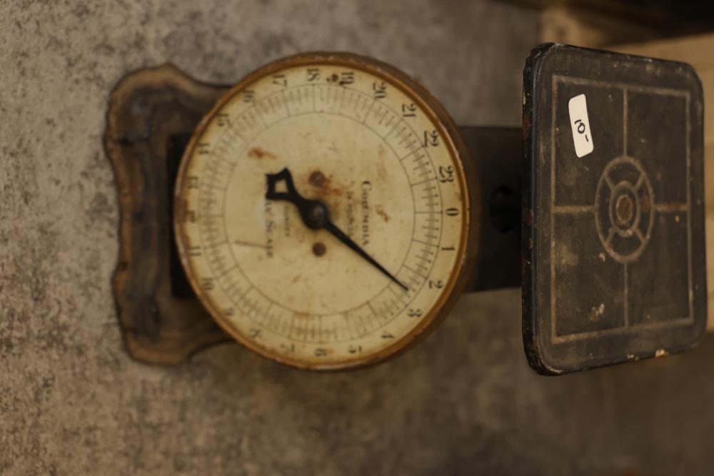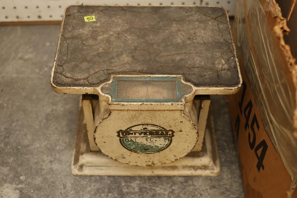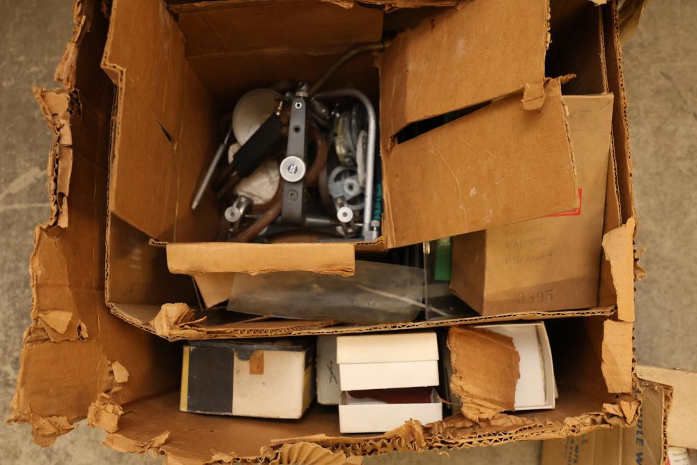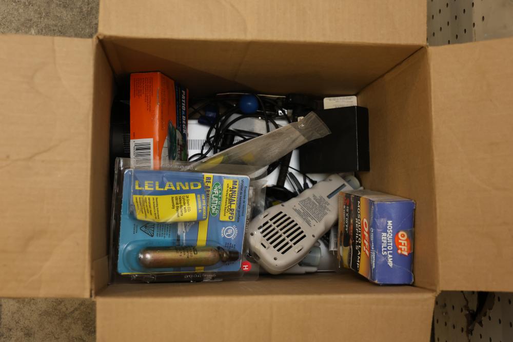Scales, Tools, and Accessories. Includes multiple boxes containing various tools, accessories, and household items. Items include vintage scales, air cartridges, small electronics, and assorted components. Pickup only.