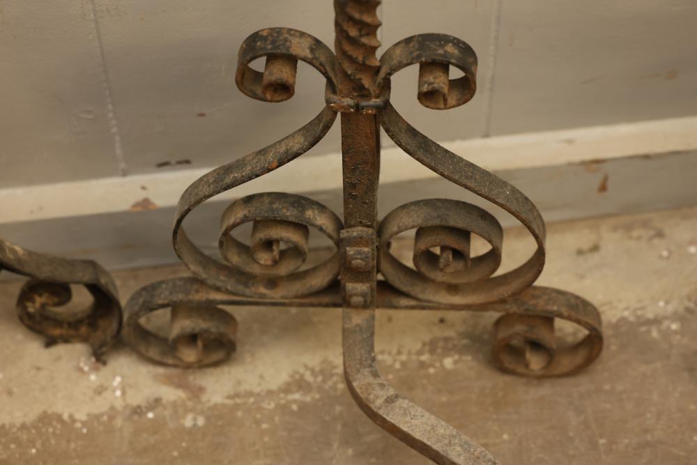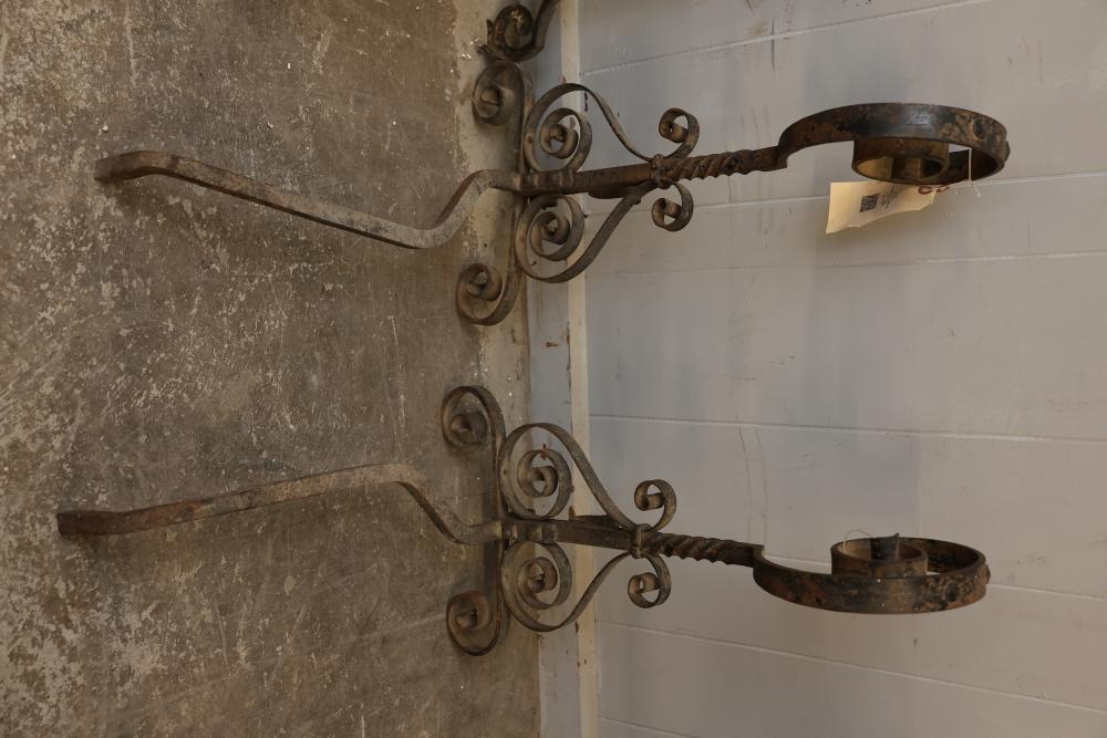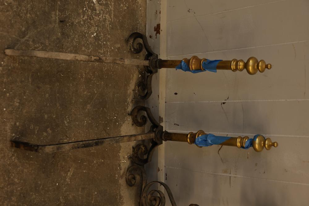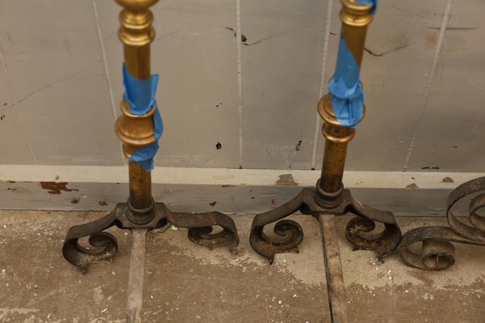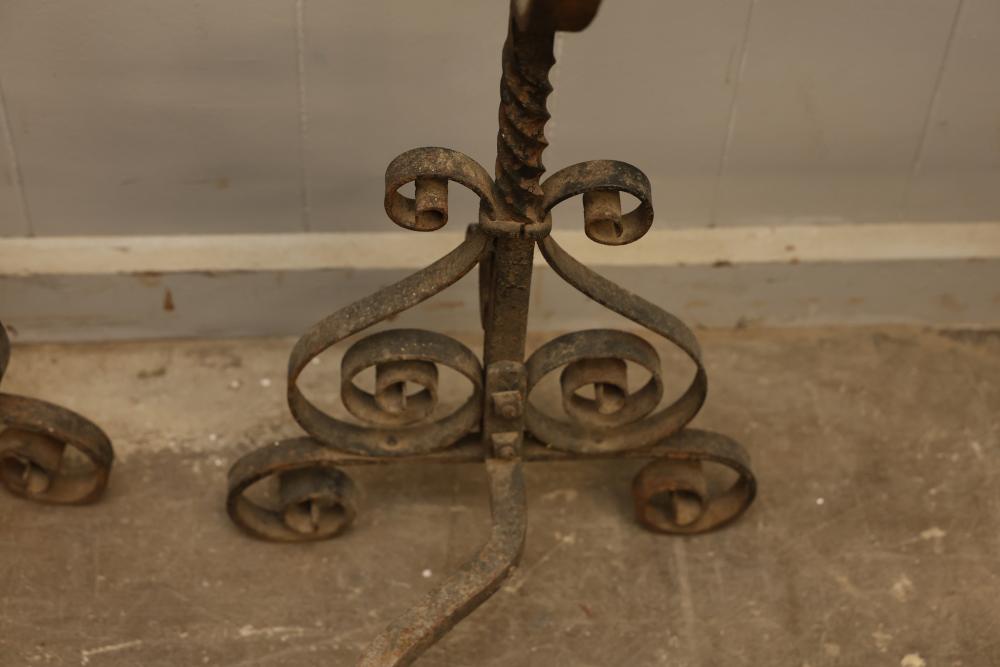 Wrought iron andirons with scrolled detailing and brass-topped posts. The iron sections feature twisted and scrolled designs, supporting curved log rests. Brass elements show decorative turned details. Pickup only.