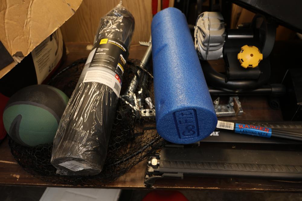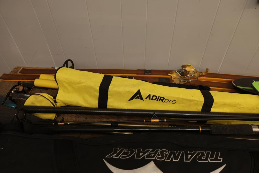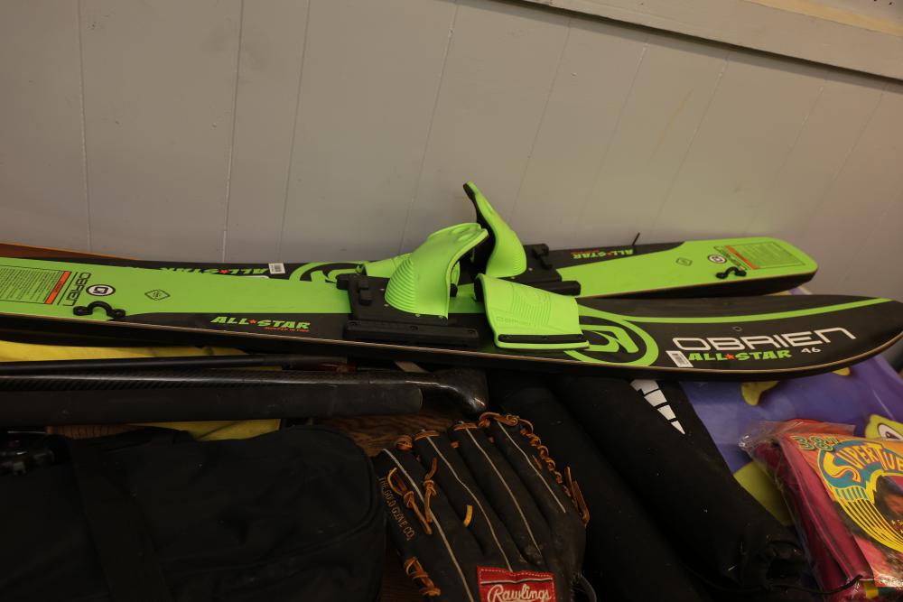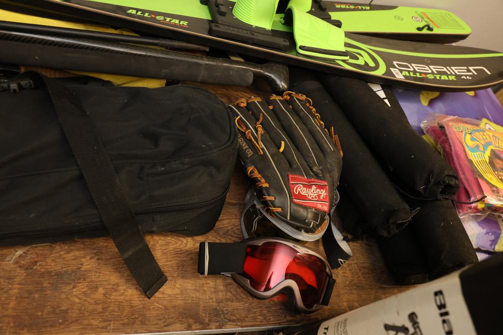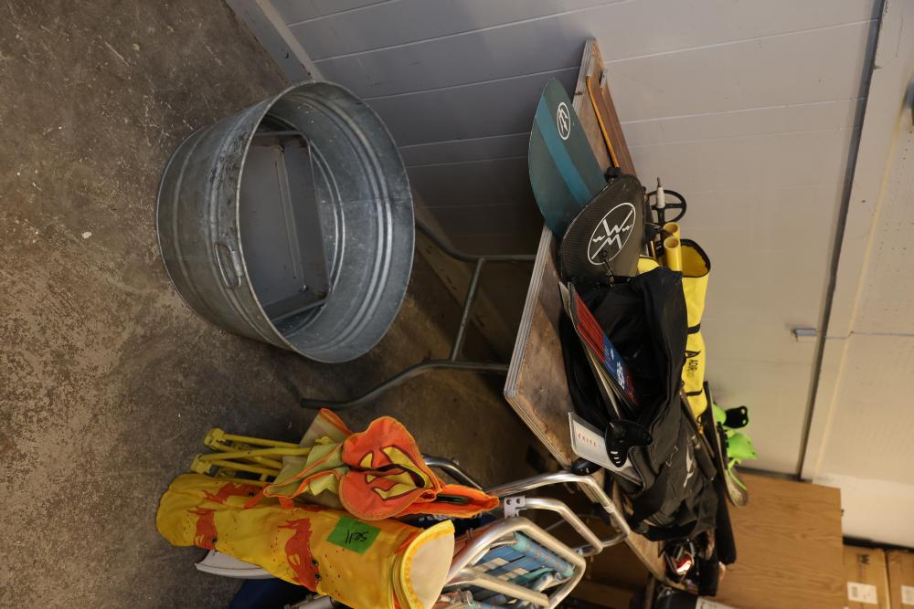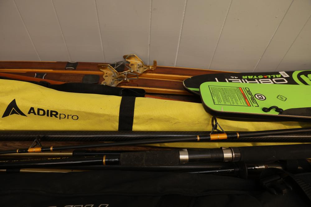 Outdoor and sporting equipment including folding chairs, inflatable floatation devices, O'Brien Elite Star water skis, Adirondack-style fishing rods in a carrying case, a Rawlings baseball glove, a pair of goggles, multiple dumbbells, a foam roller, a cooler, a red fuel container, packaged items, and other related accessories. Pickup only.