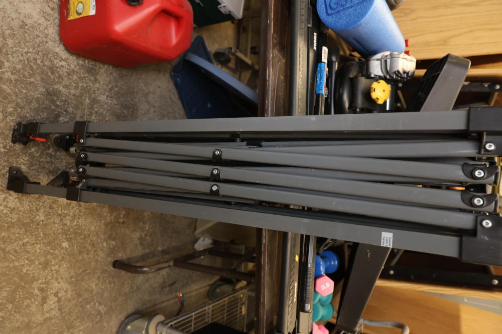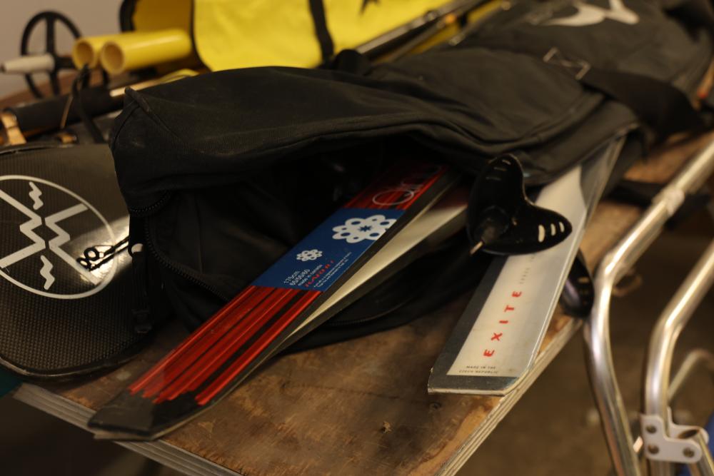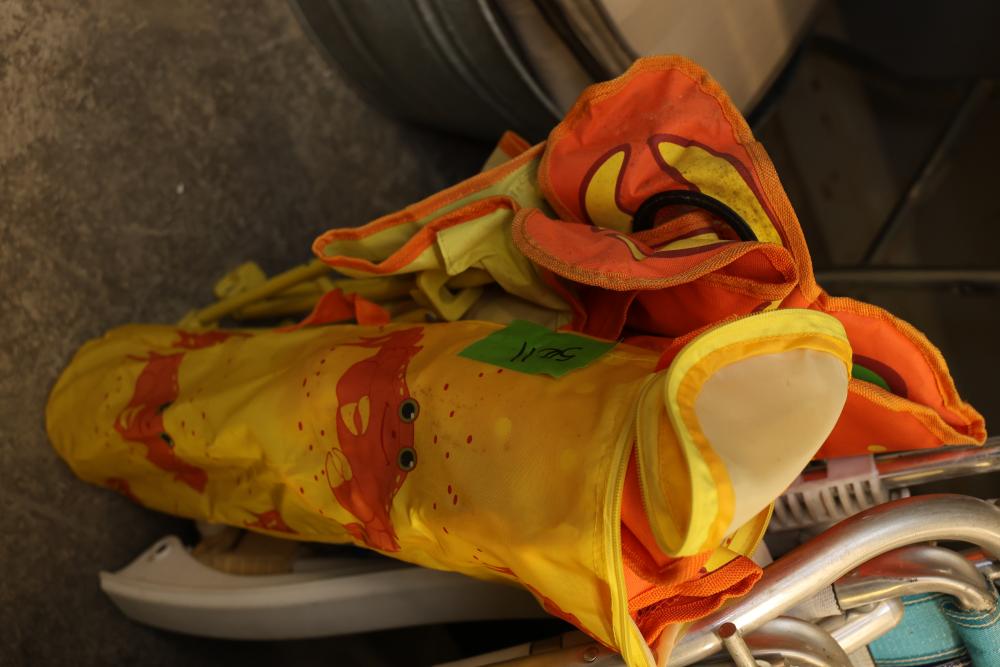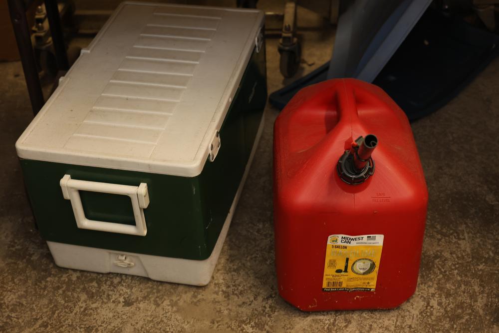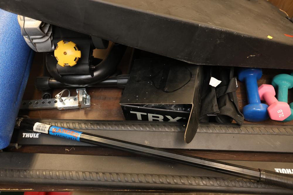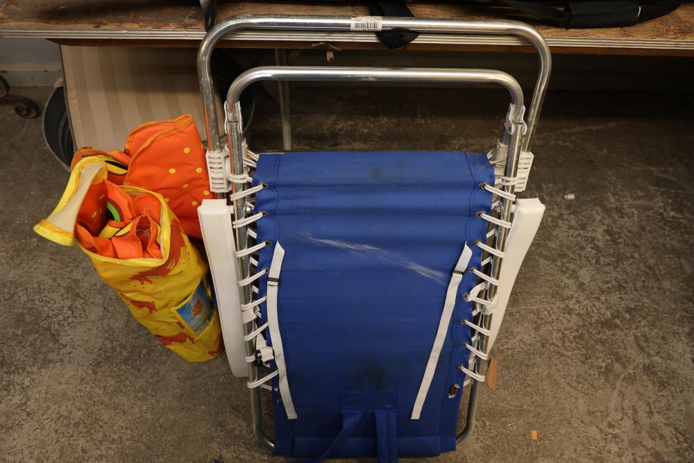 Outdoor and sporting equipment including folding chairs, inflatable floatation devices, O'Brien Elite Star water skis, Adirondack-style fishing rods in a carrying case, a Rawlings baseball glove, a pair of goggles, multiple dumbbells, a foam roller, a cooler, a red fuel container, packaged items, and other related accessories. Pickup only.