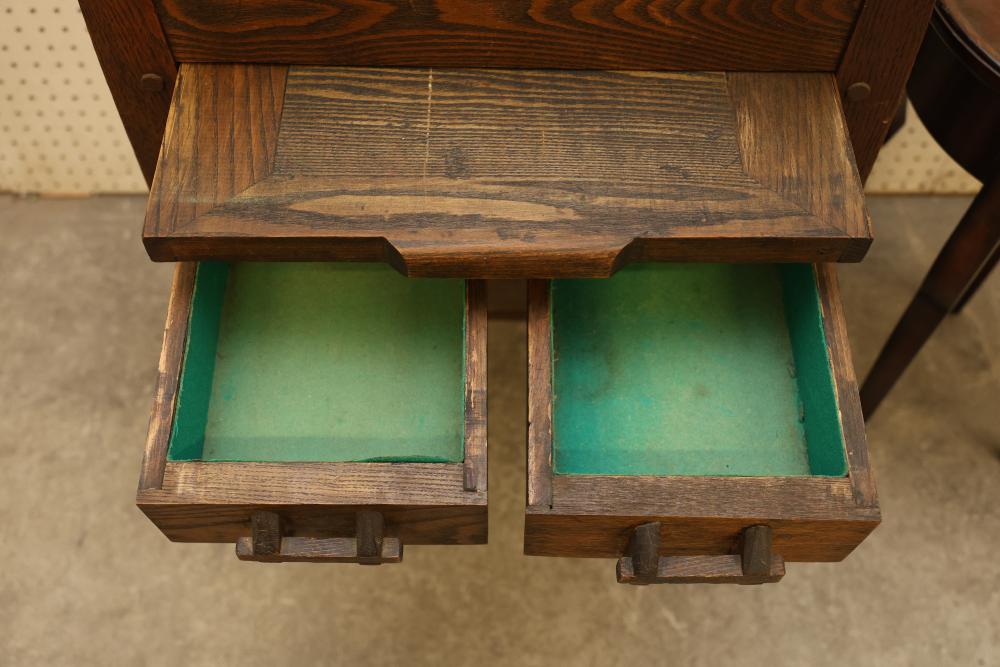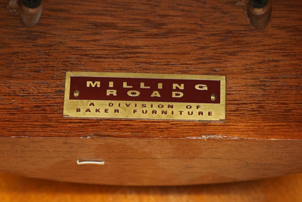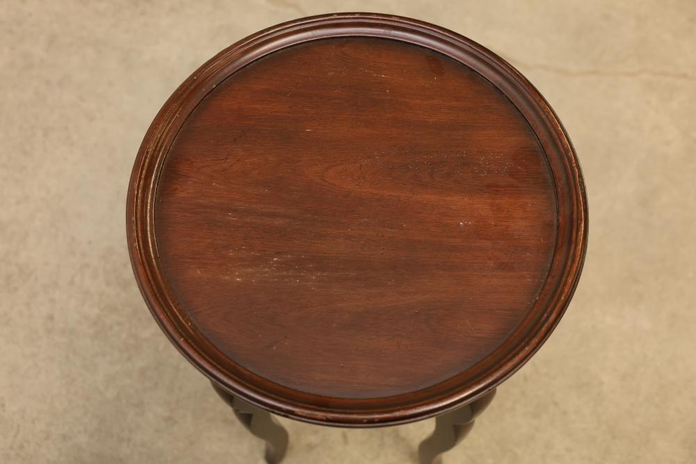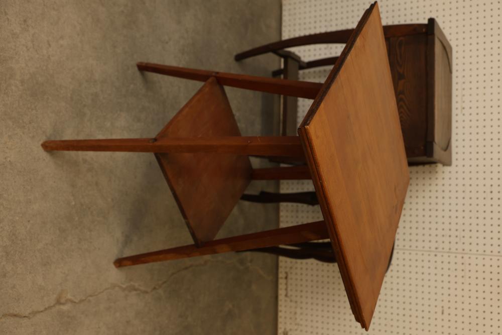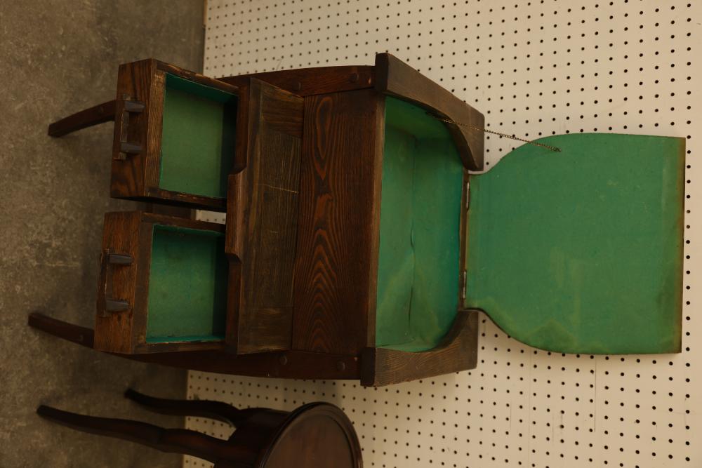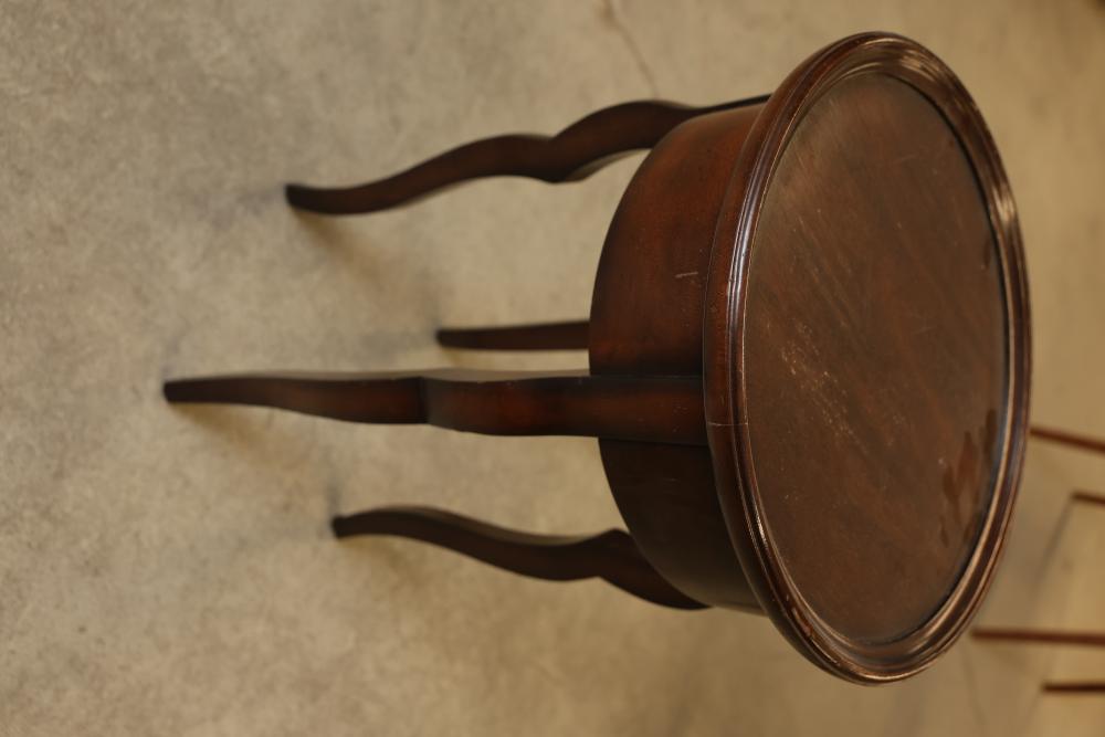 Square wooden table, hideaway sewing table, and round Milling Road side table. Square table measures 21.5inWx21.5inDx29.5inH. Hideaway table includes a flip-top compartment and two green-lined drawers, measuring 18.5inWx15inDx30.5inH. Milling Road side table by Baker Furniture features a round top and cabriole legs, measuring 14inD x 23inH. Pickup only.