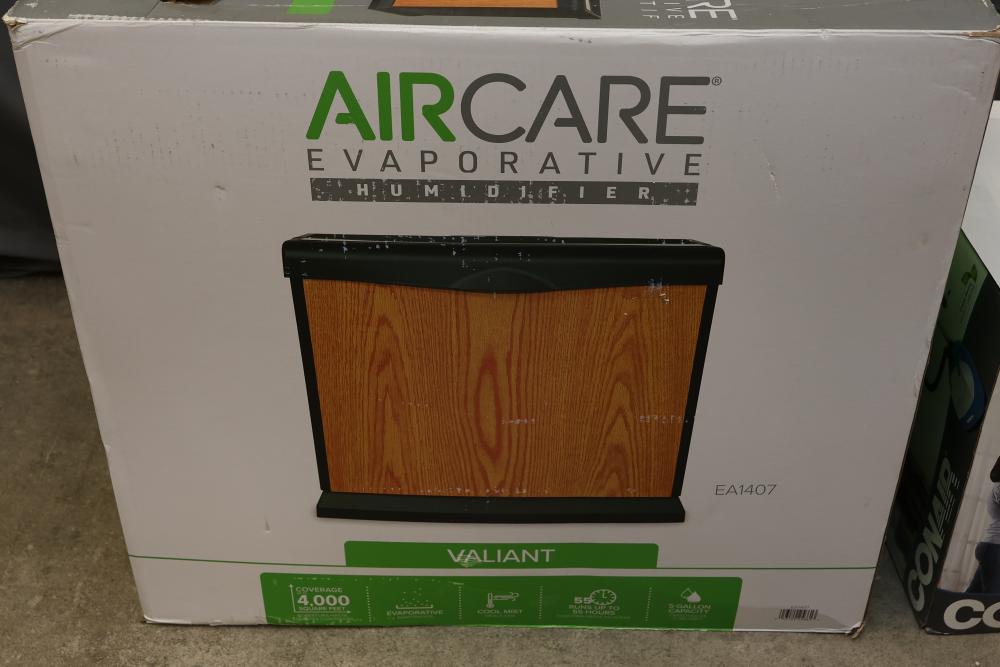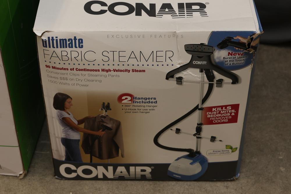 Conair Ultimate Fabric Steamer includes a high-velocity steam unit, flexible hose, and two hangers. The AirCare Evaporative Humidifier features a 4,000 sq. ft. capacity with a wooden panel design, plastic components, and a control panel. Includes a garment rack with adjustable height and rolling base. Pickup only.