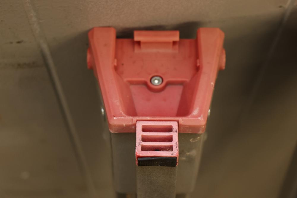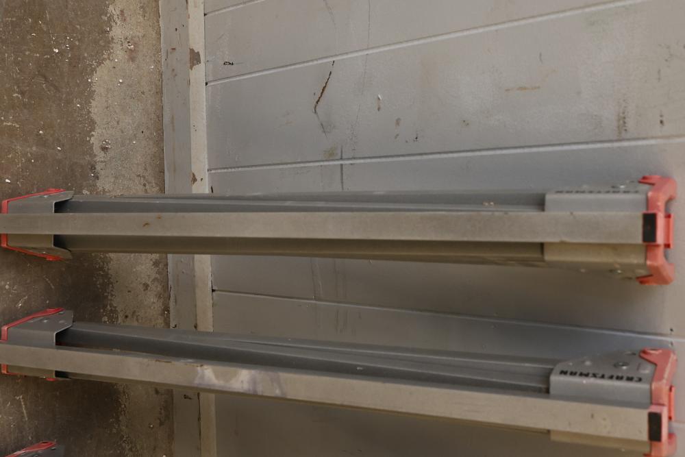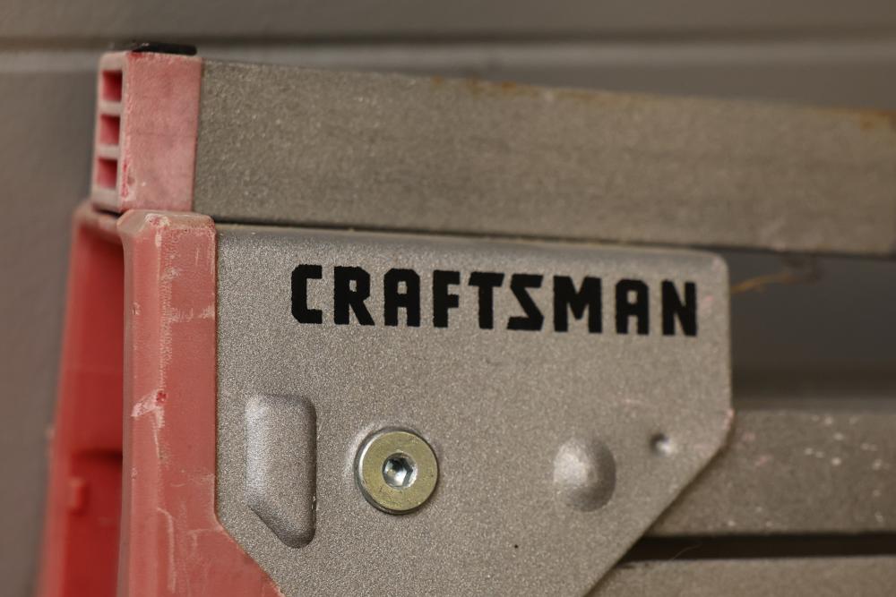 Four Craftsman Adjustable Metal Sawhorse Legs with Red Plastic Supports. Each leg features a craftsman brand marking, metal adjustable structure, and a red plastic gripping mechanism for secure installation. Designed for use in construction, woodworking, or general support functions. Pickup only.